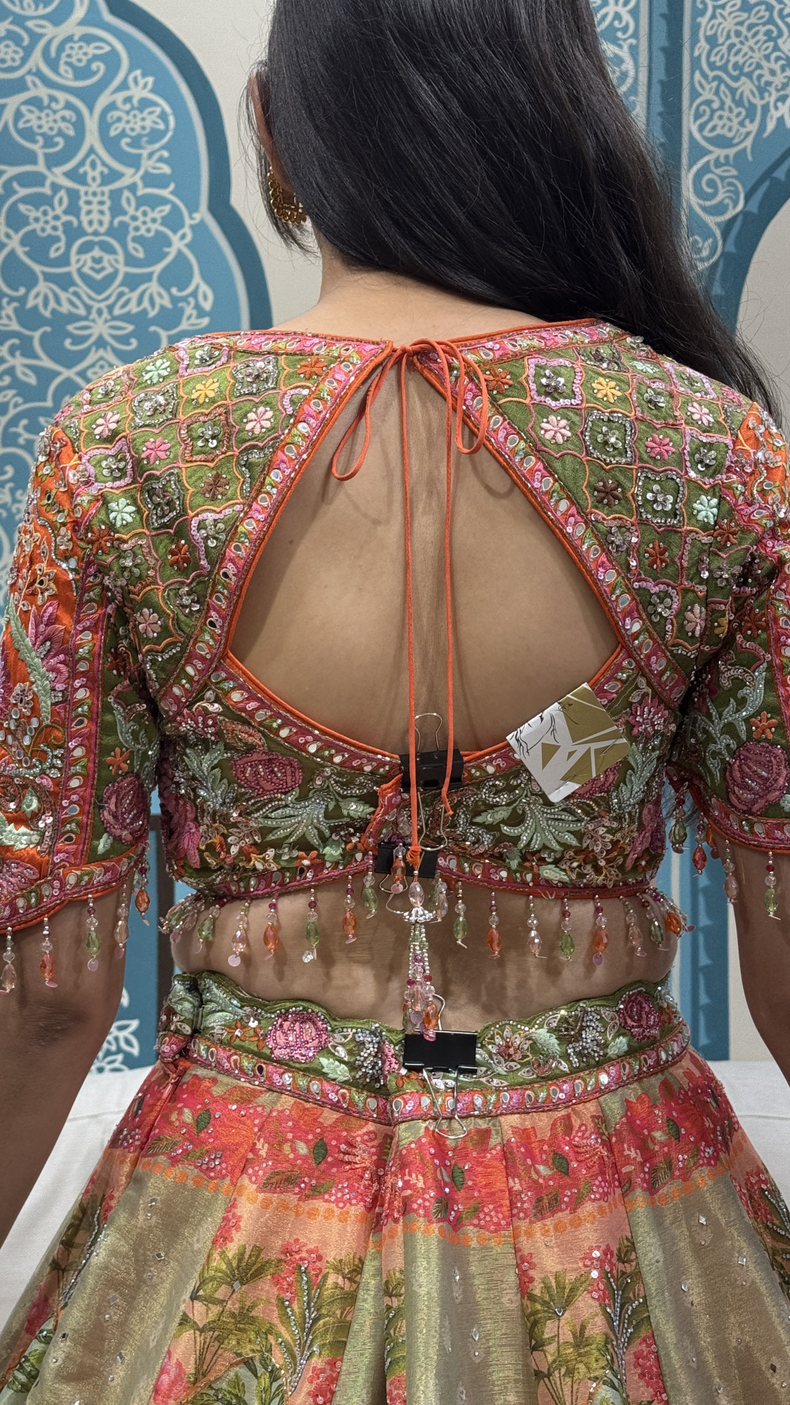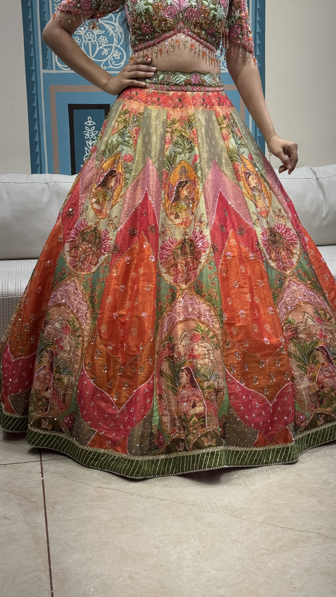 This exquisite lehenga set is a celebration of colour and craftsmanship. The flared skirt showcases detailed narrative-style prints and embroidery inspired by traditional Indian art, highlighted with floral patterns, subtle shimmer accents, and a beautifully balanced palette of coral, green, gold, and blush tones. The matching blouse is richly embroidered with floral motifs and finished with delicate bead tassels along the hem, adding graceful movement. Perfect for festive gatherings, mehendi functions, and cultural celebrations, this lehenga is designed for those who love bold artistry with timeless elegance.