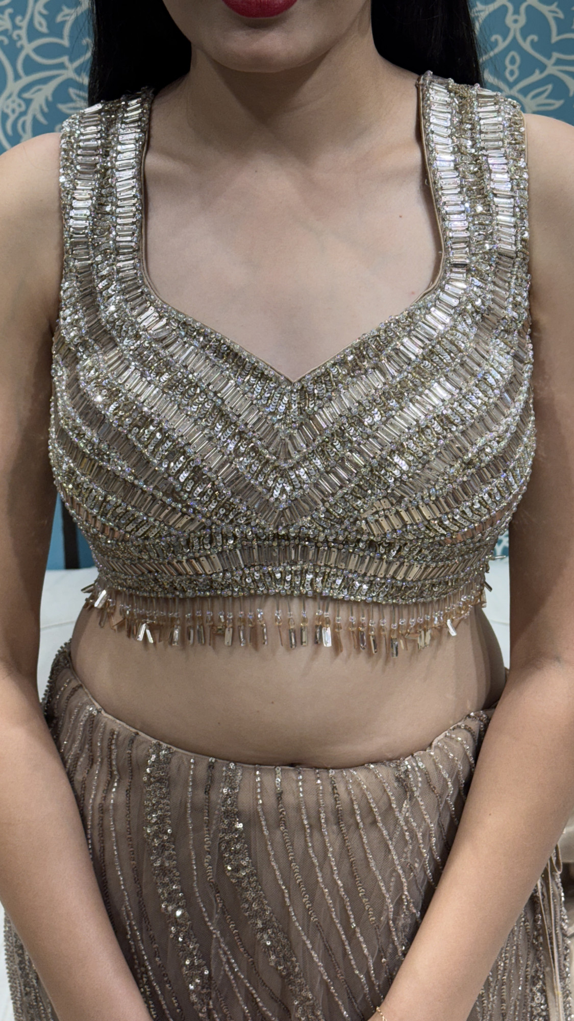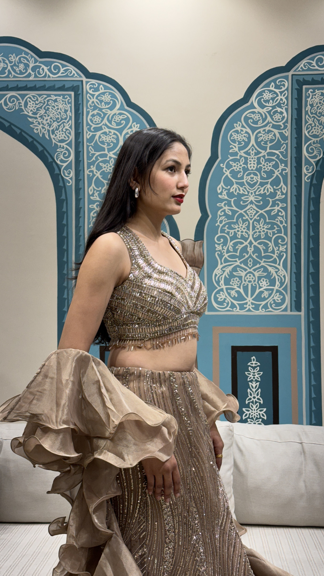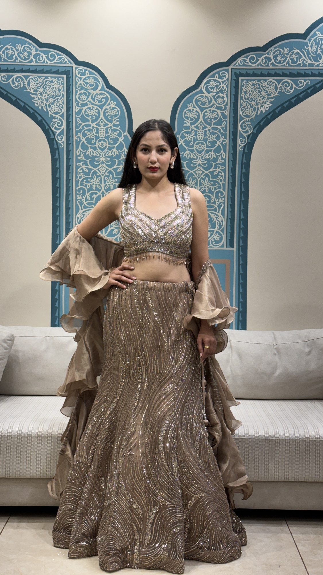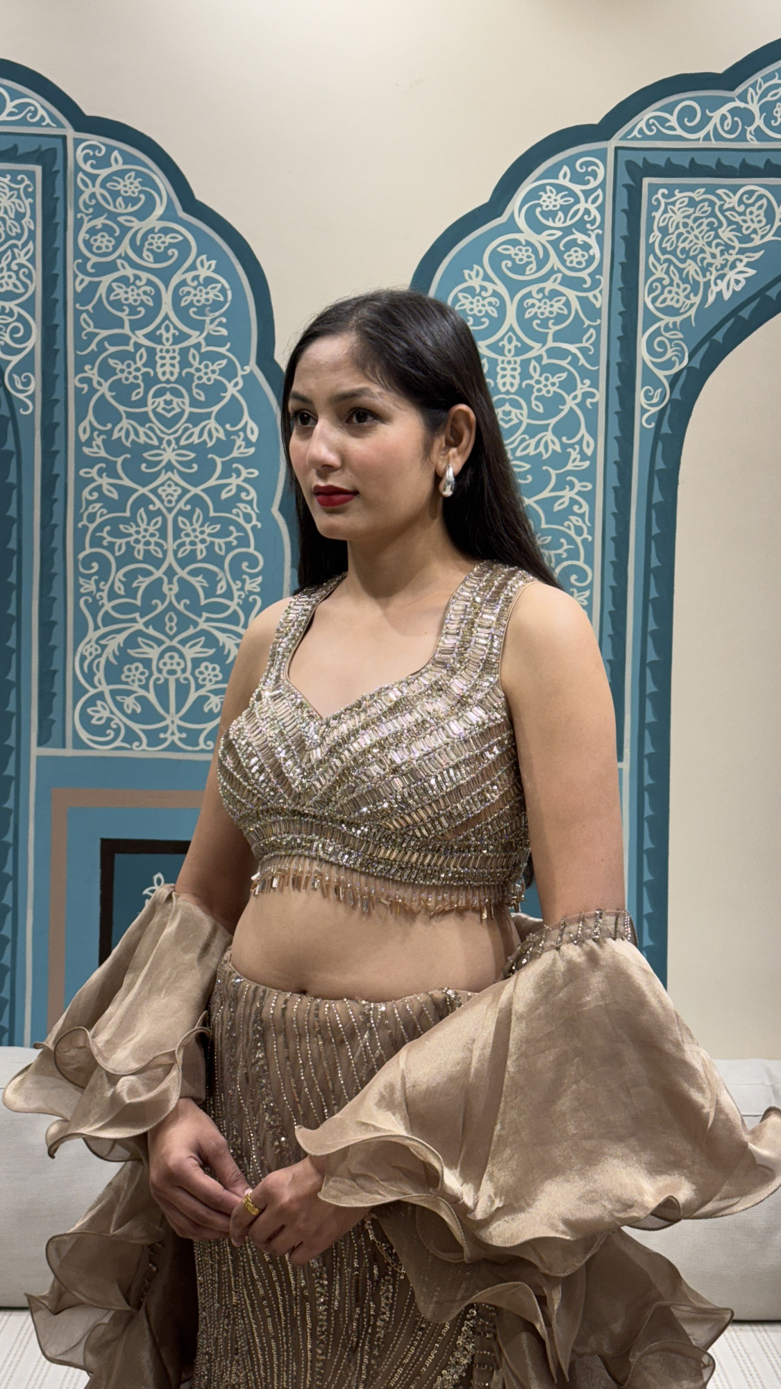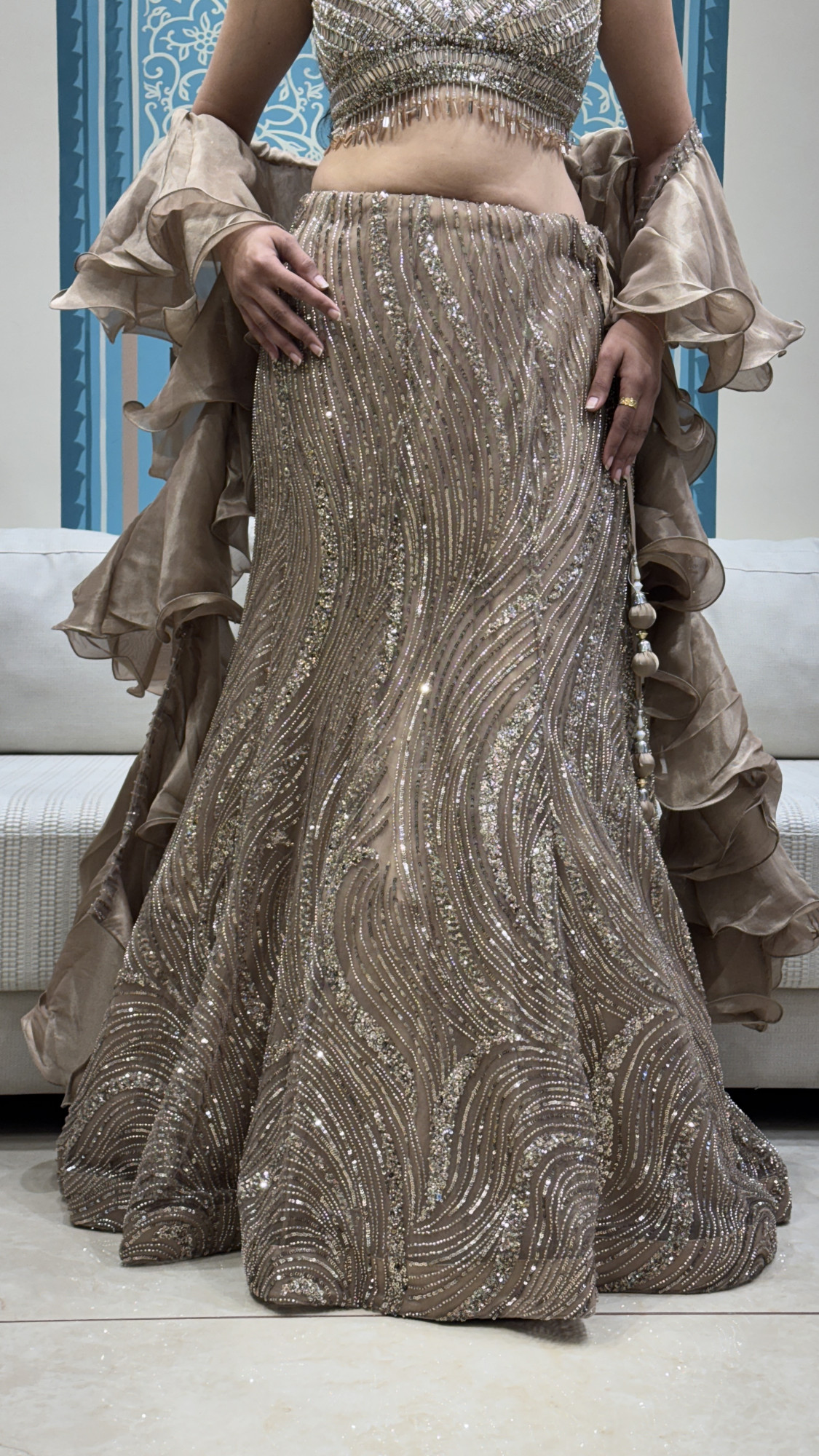 This glamorous lehenga features a champagne-gold base with intricate wavy sequin and bead embroidery that creates a rich, shimmering flow from waist to hem. The blouse is heavily hand-embellished with structured detailing and a delicate fringe finish that adds movement and sparkle. The look is elevated with statement ruffled organza sleeves that bring a trendy, high-fashion touch. Finished with tassel ties at the back, this ensemble is a stunning choice for bridesmaids, wedding guests, and festive evening celebrations.