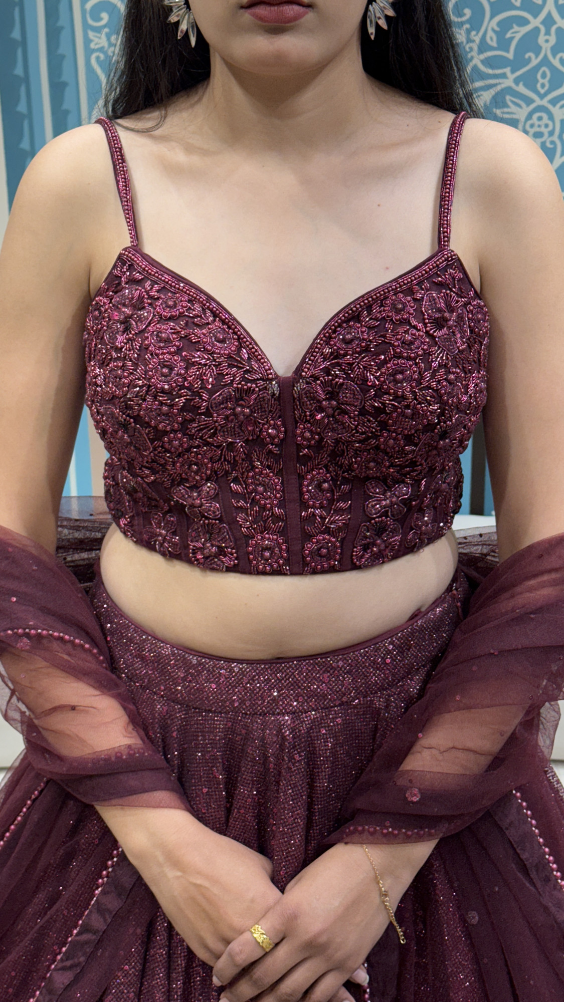 This wine-maroon lehenga set is made for all the spotlight moments. The corset-style bustier blouse features rich floral embroidery with bead and sequin detailing, giving a structured, modern fit with a glamorous sweetheart neckline and delicate straps. Paired with a full, glitter-finish lehenga skirt that sparkles beautifully, the silhouette looks elegant yet bold. The sheer net dupatta in matching maroon adds a soft, dreamy touch with subtle embellishments and a neat border, completing the look effortlessly. Ideal for receptions, cocktail events, sangeet nights, and festive celebrations where you want a luxe, party-ready vibe.