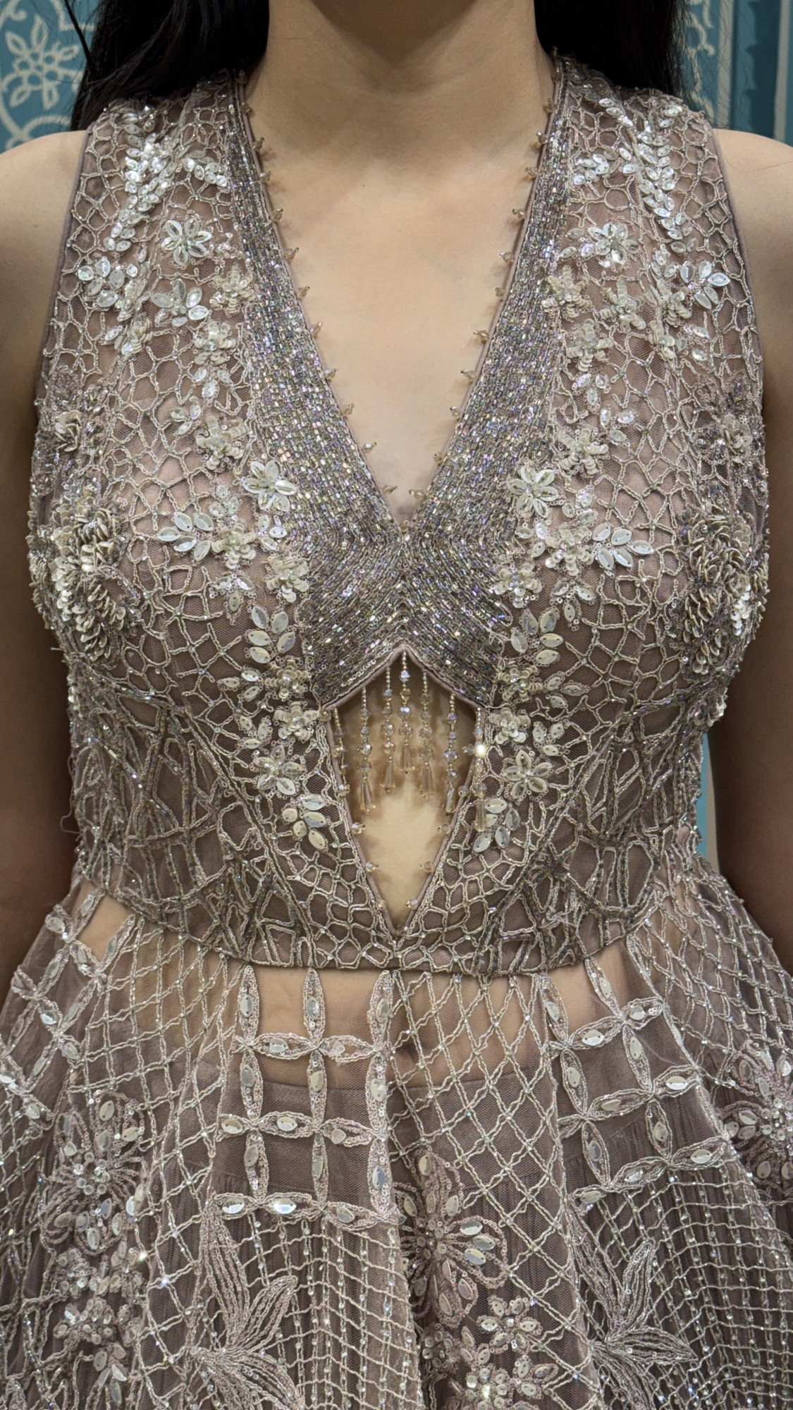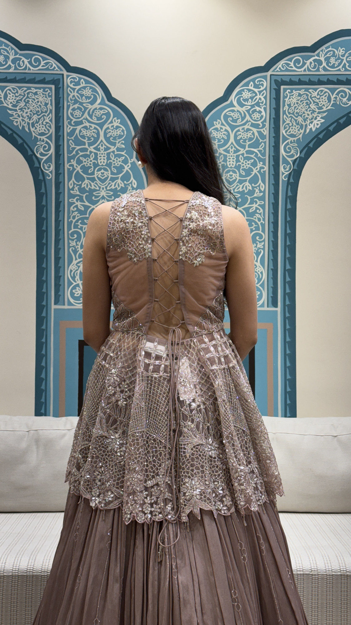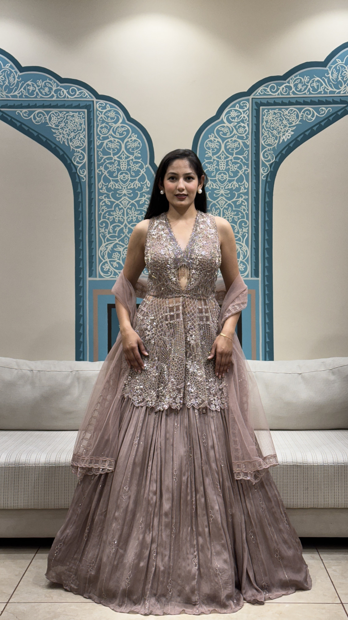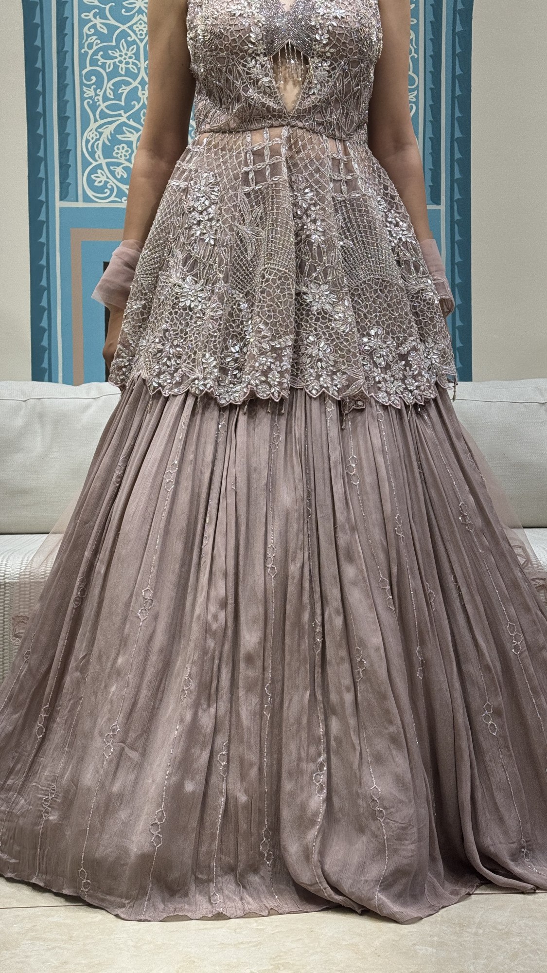 This dreamy mauve-grey lehenga set is the perfect blend of elegance and sparkle. The blouse comes with a flattering deep V-neckline and a stylish front cut-detail, richly decorated with intricate sequin, mirror, and thread embroidery that gives a luxurious shine from every angle. The highlight is the stunning lace-up back, adding a bold yet classy statement. The lehenga skirt flows beautifully with soft pleats and subtle shimmer detailing, giving it a graceful and royal fall. Styled with a delicate net dupatta, this outfit is ideal for cocktail nights, engagement functions, sangeet, reception looks, or any celebration where you want to stand out effortlessly.