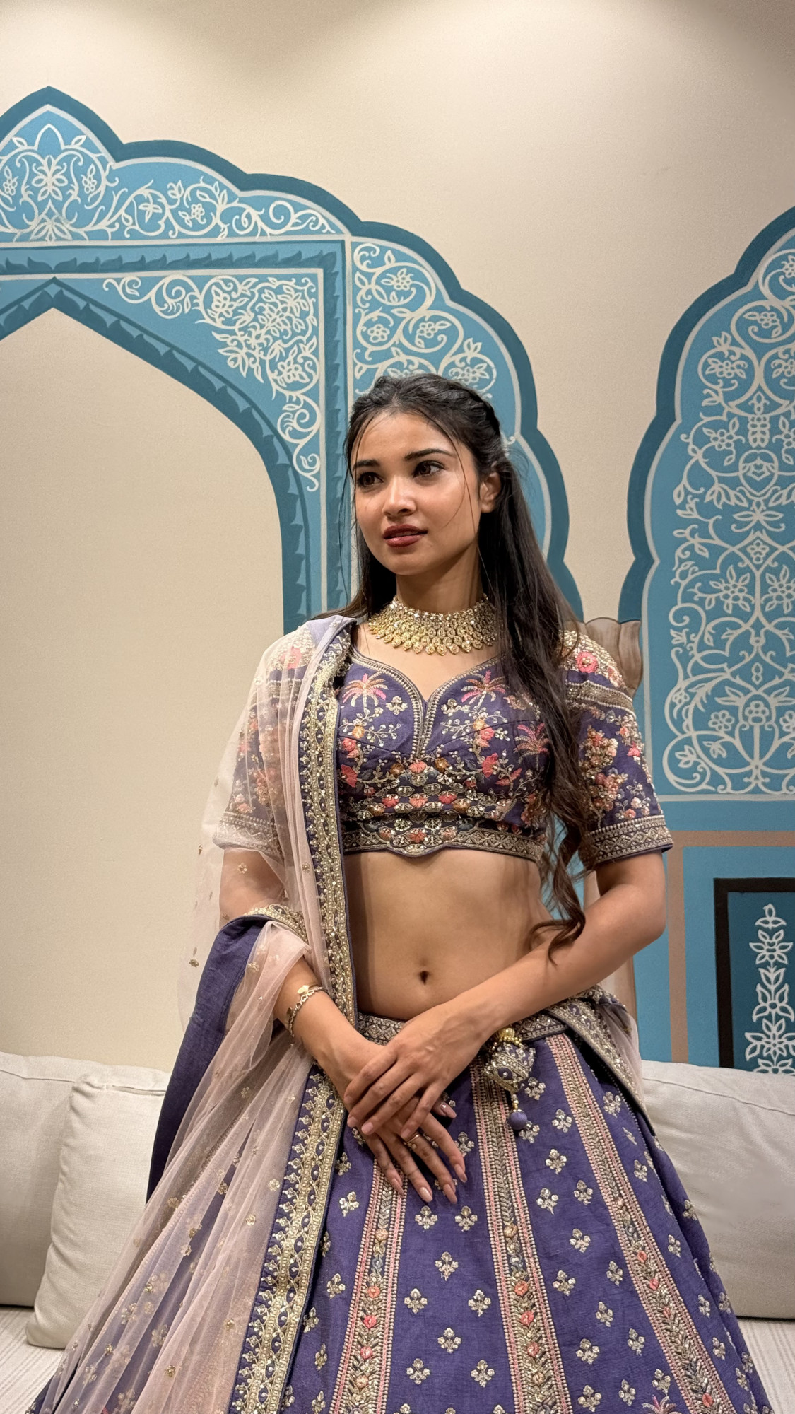 This stunning lehenga is crafted in a rich royal purple base and beautifully adorned with detailed floral motifs, palm-inspired threadwork, and shimmering hand embellishments. The blouse is heavily embroidered with a flattering sweetheart neckline and an elegant deep back with dori tie-up and tassels, giving it a perfect blend of modern charm and traditional grace. The lehenga skirt stands out with its grand vertical panel detailing, fine butti work, and a majestic heritage-inspired elephant border finished with an ornate hemline. Completed with a delicate blush net dupatta featuring a subtle shimmer and embroidered border, this ensemble is perfect for weddings, sangeet nights, receptions, and festive celebrations.