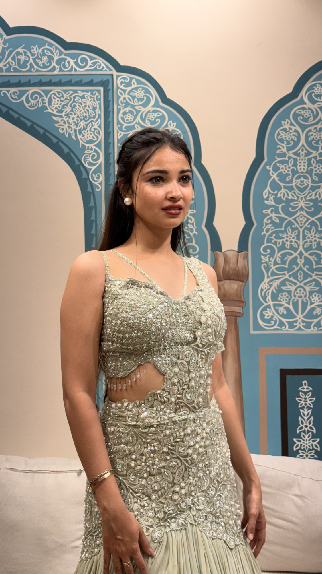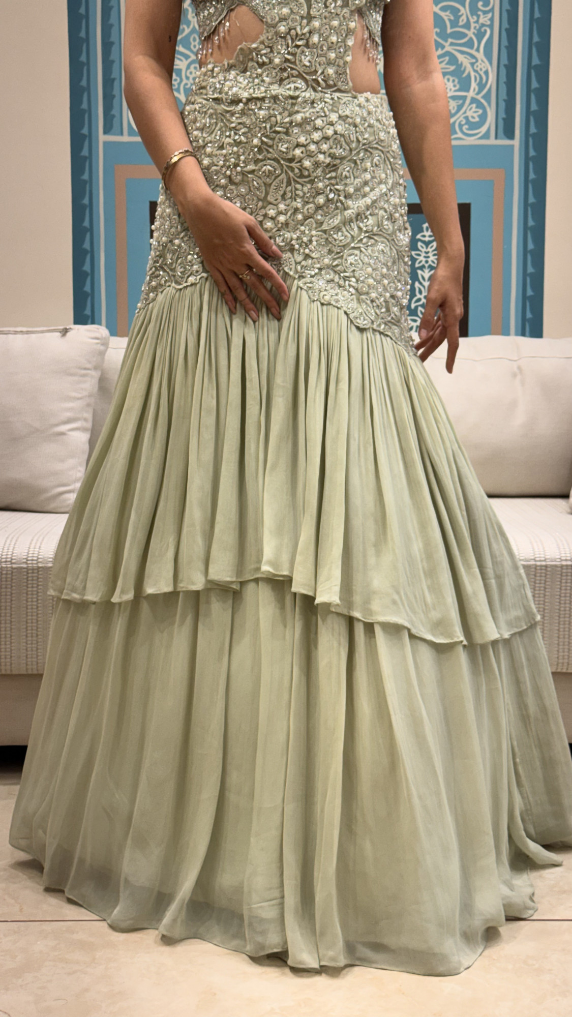 This elegant lehenga set is designed in a soothing mint/sage green shade, beautifully highlighted with all-over mirror, sequin and pearl detailing for a luxe shimmer. The blouse features a trendy asymmetric one-shoulder pattern with delicate strap detailing and stylish cutwork on the waist, adding a bold modern twist. The embroidery is rich and dense with floral-inspired motifs, giving a premium designer finish. Paired with a soft, airy layered flare skirt, the outfit creates graceful movement while keeping the look light and youthful. Finished with a matching dupatta drape, this ensemble is perfect for cocktail nights, sangeet, engagement functions, and destination wedding celebrations where you want a fresh pastel statement.