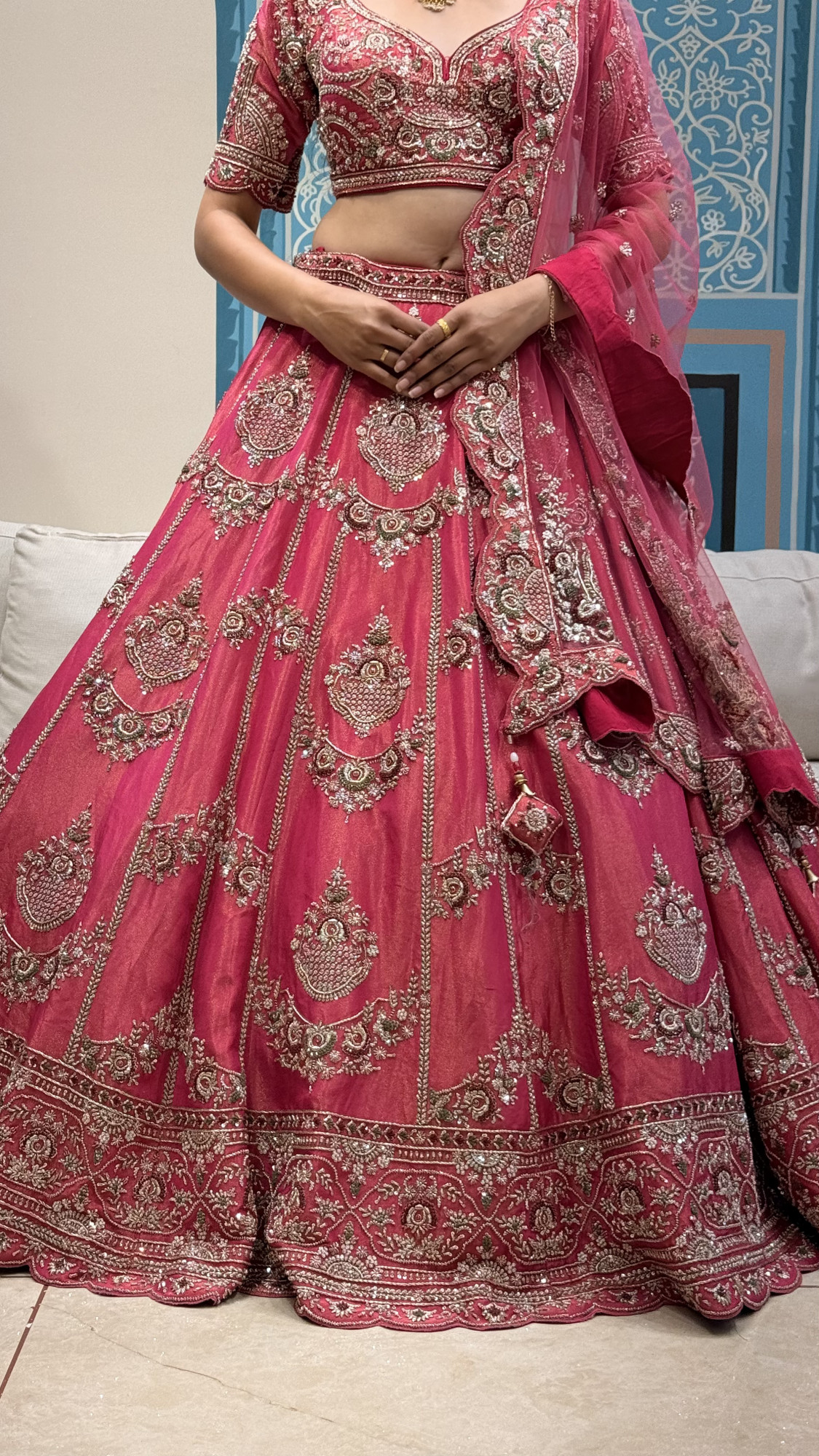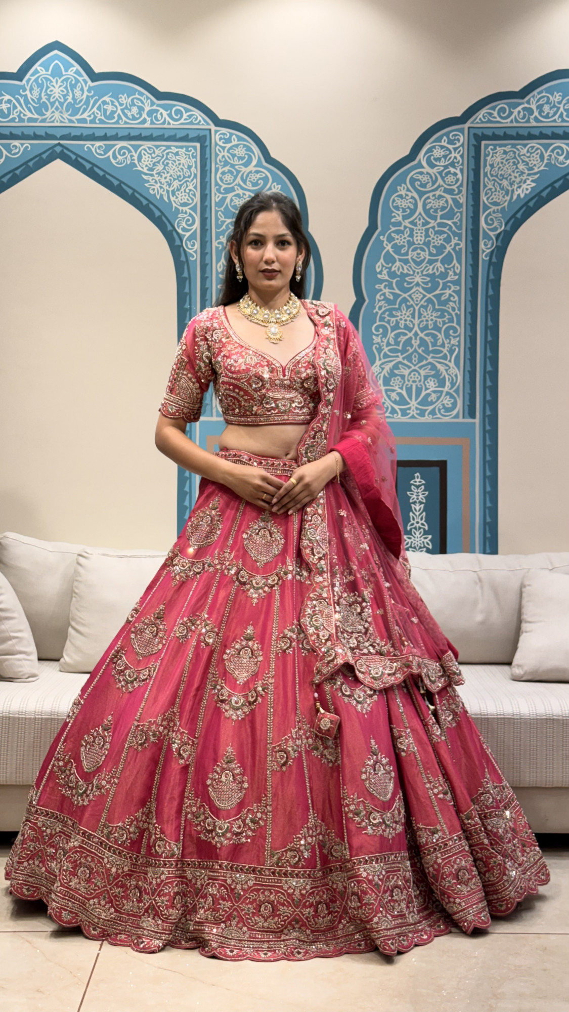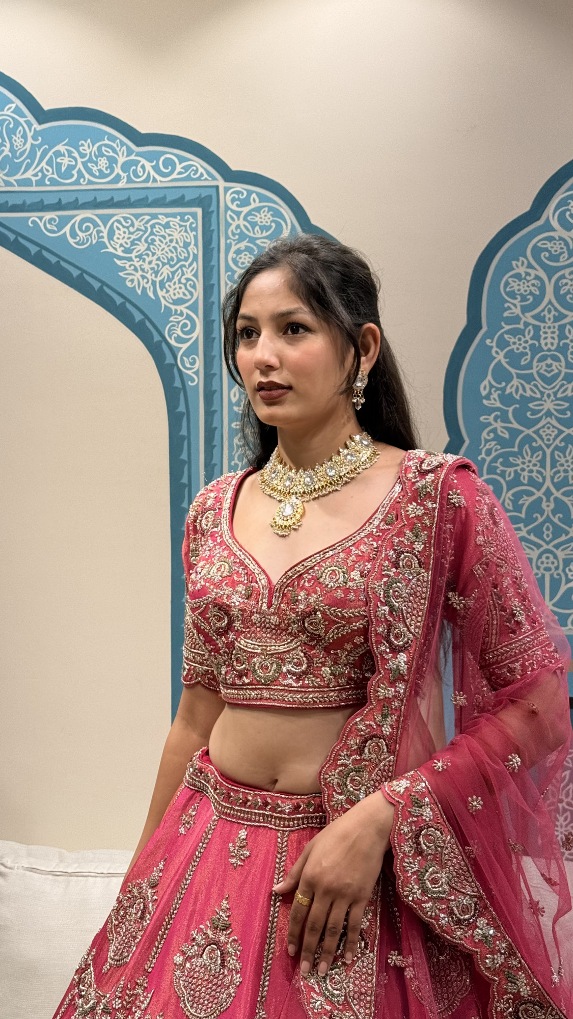 This stunning lehenga set comes in a vibrant rani shade, designed to instantly stand out at weddings and celebrations. The blouse is richly embroidered with intricate floral motifs, zari work, sequins and bead detailing, finished with a flattering neckline and an elegant deep back design with long dori tie-up and statement latkans. The lehenga skirt is detailed with beautifully placed buttis and embroidered panels, completed with a grand, ornate border that adds a regal finish. Paired with a matching net dupatta featuring heavy embroidered edging and scattered shimmer work, this outfit is the perfect blend of tradition and glamour. Ideal for sangeet, wedding functions, bridal wear, reception, and festive occasions where you want a royal, eye-catching look.