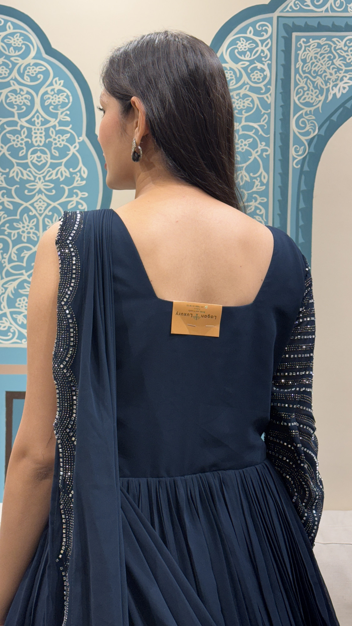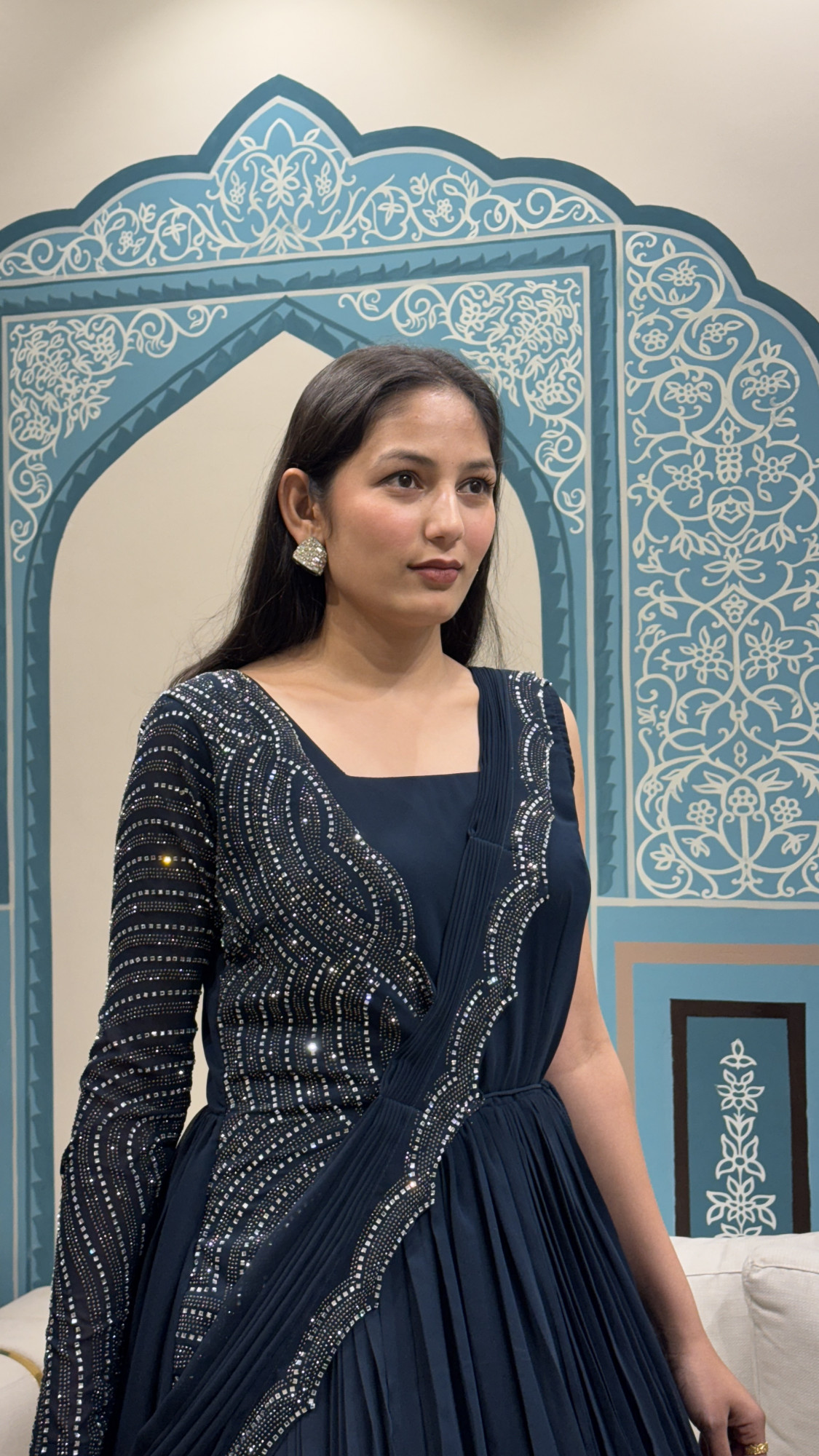 This stunning navy lehenga ensemble brings together modern drape styling with timeless festive charm. The outfit features a soft pleated lehenga skirt in a rich midnight blue tone, creating a beautiful flow and volume with every step. Paired with a sleek blouse and highlighted by a statement embellished sleeve and border detailing in silver sparkle patterns, it adds just the right amount of glam without being overpowering. The one-side embellished sleeve gives it a contemporary edge, making this look ideal for cocktail nights, receptions, sangeet functions, and wedding parties where you want to look effortlessly classy and unique.