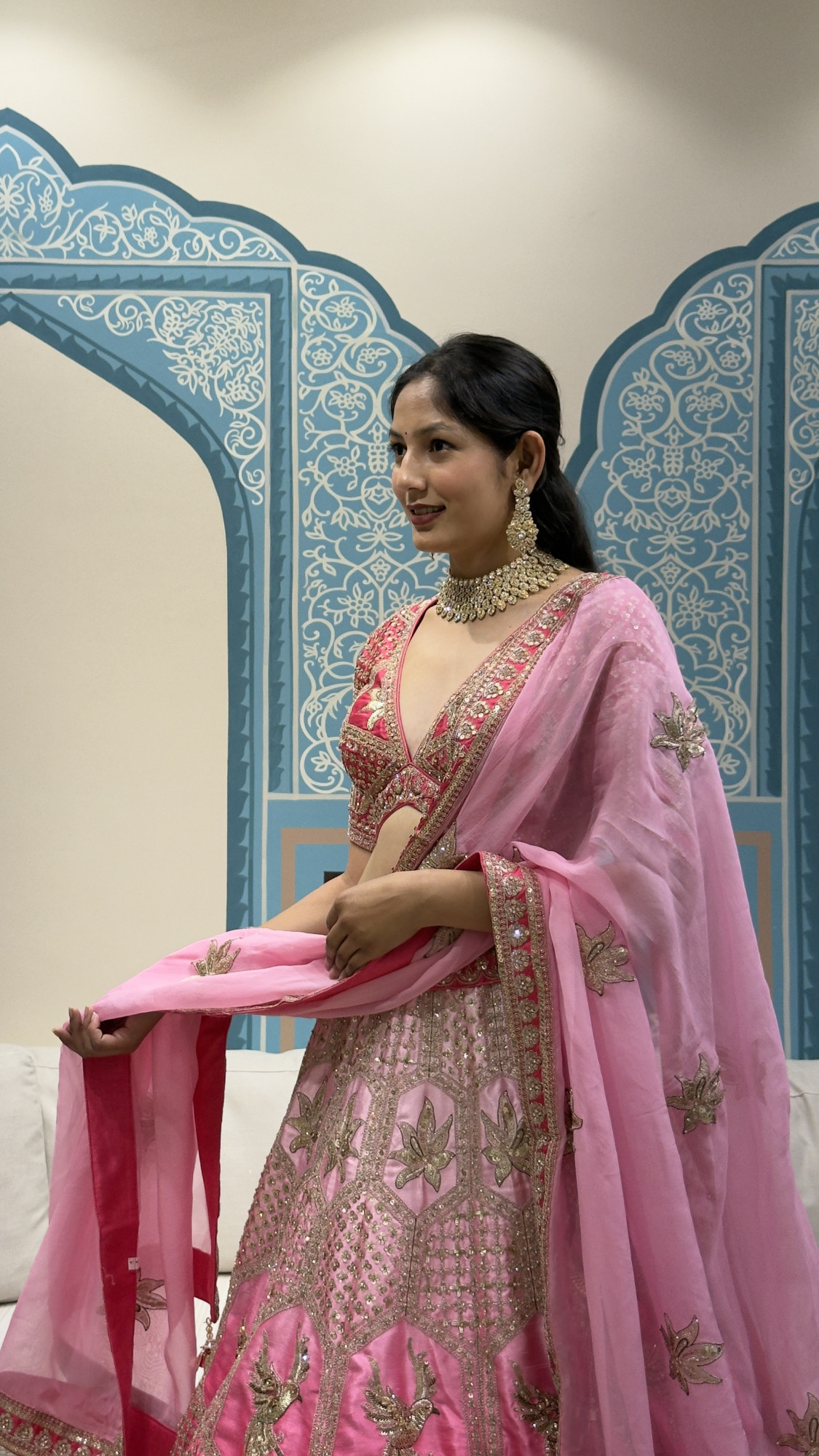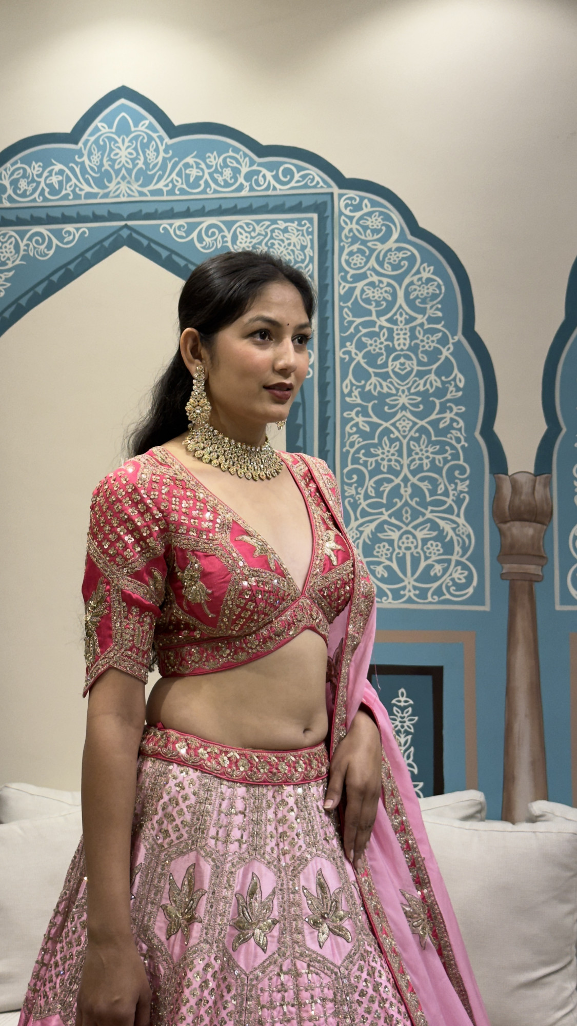 This glamorous lehenga is designed in a beautiful combination of hot pink and pastel pink, richly decorated with intricate gold zari, sequins, and detailed embroidered motifs across the skirt. The blouse has a stylish deep V neckline with heavily embellished half sleeves and a trendy back tie-up design with tassels for a modern festive touch. Paired with a soft net dupatta finished with embroidered borders and delicate motifs, this outfit gives a royal, statement look with a perfect blend of tradition and elegance.