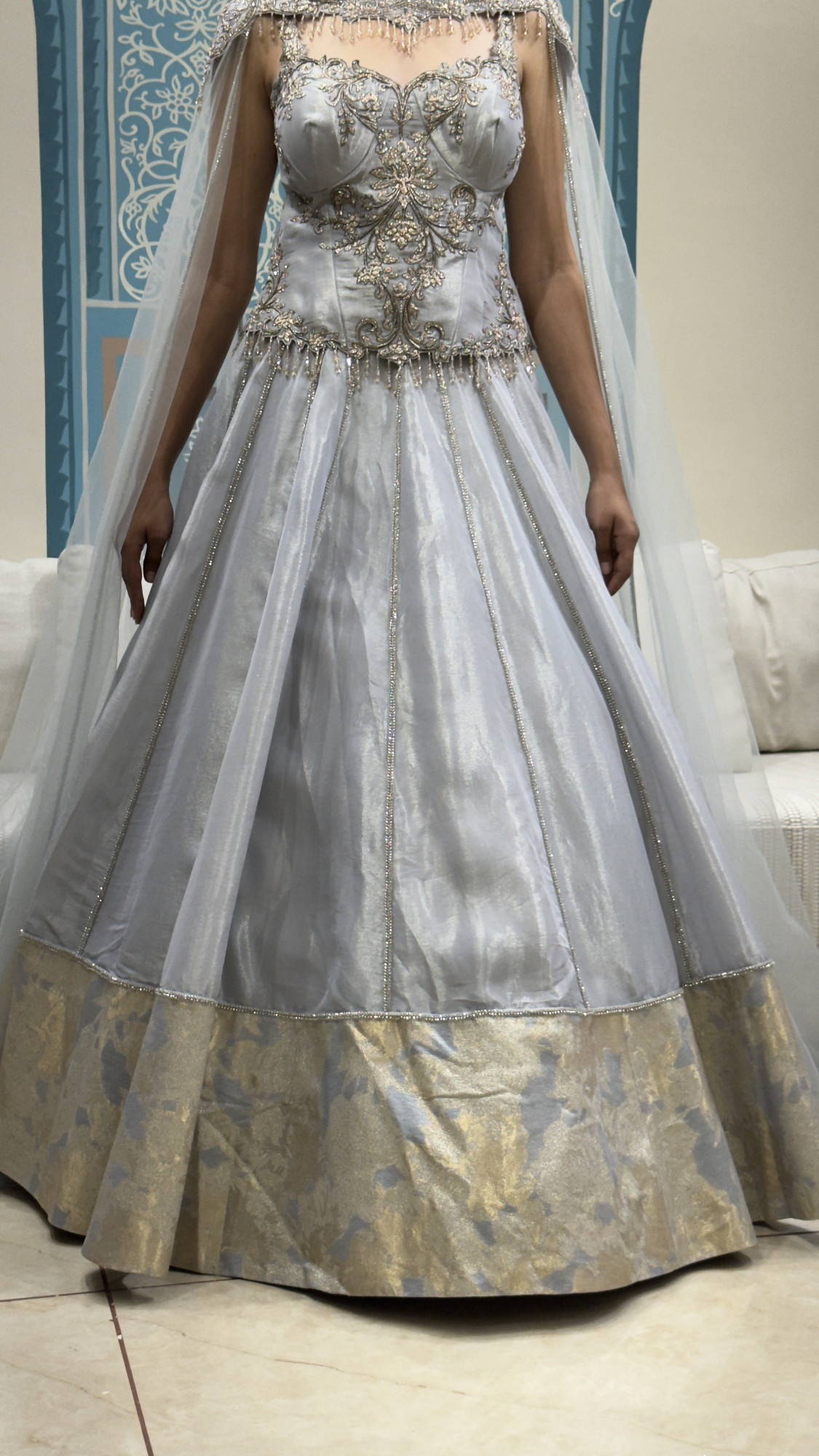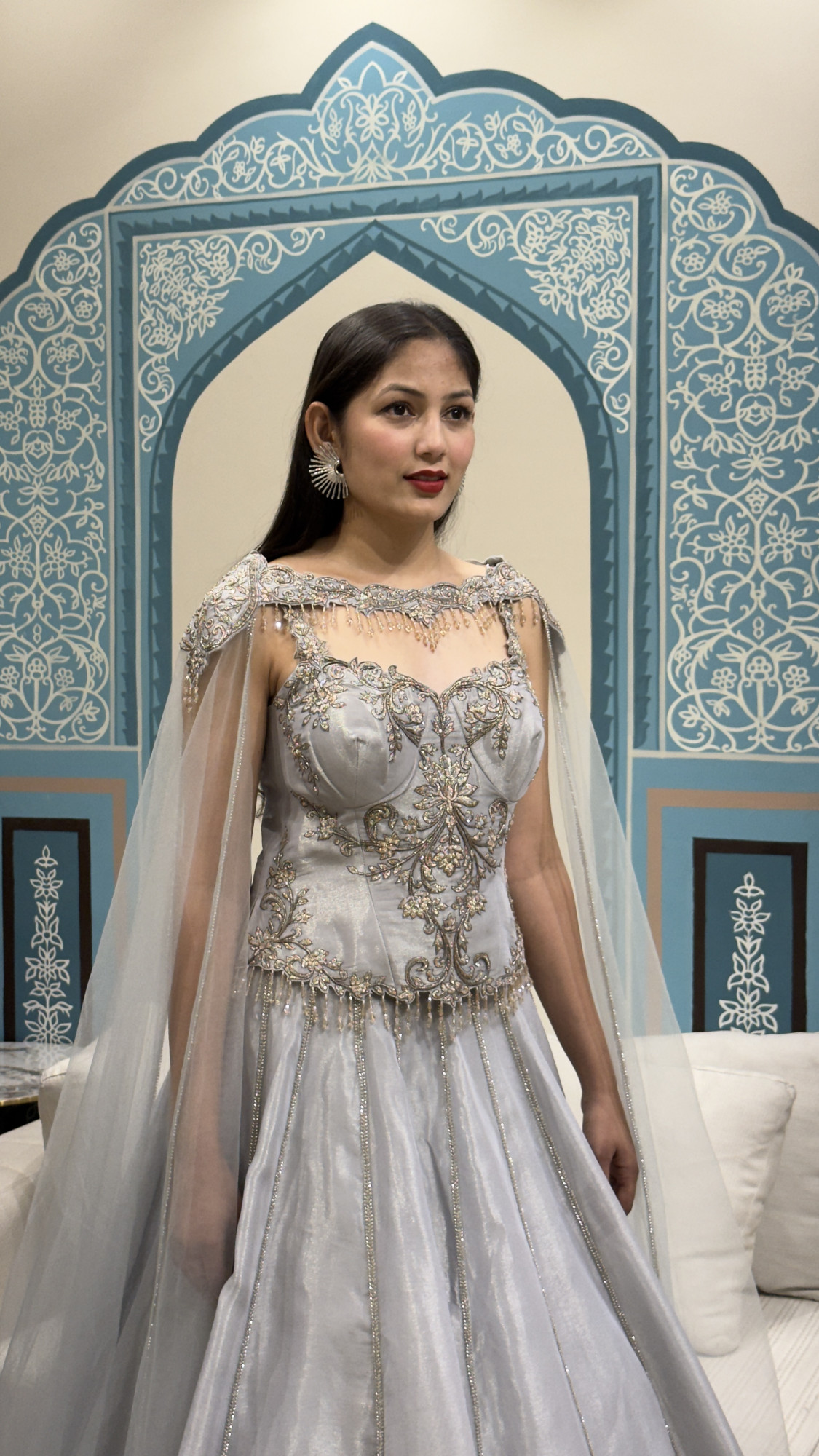 This silver-grey lehenga is a perfect blend of modern couture and timeless elegance. The highlight is the corset-inspired blouse, designed to sculpt the silhouette beautifully, adorned with intricate antique gold and silver embroidery and delicate bead detailing. The neckline is elevated with embellished shoulder accents and soft, sheer cape panels that fall gracefully, adding drama without overpowering the look. The lehenga skirt flows effortlessly with a subtle sheen, detailed with vertical embellishments for an elongated effect and finished with a contrasting textured hem that adds depth and richness. Ideal for receptions, cocktail evenings, engagement ceremonies, and luxe festive occasions, this lehenga is made for those who love statement elegance with a refined edge.
