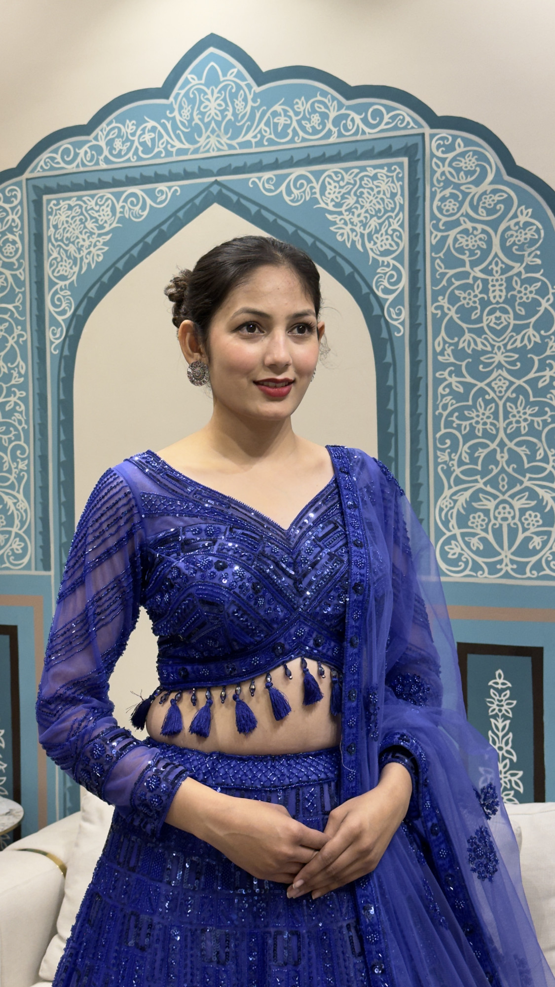 This royal blue lehenga is designed to make a powerful style statement. The blouse stands out with intricate geometric and floral sequin embroidery, sheer full sleeves, and playful tassel detailing at the hem, adding movement and charm. The deep V-neckline enhances the modern silhouette while keeping the look elegant and balanced. The lehenga skirt is beautifully detailed with all-over textured embroidery and subtle shimmer, creating depth and richness with every step. Paired with a lightweight net dupatta adorned with delicate motifs, this ensemble is perfect for sangeet nights, cocktail functions, festive celebrations, and wedding events. A perfect blend of bold colour, craftsmanship, and contemporary elegance.