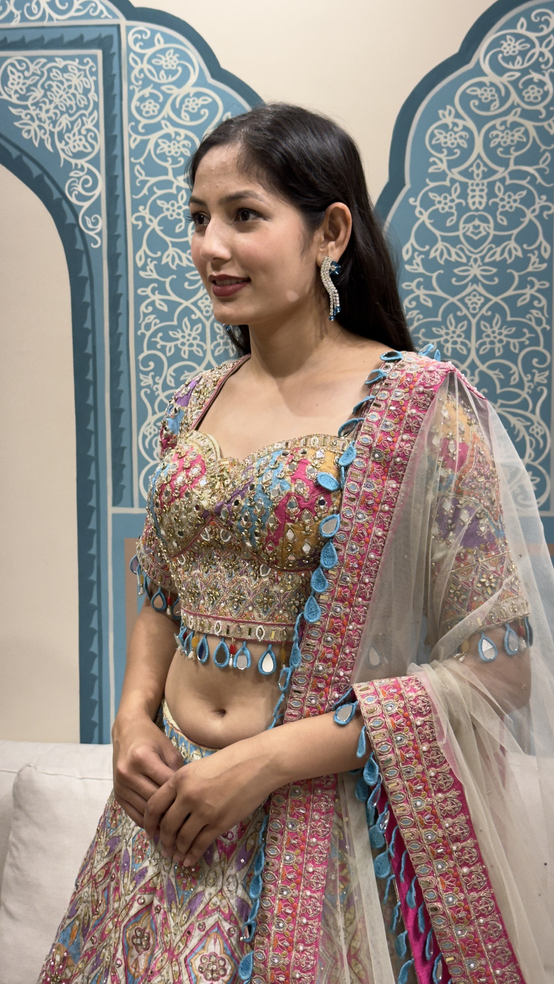 This statement lehenga features a heavily embellished blouse with intricate mirror work, multicolour thread embroidery, and charming tassel detailing at the hem. Paired with a bold, patterned skirt in bright hues and a sheer dupatta with embroidered borders, this ensemble is perfect for mehendi functions, sangeet nights, festive celebrations, and destination weddings.