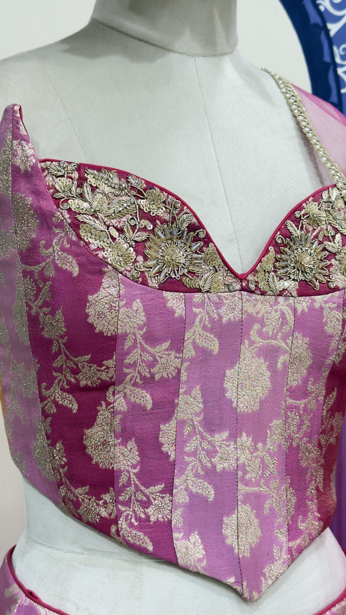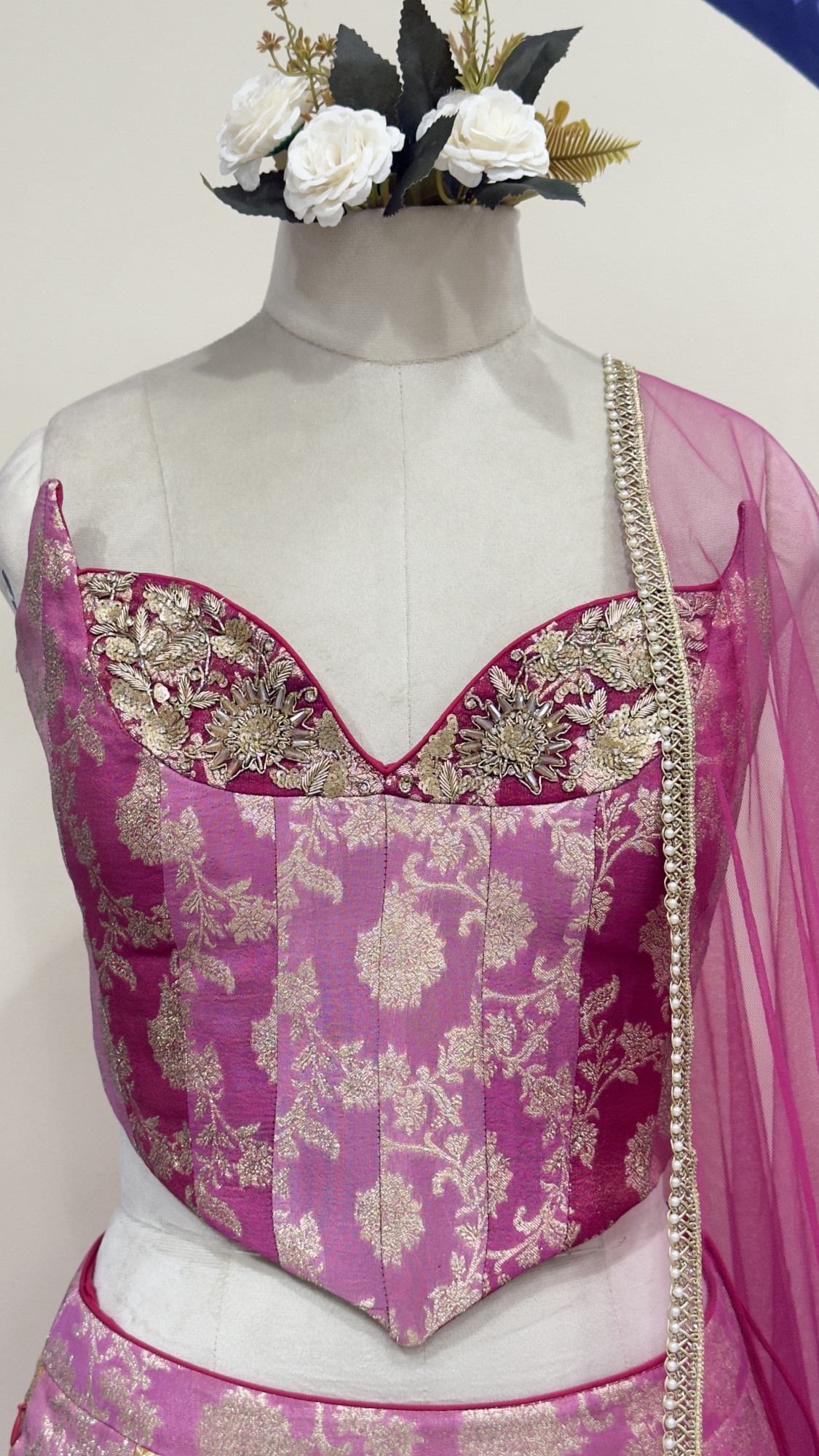 This exquisite lehenga features a magenta pink blouse adorned with intricate gold floral embroidery and statement detailing along the neckline. The panelled lehenga skirt blends pink and mustard orange hues, enriched with all-over gold zari motifs and a heavily embroidered hem. Paired with a sheer blush pink net dupatta finished with delicate gold borders, this ensemble is ideal for weddings, festive celebrations, and special occasions.