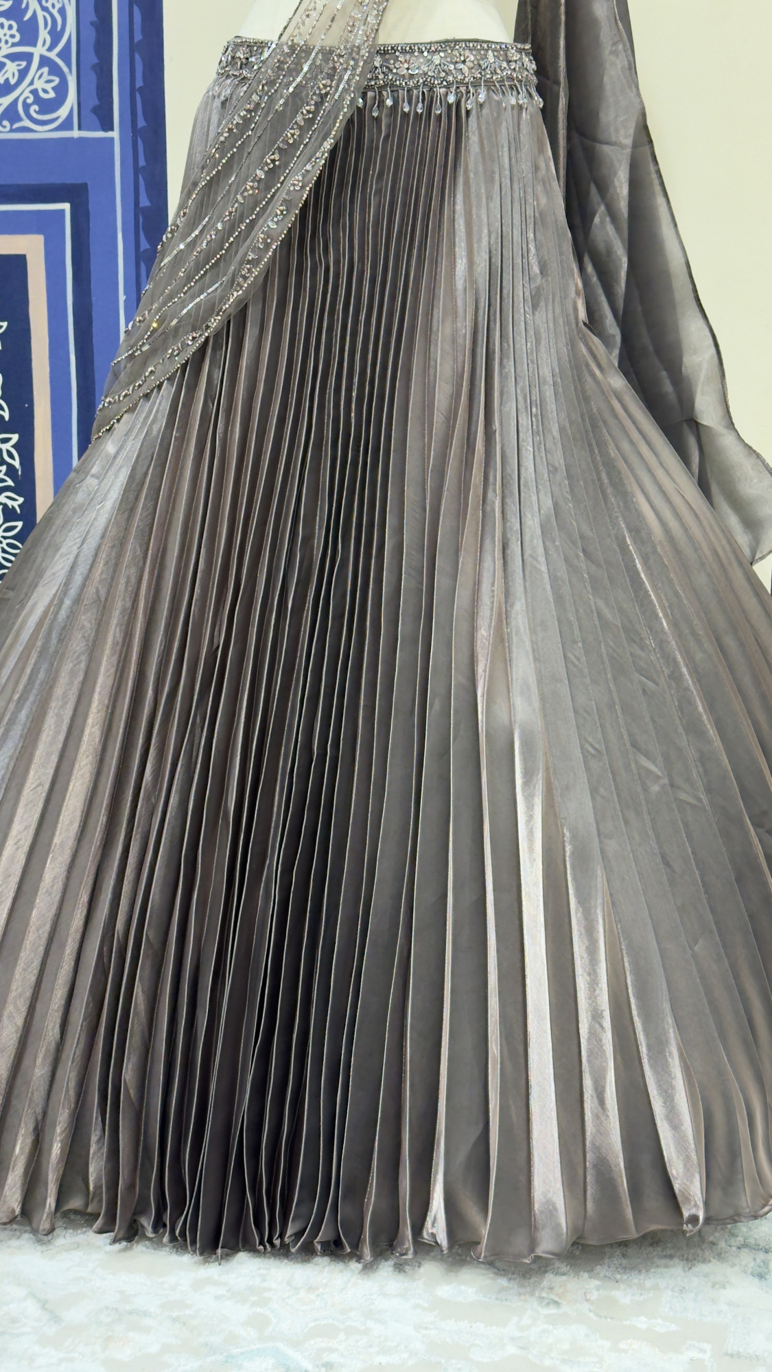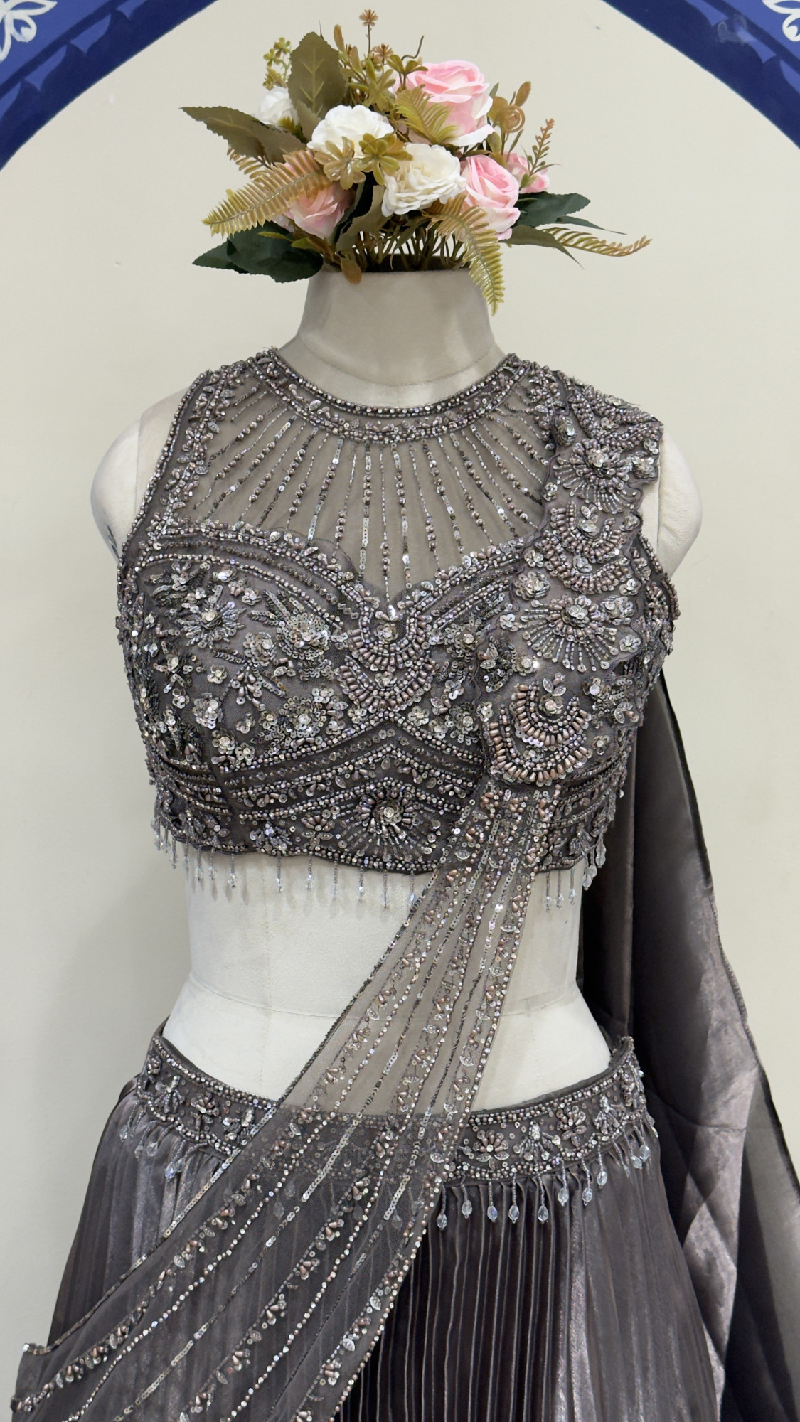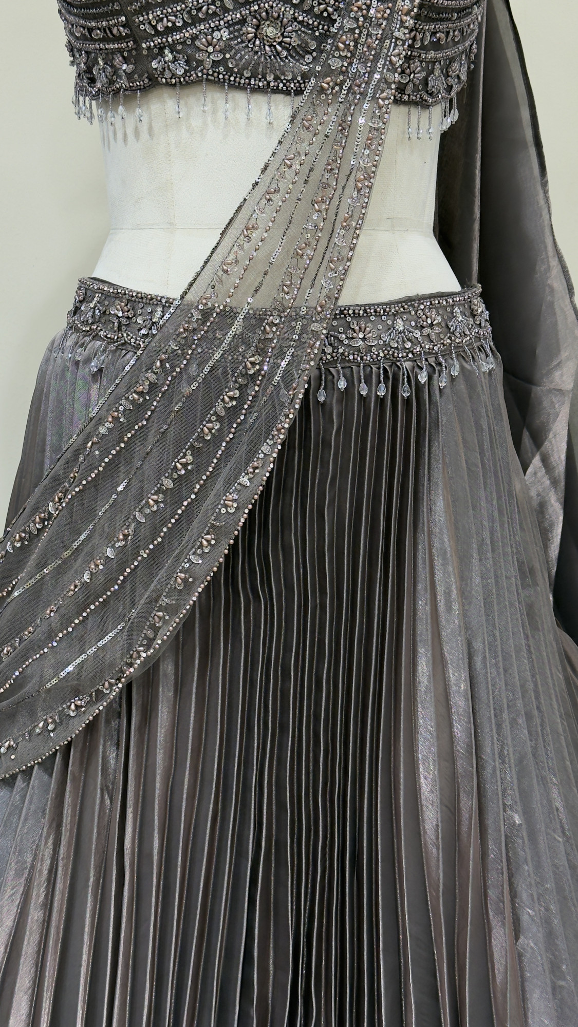 This elegant lehenga set comes in a refined smoky grey tone, featuring a heavily embellished blouse with detailed sequin, bead, and crystal work layered on sheer fabric. The blouse is finished with delicate hanging bead accents, adding subtle movement and sparkle. Paired with a flowy pleated grey skirt and a matching embellished dupatta, this ensemble blends contemporary elegance with festive glamour—perfect for cocktail nights, receptions, and evening celebrations.