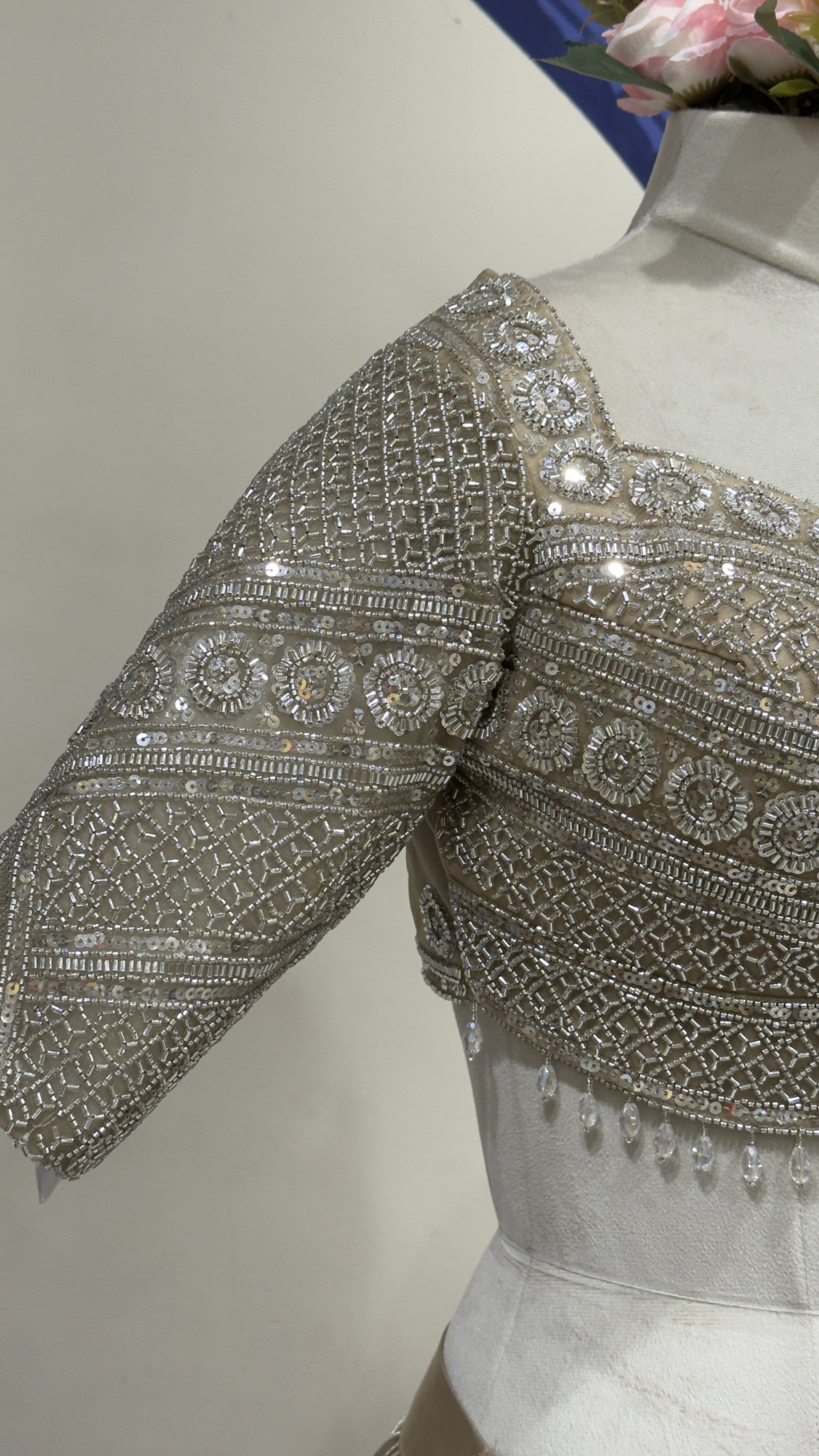 This graceful lehenga set comes in a refined champagne gold with beige undertones, highlighted by delicate silver and crystal embellishments. The blouse is richly embroidered with geometric and floral motifs, finished with subtle hanging bead details for added charm. The flowy pleated skirt enhances movement and elegance, while the sheer net dupatta with a soft satin border completes the look. A timeless choice for engagements, receptions, and festive occasions. ✨