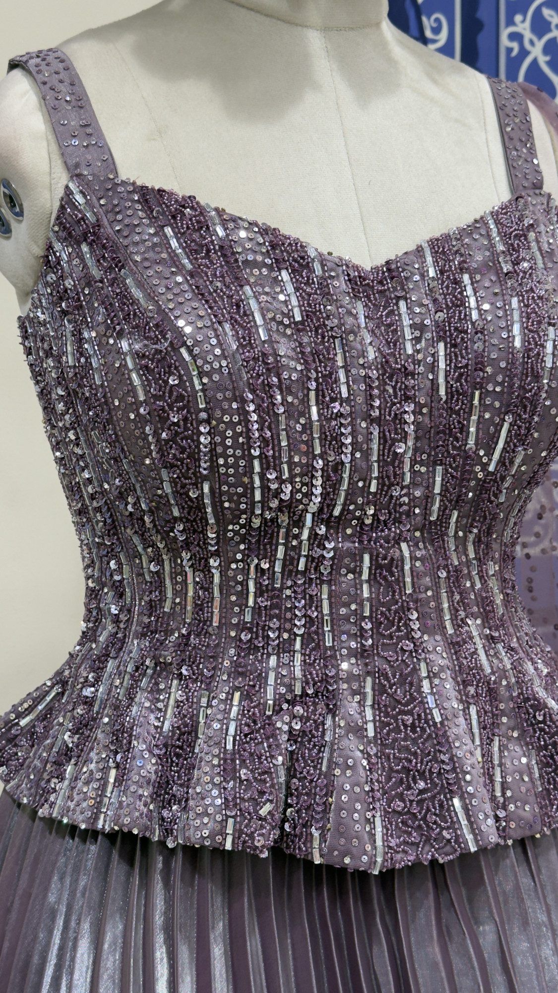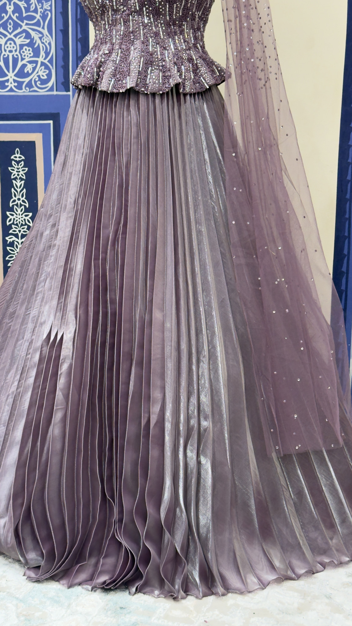 This elegant lehenga set comes in a muted lavender-mauve colour palette with subtle shimmer undertones. The structured blouse is richly adorned with vertical sequin and bead embroidery, creating a sculpted, corset-inspired silhouette. The pleated lehenga skirt flows beautifully in a complementary mauve shade, adding movement and softness to the look. Finished with a sheer net dupatta sprinkled with delicate sequins, this ensemble is perfect for cocktail nights, receptions, or evening celebrations.