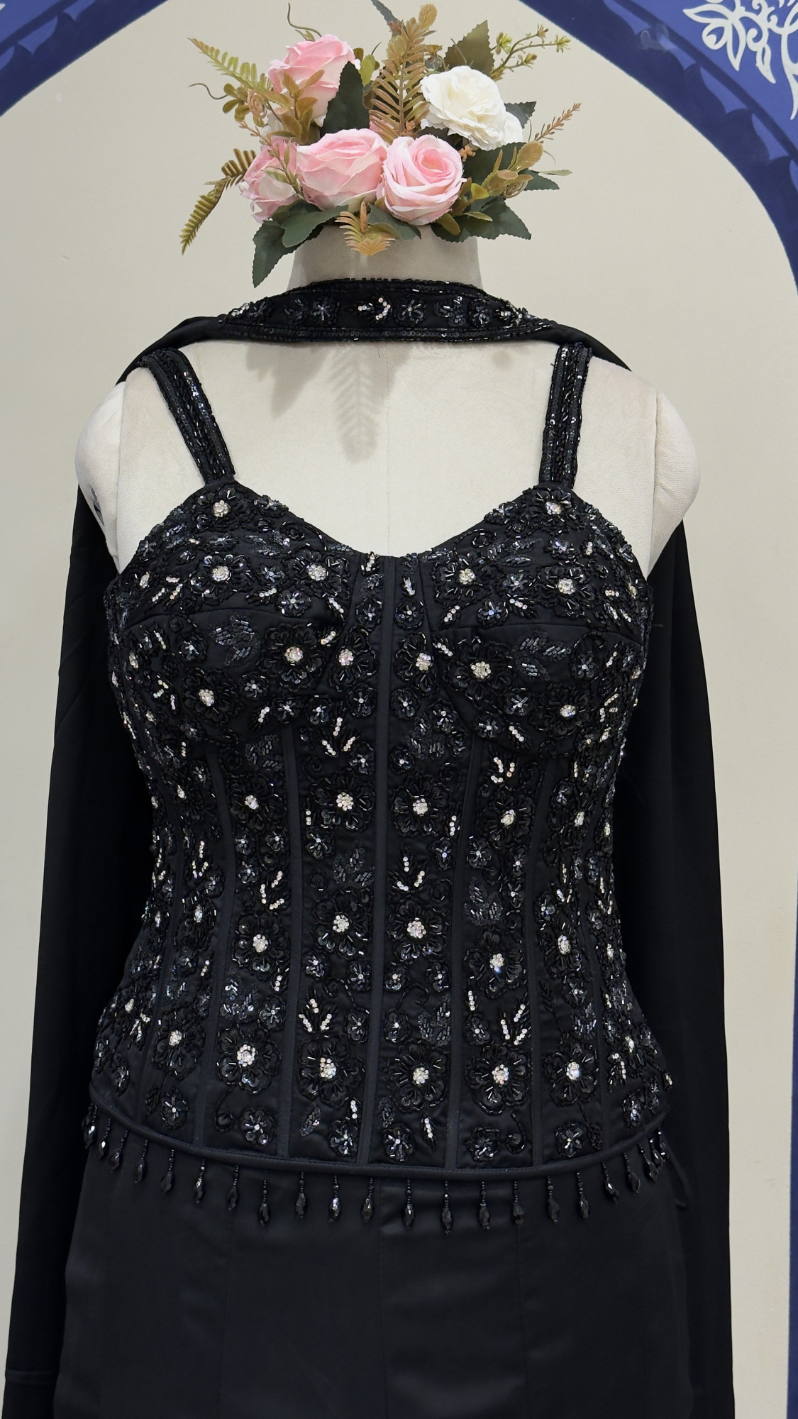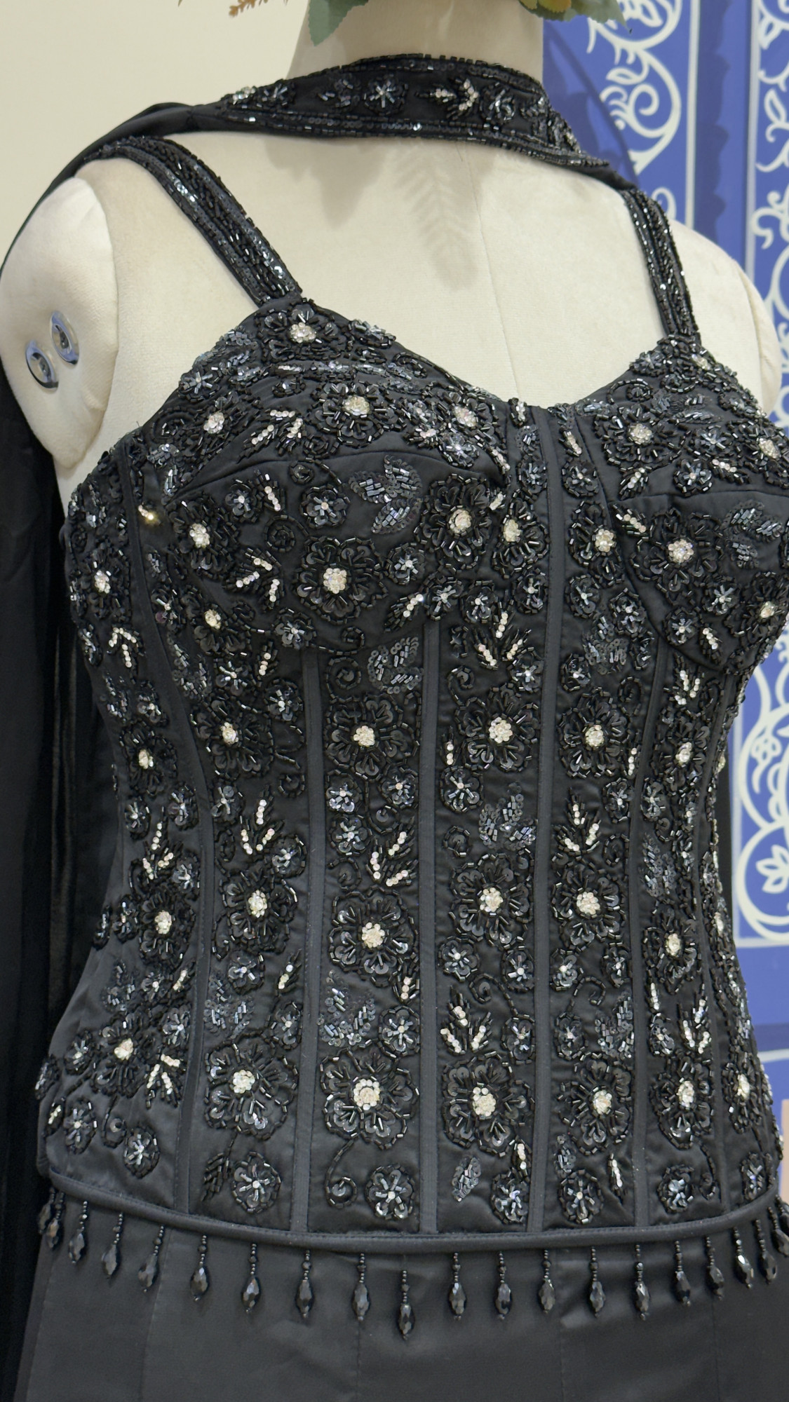 This elegant black embellished blouse features intricate floral sequin and bead embroidery with a structured, fitted silhouette, making it a perfect standalone statement piece. The black lehenga, sold separately, is crafted in a soft, flowing fabric with a graceful flare that adds effortless movement and sophistication. Both pieces are designed to be styled individually, offering timeless elegance ideal for cocktail events, receptions, and evening occasions.