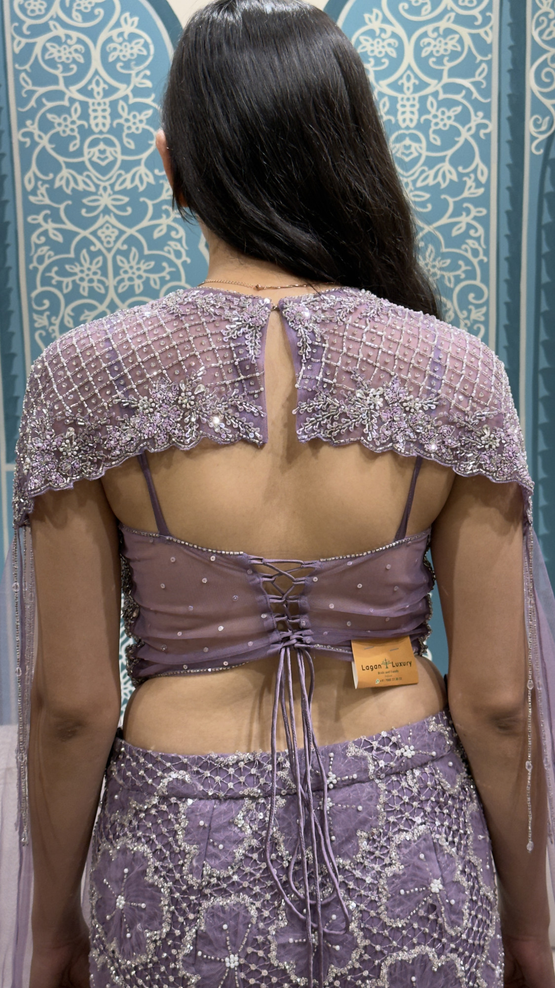 This graceful lavender lehenga set features a beautifully embellished blouse with vertical sequin and bead detailing, paired with a sheer embroidered cape that adds a dreamy, contemporary touch. The lehenga skirt is adorned with delicate floral motifs and fine shimmer work, flowing into soft pleats for effortless movement, while the subtle cut-out neckline and lace-up back enhance its refined charm—making it a perfect choice for cocktail nights, sangeet functions, and modern wedding celebrations.