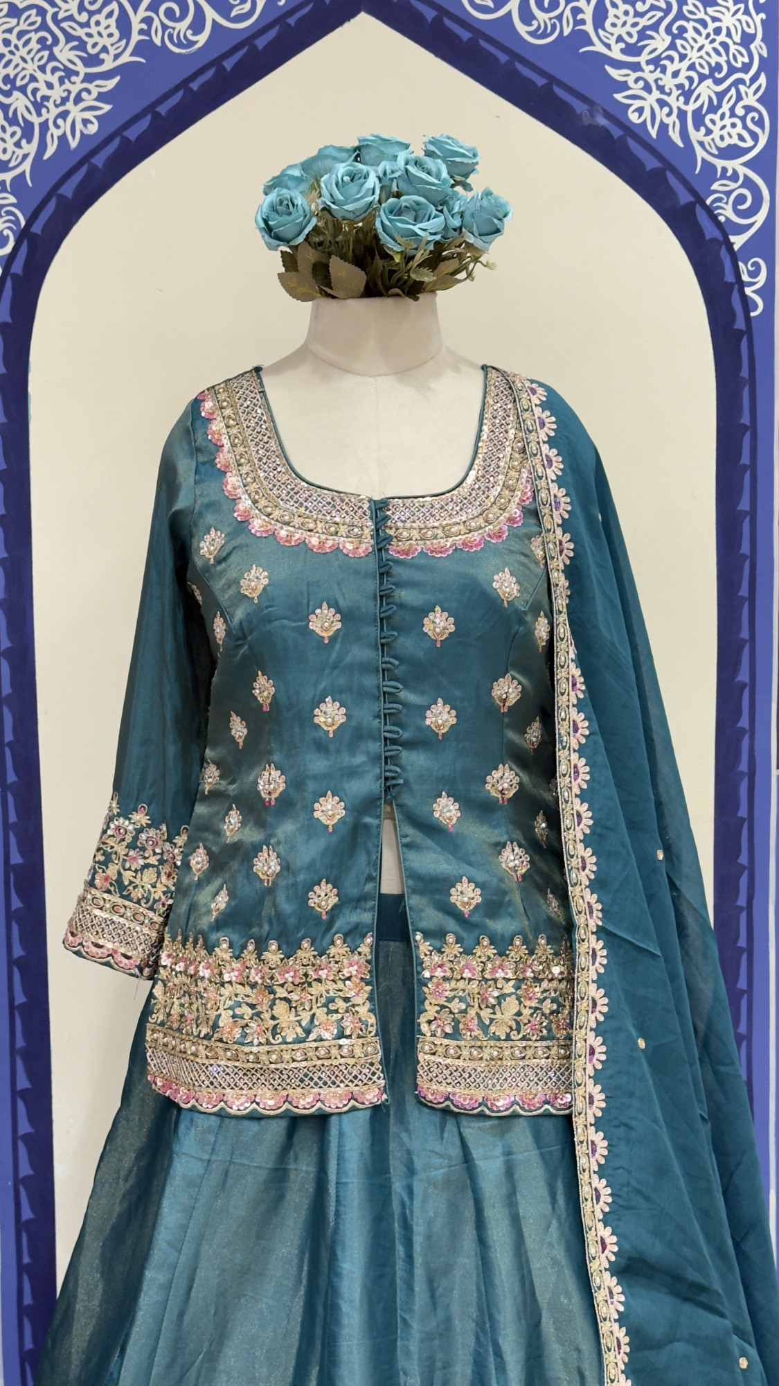 This sophisticated teal lehenga set features a beautifully crafted long jacket-style blouse adorned with delicate floral and motif embroidery, enhanced with fine mirror, thread, and sequin detailing along the neckline, sleeves, and hem. Paired with a flowy lehenga skirt accented with subtle shimmer work and completed with a matching embroidered dupatta, the ensemble offers a graceful blend of richness and elegance—perfect for sangeet nights, wedding festivities, and evening celebrations.