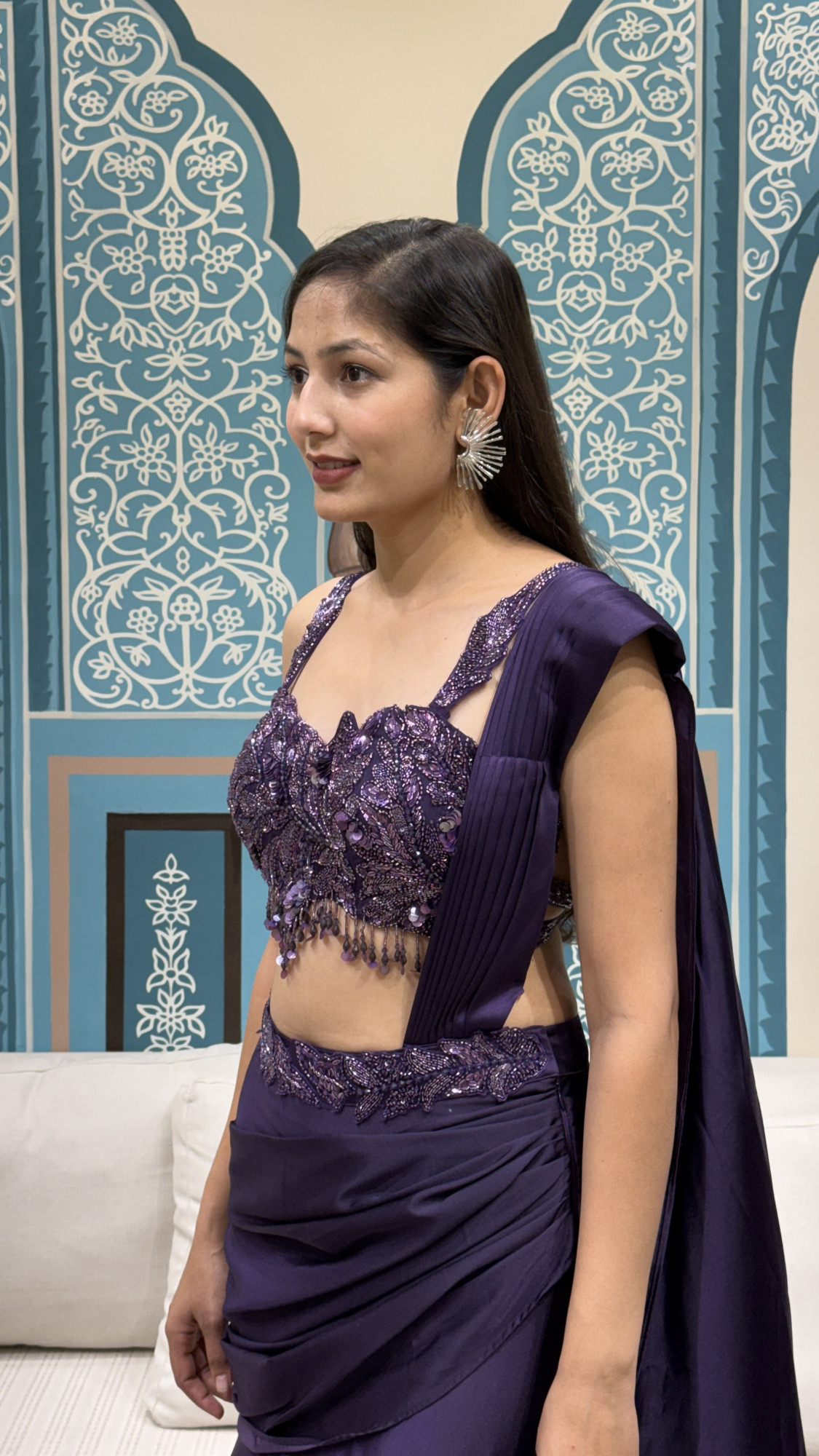 This statement crop top and skirt set features a heavily embellished blouse adorned with intricate sequin and bead embroidery, finished with delicate hanging crystal tassels for added movement. The high-waisted skirt is designed with soft gathers and layered ruffles, creating graceful volume and flow, while a matching fabric panel draped over the shoulder adds an elegant finishing touch. Perfect for cocktail nights, sangeet functions, and evening celebrations, this ensemble blends glamour with a contemporary silhouette.