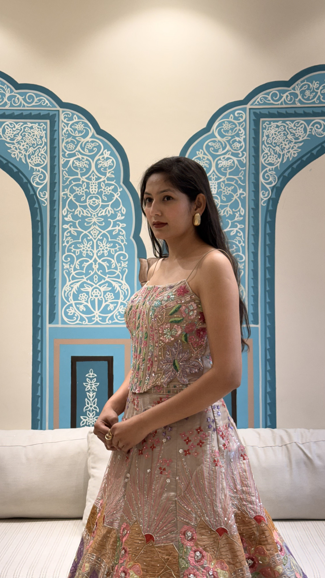 This lehenga features a beautifully embroidered blouse with delicate multicolour floral work and thin straps for a modern look. The skirt is richly detailed with hand embroidery and soft pastel tones, creating an elegant and graceful feel. Perfect for festive occasions, weddings, or special celebrations.