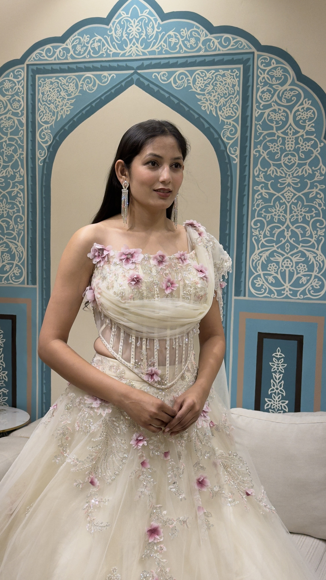 This elegant ensemble features a structured corset blouse adorned with intricate silver embroidery and soft pink 3D floral appliqués, highlighted by a sheer one-shoulder drape detail. The voluminous ivory skirt is finished with matching floral embroidery and subtle shimmer, creating a graceful balance of structure and softness. Ideal for engagements, receptions, and luxury bridal celebrations.