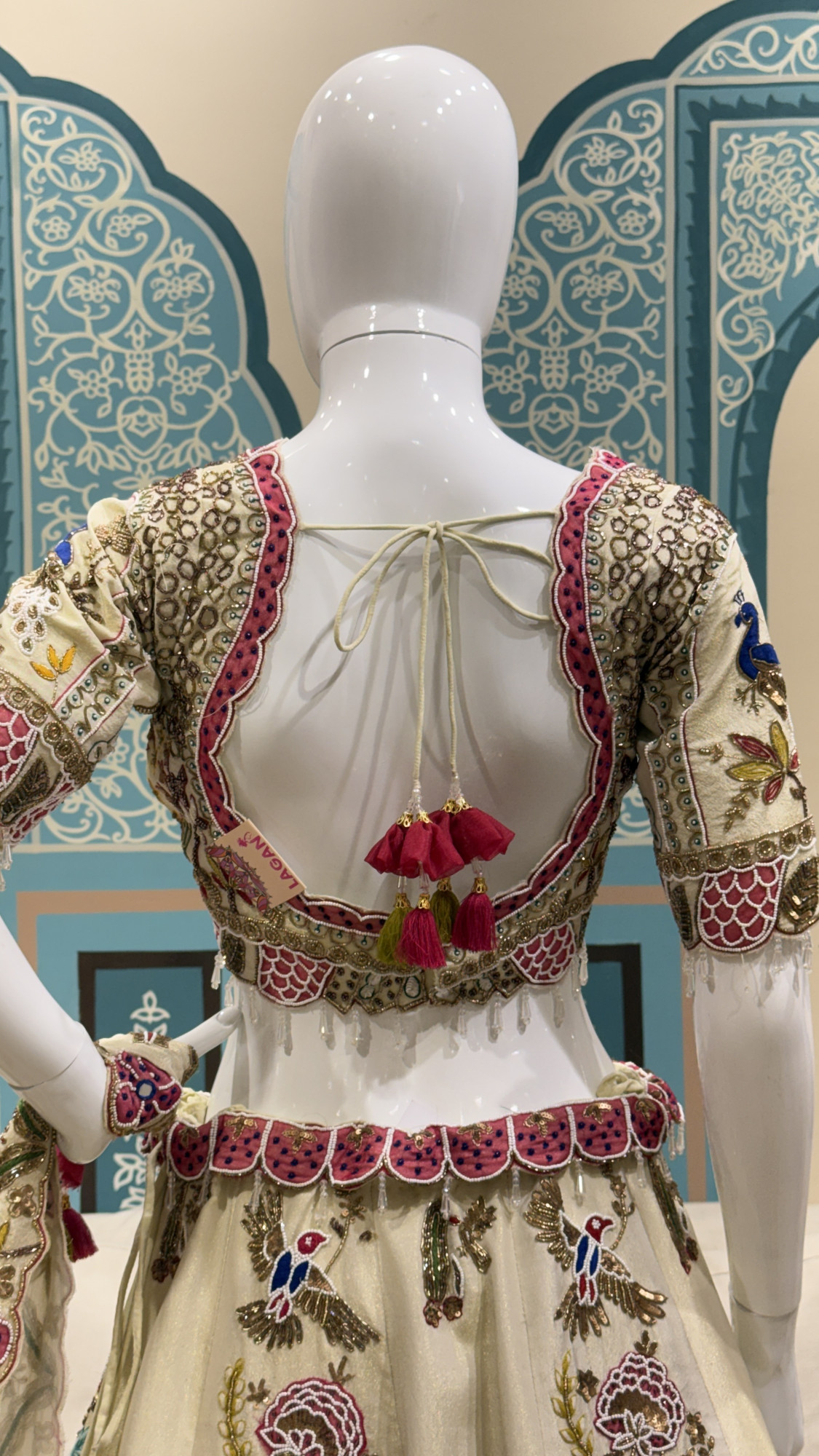 This ivory lehenga is beautifully crafted with detailed hand embroidery showcasing birds, floral elements, and traditional motifs, finished with a richly embroidered border. The blouse features elaborate threadwork, scalloped detailing, and delicate tassel accents, while the dupatta complements the set with matching embroidery and tassels. A perfect blend of elegance and artistry, ideal for weddings, festive occasions, and special celebrations.