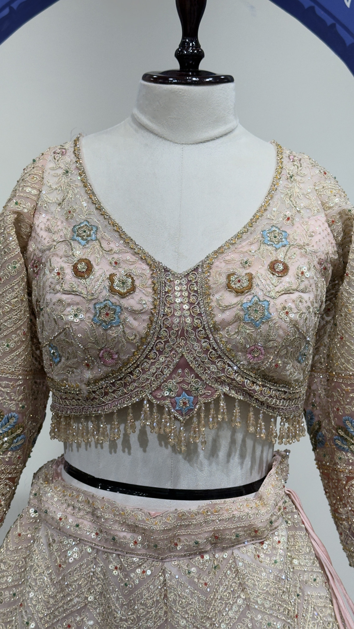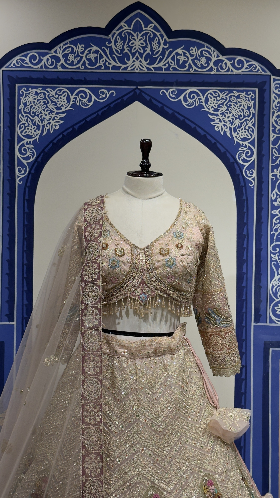 This exquisite lehenga set features a finely embroidered blouse with detailed floral and peacock motifs, enhanced by delicate bead and sequin embellishments. The lehenga skirt is beautifully crafted with all-over zigzag and floral embroidery, finished with a richly detailed border for a regal touch. Paired with a soft net dupatta highlighted by an ornate embroidered border, this ensemble blends traditional craftsmanship with timeless elegance—perfect for bridal occasions, receptions, and grand festivities.