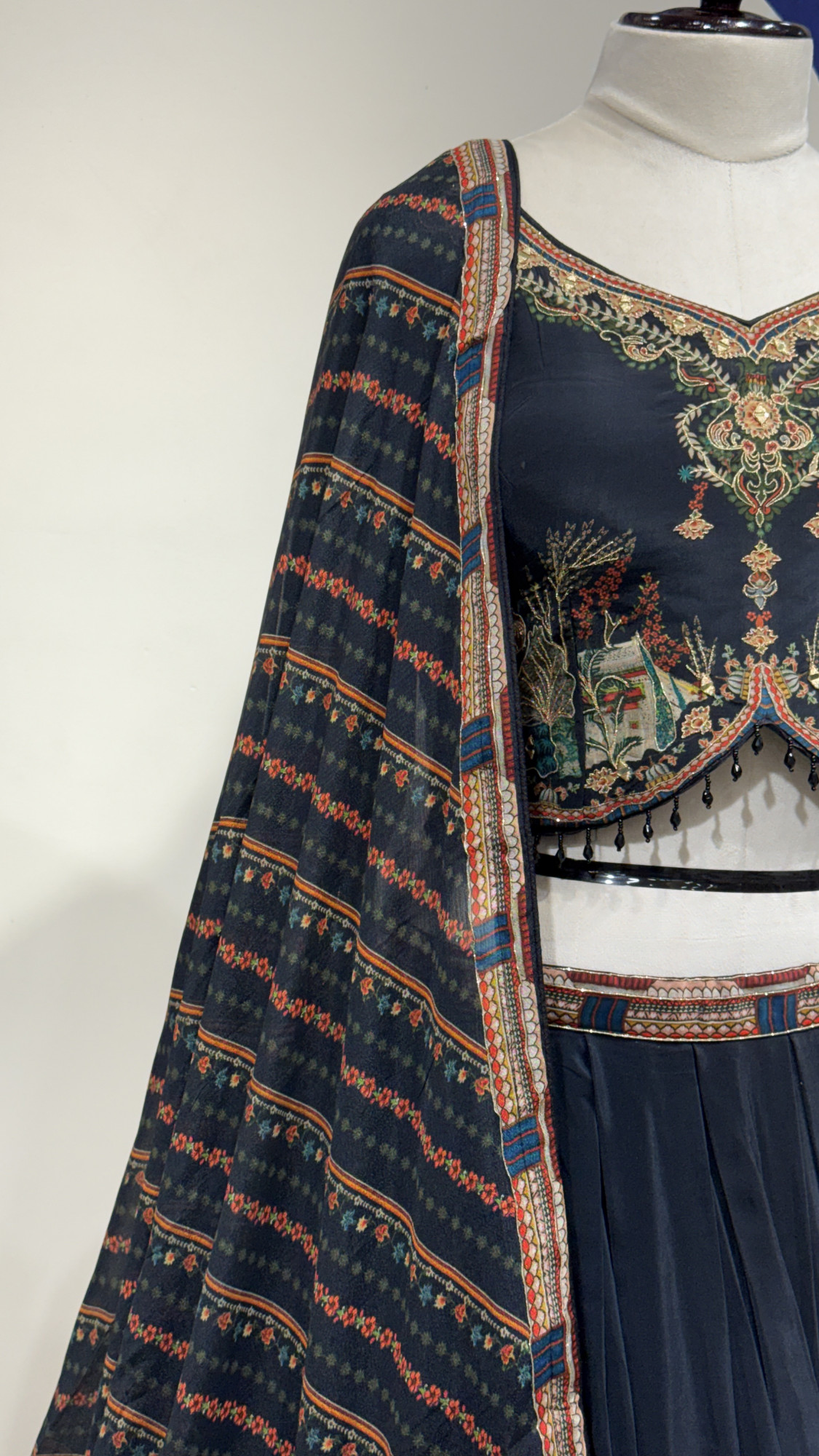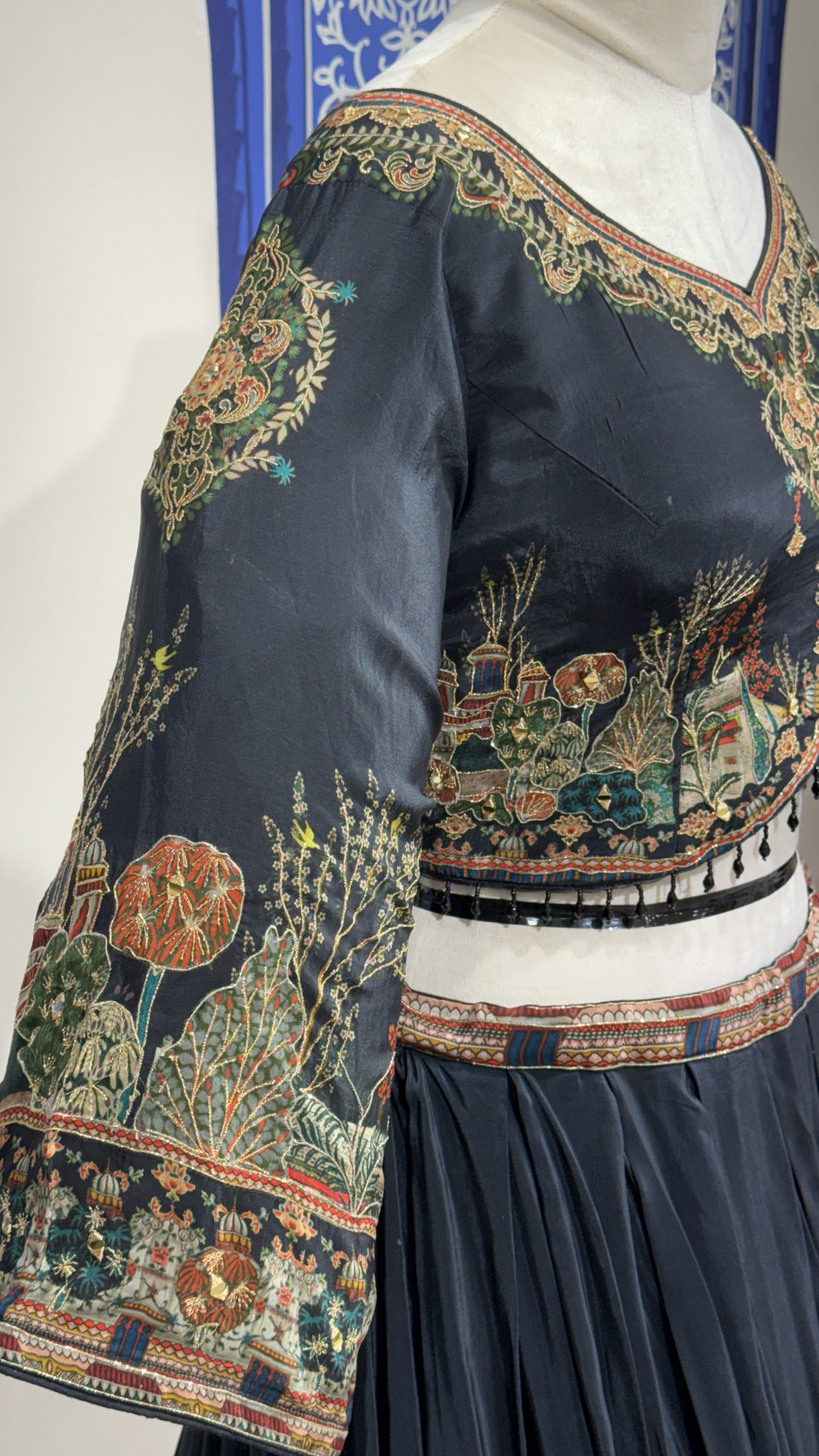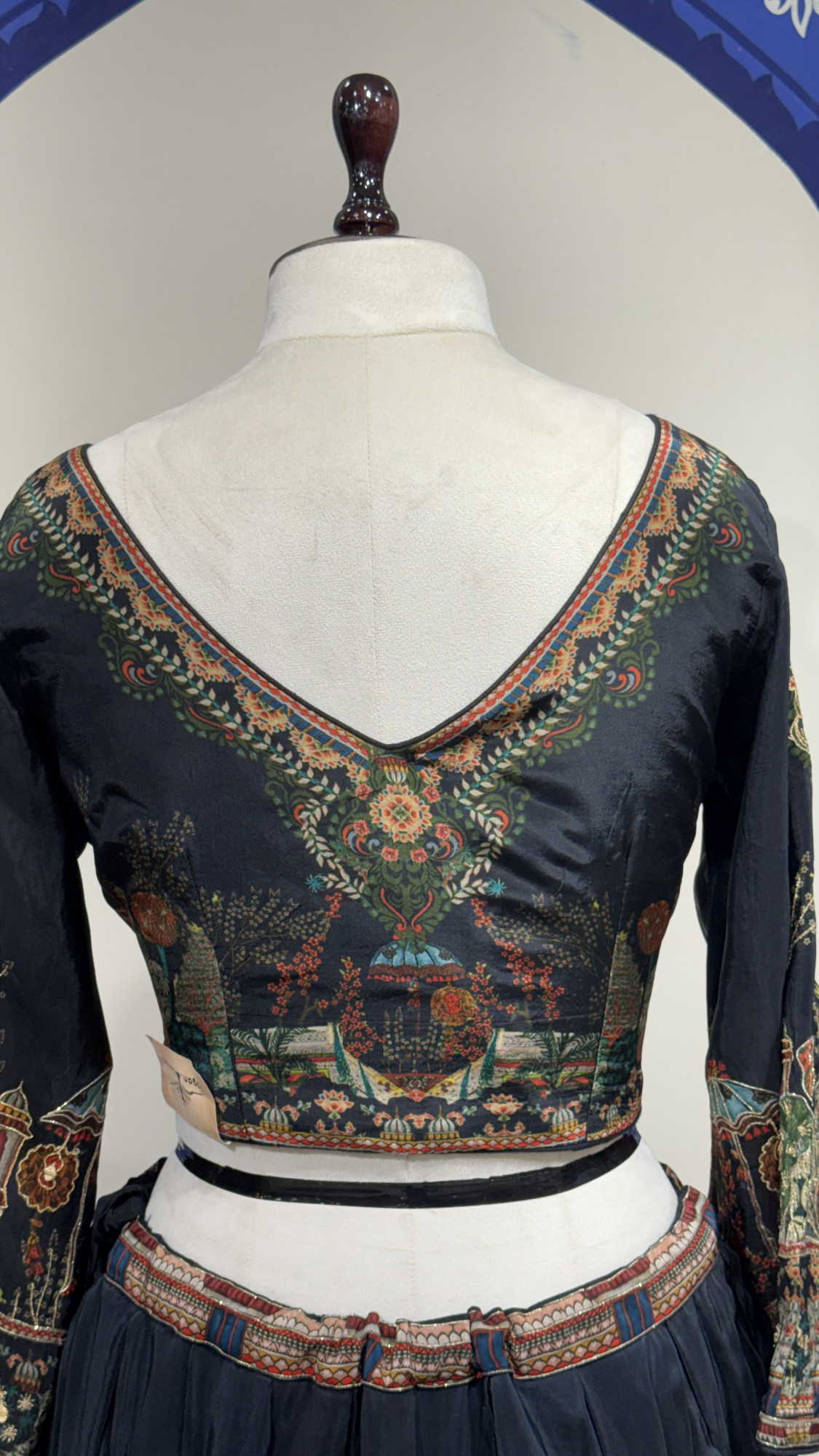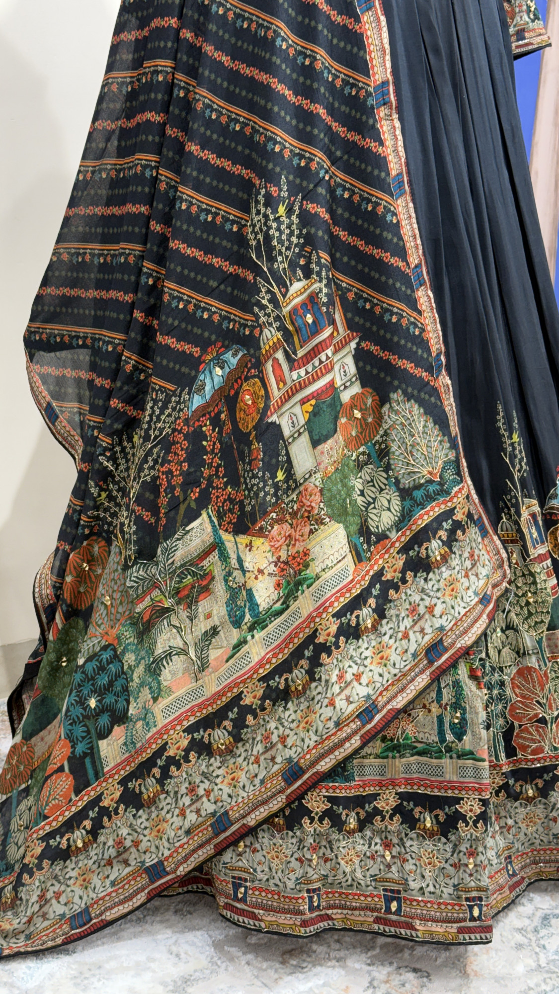 This elegant black lehenga set features intricate architectural and floral prints that bring a regal charm to the look. The V-neck blouse is detailed with refined prints and delicate bead tassels, while the pleated lehenga showcases a richly designed border for added drama. Paired with a matching printed dupatta, this ensemble is perfect for weddings, festive occasions, and evening celebrations.
