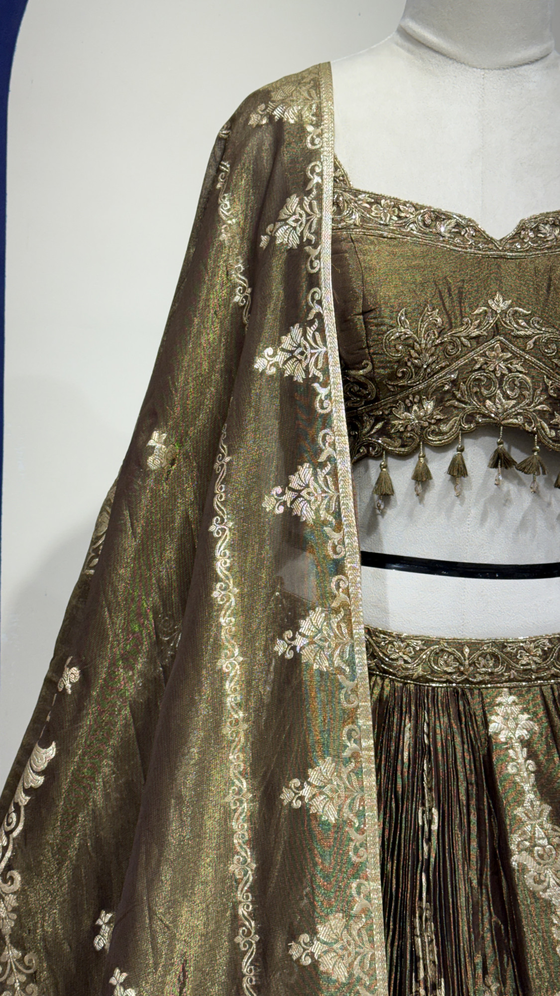 This olive-gold lehenga set features a delicately embroidered blouse with tassel detailing, a flowy lehenga adorned with intricate gold motifs, and a matching embroidered dupatta. The subtle shimmer and detailed craftsmanship make it perfect for weddings, festive celebrations, and special occasions.