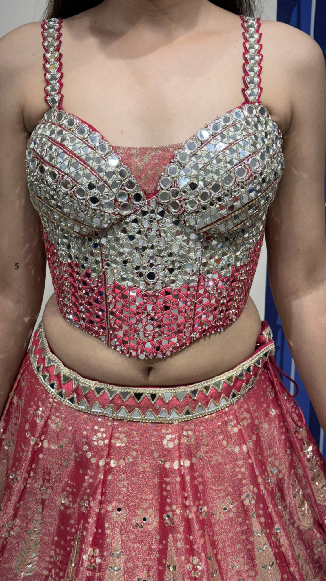 This elegant lehenga features a heavily embellished mirror-work blouse paired with a richly woven red skirt adorned with intricate motifs. Completed with a matching dupatta, it’s a perfect choice for weddings, festive celebrations, and special occasions.