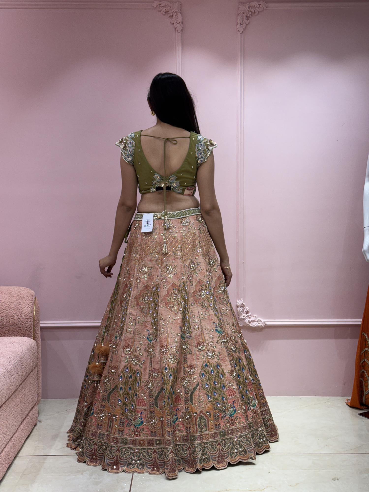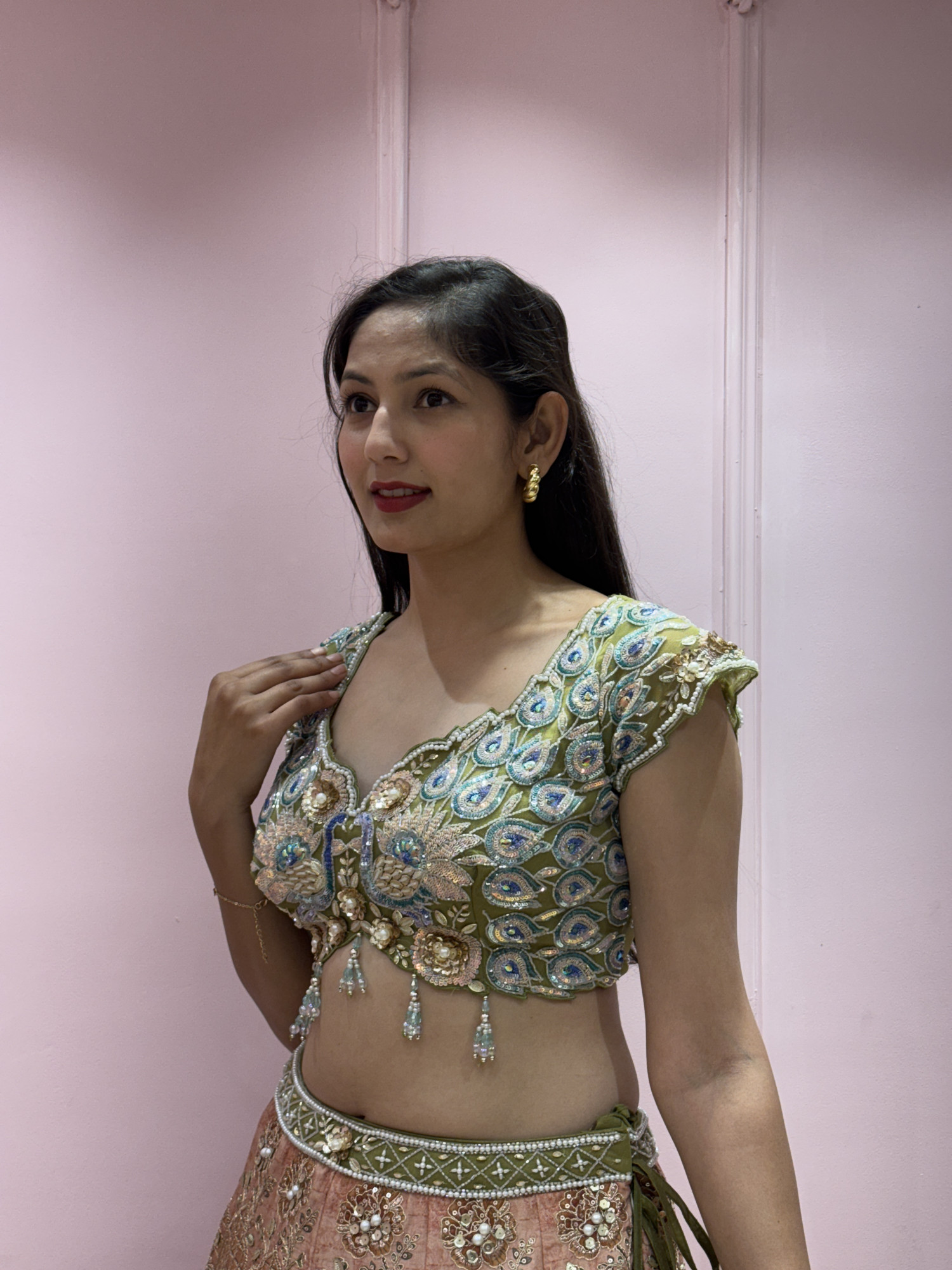 This lehenga set comes in a soft peach color with heavy embroidery and mirror work all over the skirt. The designs are detailed and give a rich, festive look. The blouse is green and features lovely peacock (mor) embroidery with beads and hanging tassels at the front, making it the highlight of the outfit. It has cap sleeves and a tie-up back for a stylish finish. The light green net dupatta has a red and gold border, adding a nice contrast to the outfit. Overall, this lehenga looks elegant, colorful, and perfect for weddings, receptions, or special celebrations.