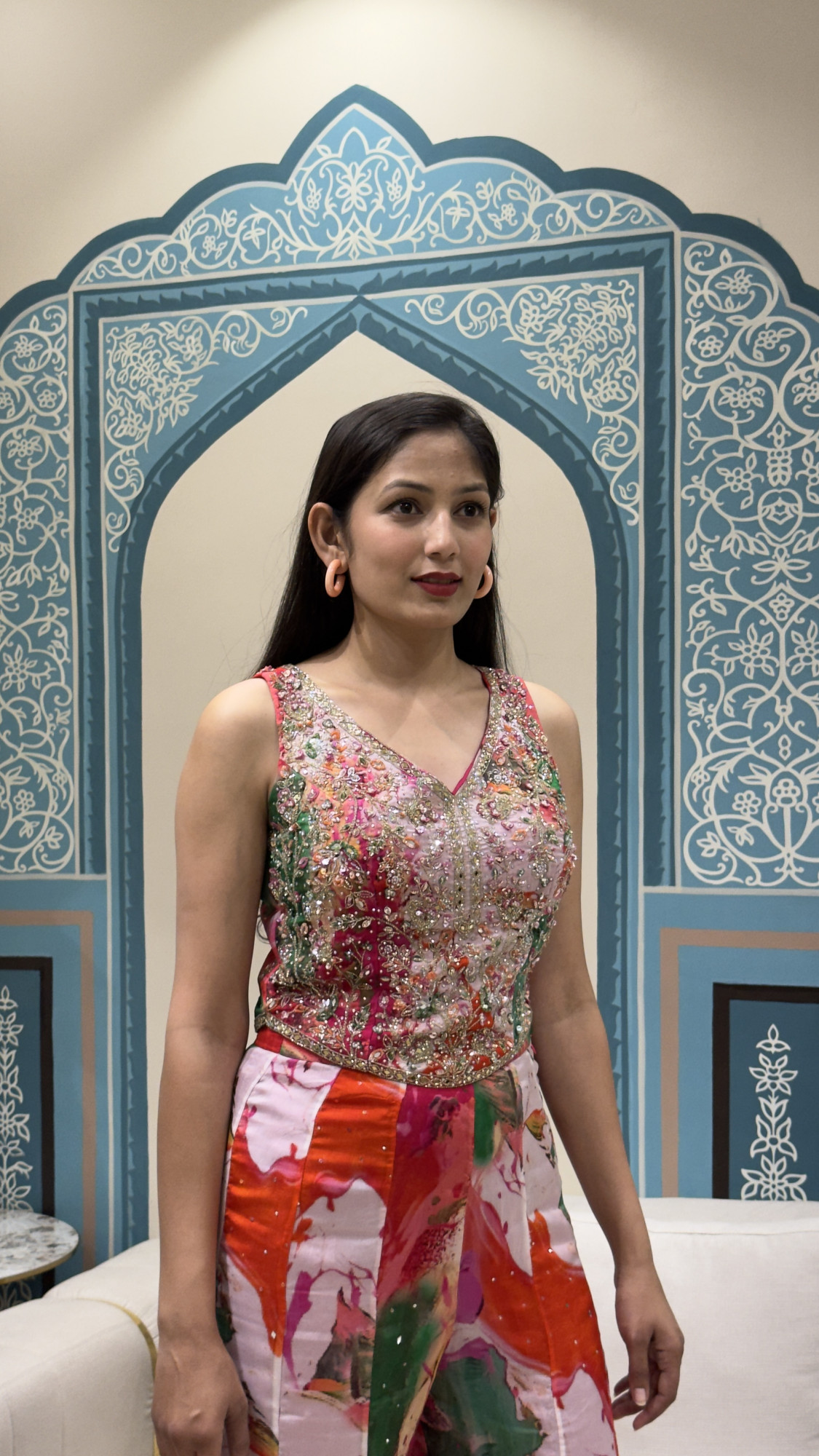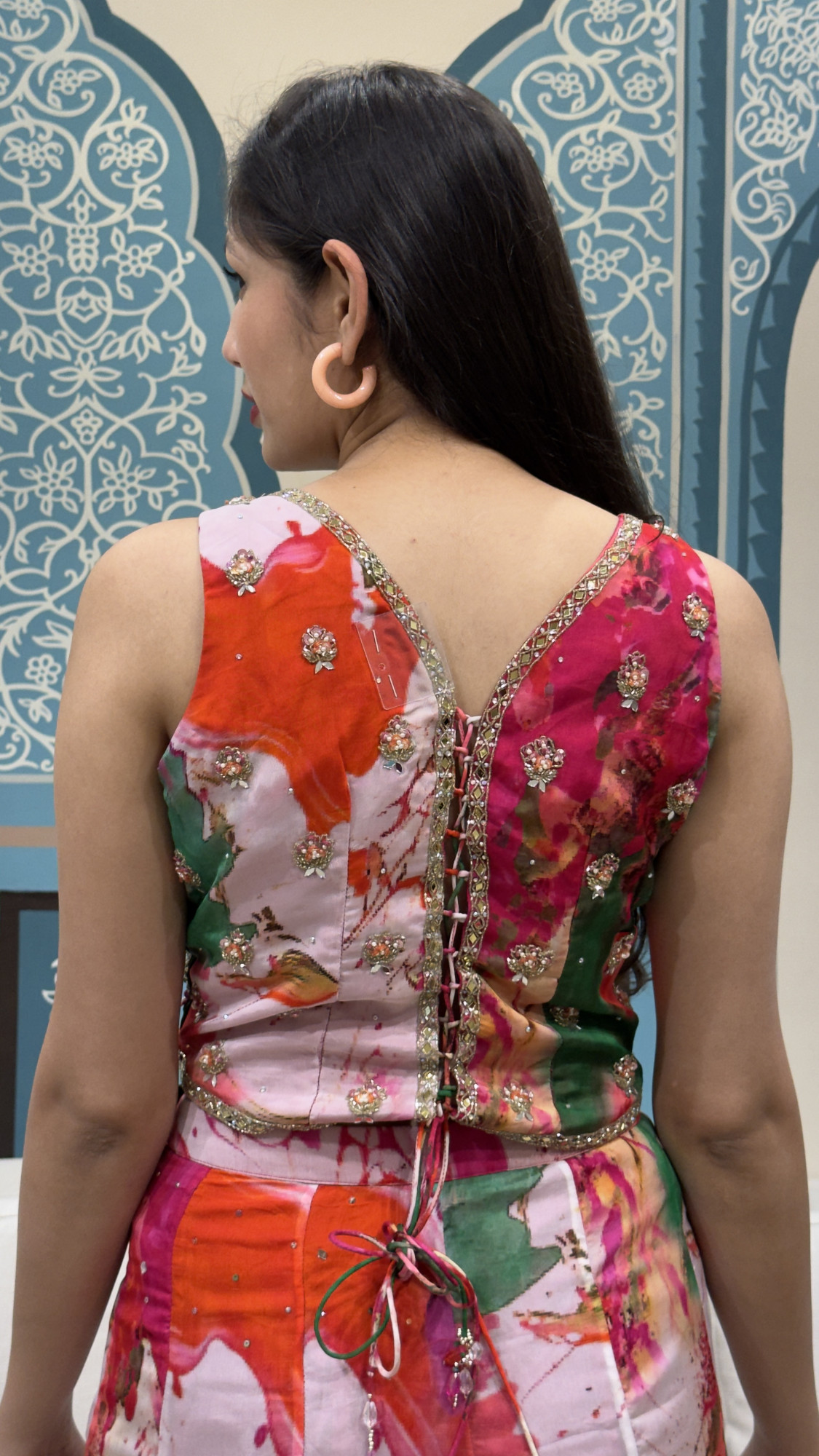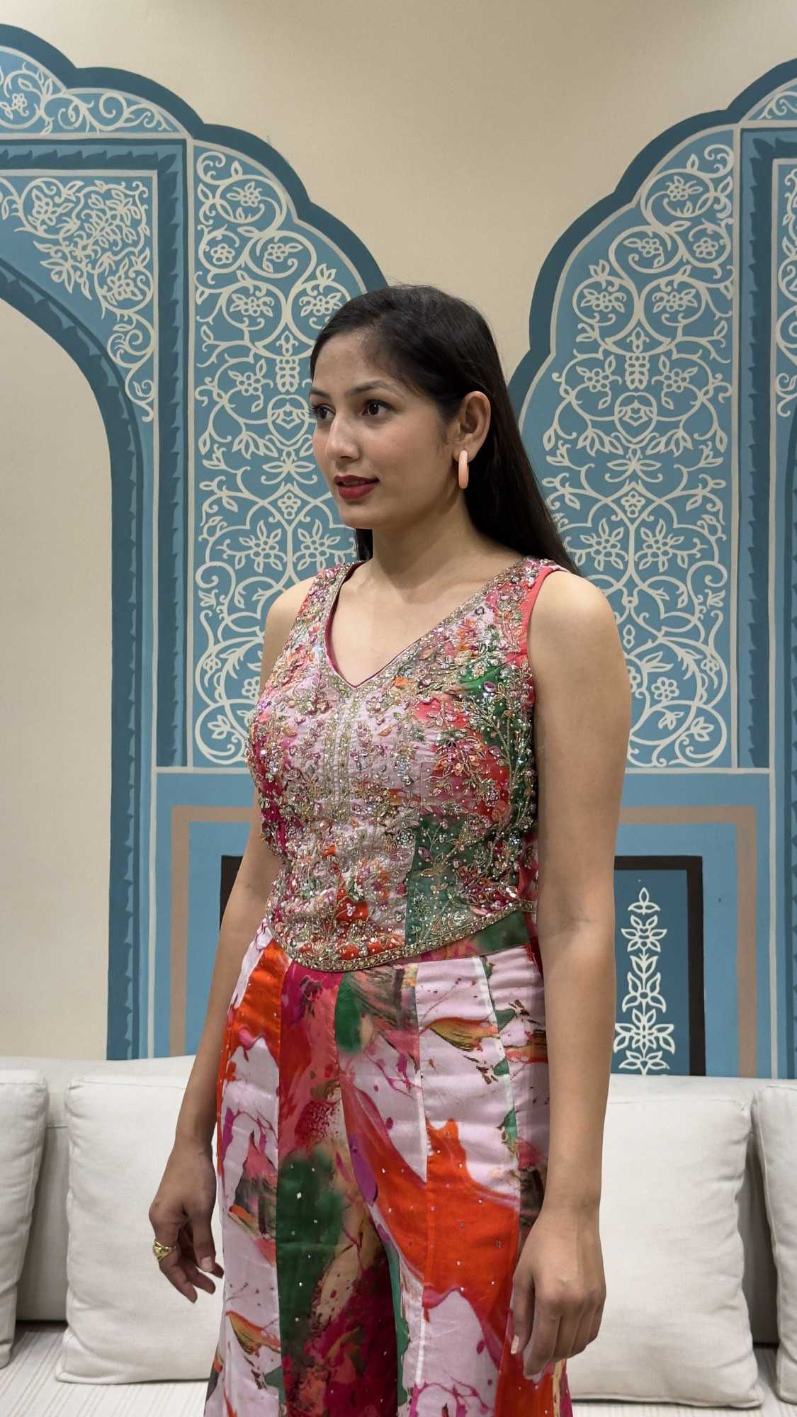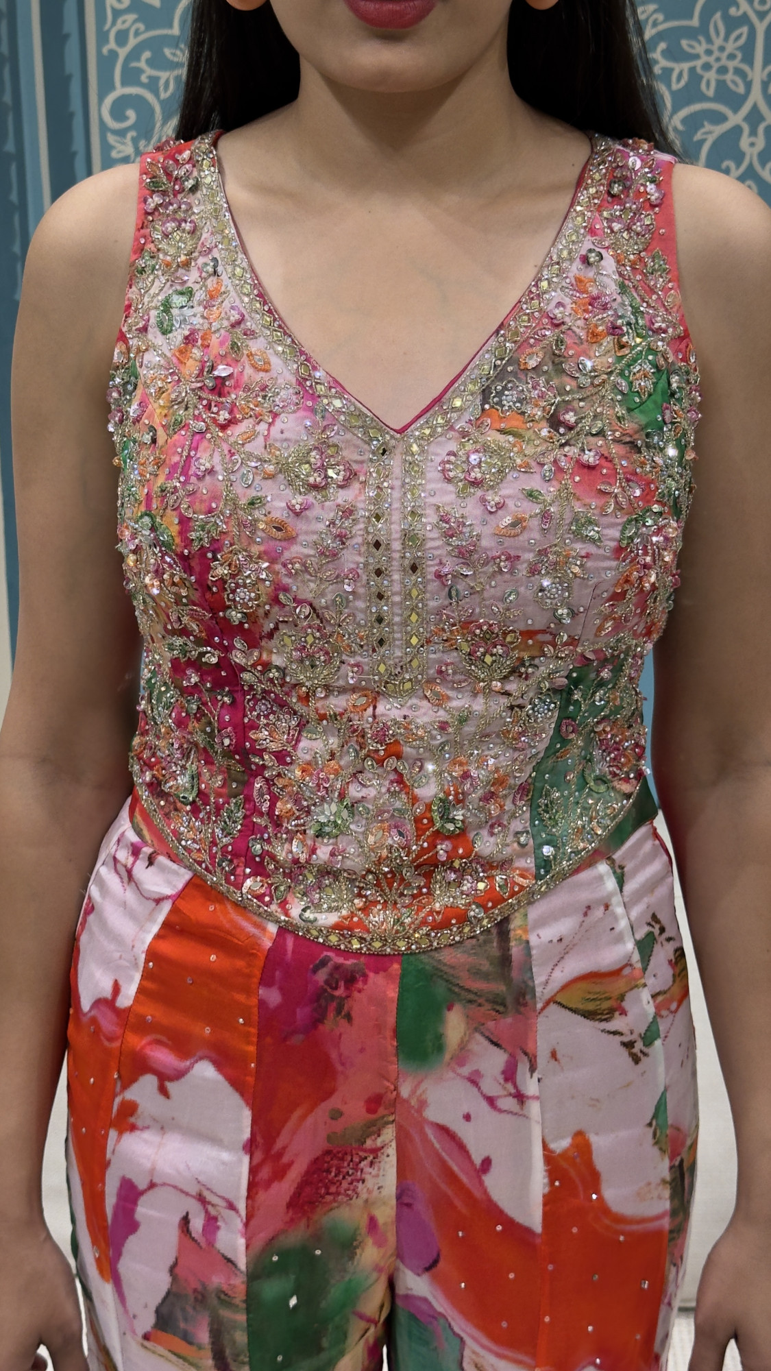 Add a pop of colour to your ethnic wardrobe with this stunning printed palazzo set featuring bold abstract floral tones in pink, orange, green, and white. The sleeveless V-neck blouse is beautifully handcrafted with heavy mirror, bead, and sequin embroidery, giving it a rich festive finish. The palazzo pants come in a flowy, comfortable silhouette with the same vibrant print, making the outfit stylish yet easy to carry. The back lace-up detailing adds a modern touch and ensures a perfect fit. Ideal for daytime weddings, haldi/mehendi, festive gatherings, and brunch celebrations—this look is all about fresh, fun, and glamorous vibes.