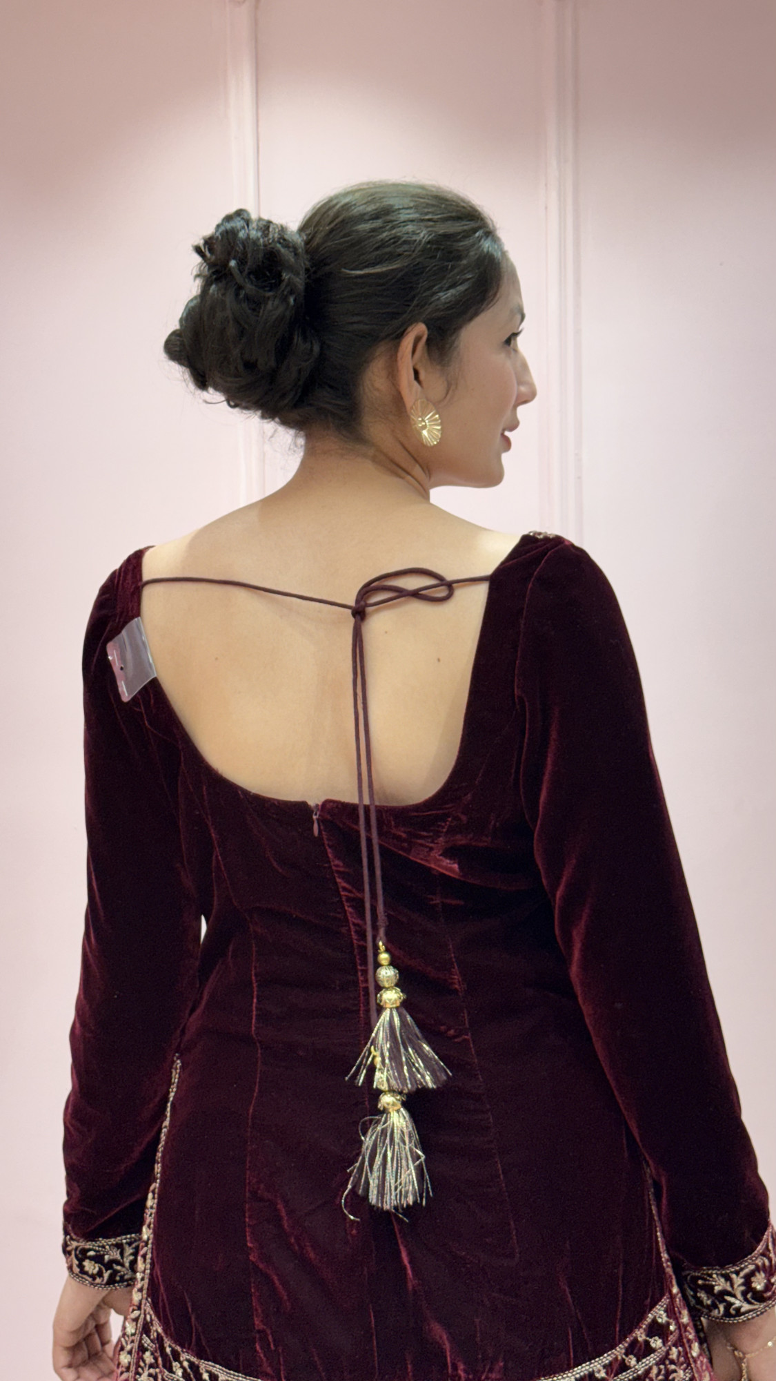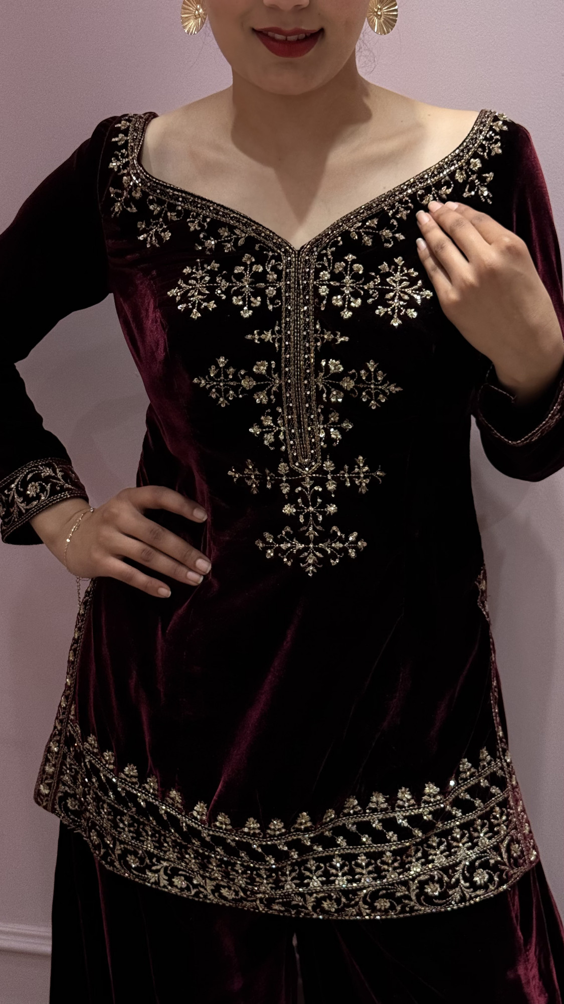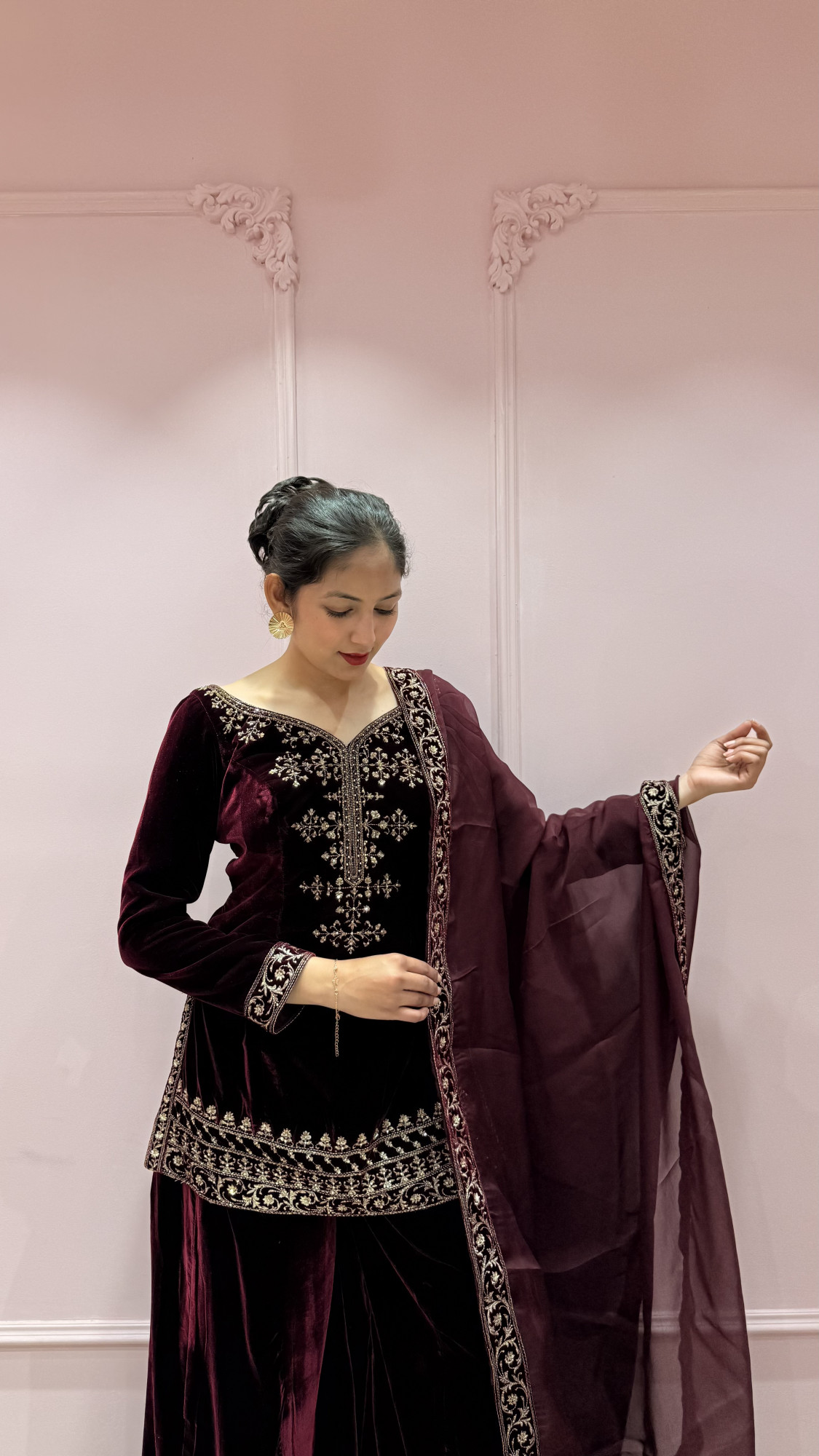 This wine velvet ensemble features delicate gold embroidery that adds a refined and graceful touch. The soft velvet fabric gives a rich feel, while the matching dupatta completes the look beautifully. Simple yet elegant, this outfit is perfect for festive celebrations, family functions, and evening gatherings.