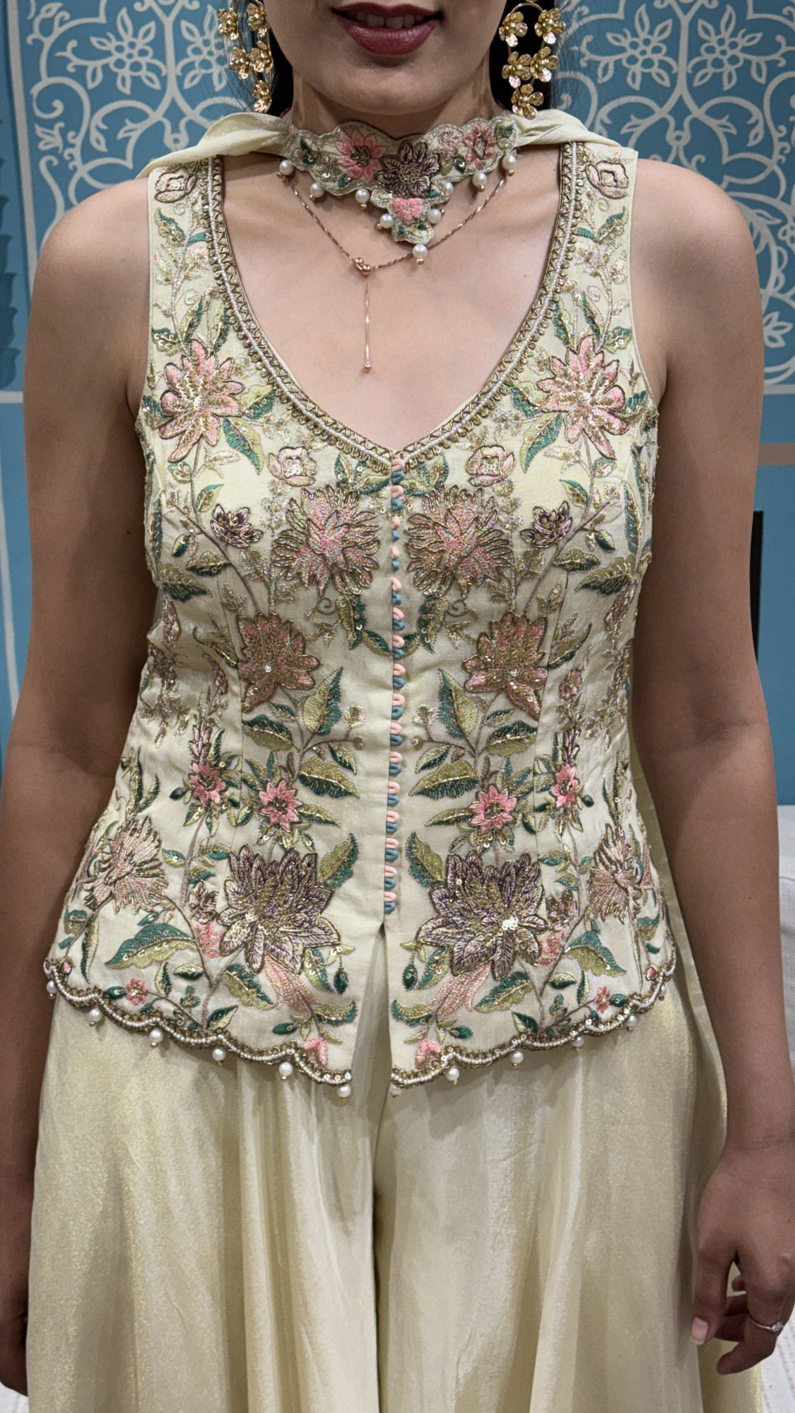 This ivory palazzo kurti is crafted with intricate floral embroidery in pastel tones, highlighted with fine detailing along the neckline and hem. Paired with breezy palazzo pants, it offers a graceful flow and effortless comfort. Perfect for festive gatherings, day weddings, and elegant celebrations.