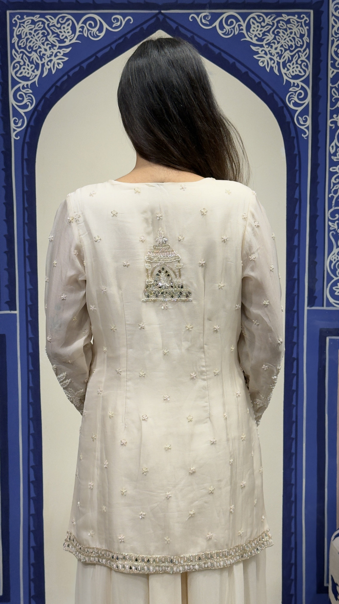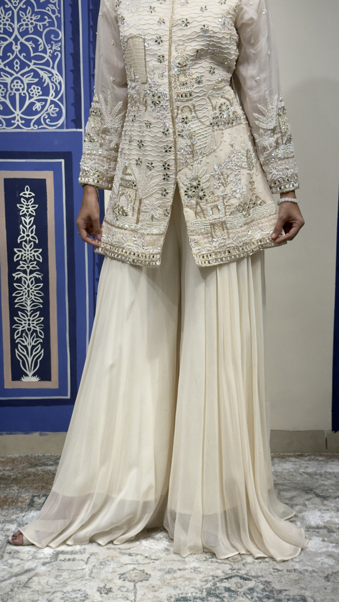 This refined ivory ensemble showcases intricate thread embroidery combined with delicate mirror and bead embellishments that create a luxurious yet subtle statement. The jacket-style kurta features beautiful architectural and floral motifs, adding a unique artistic charm to the design. Sheer embroidered sleeves and finely detailed borders enhance the elegance of the outfit. It is paired with soft, flowy sharara pants that add movement and a graceful silhouette. Perfect for festive occasions, intimate weddings, and elegant celebrations, this outfit embodies timeless sophistication with a modern touch. ✨