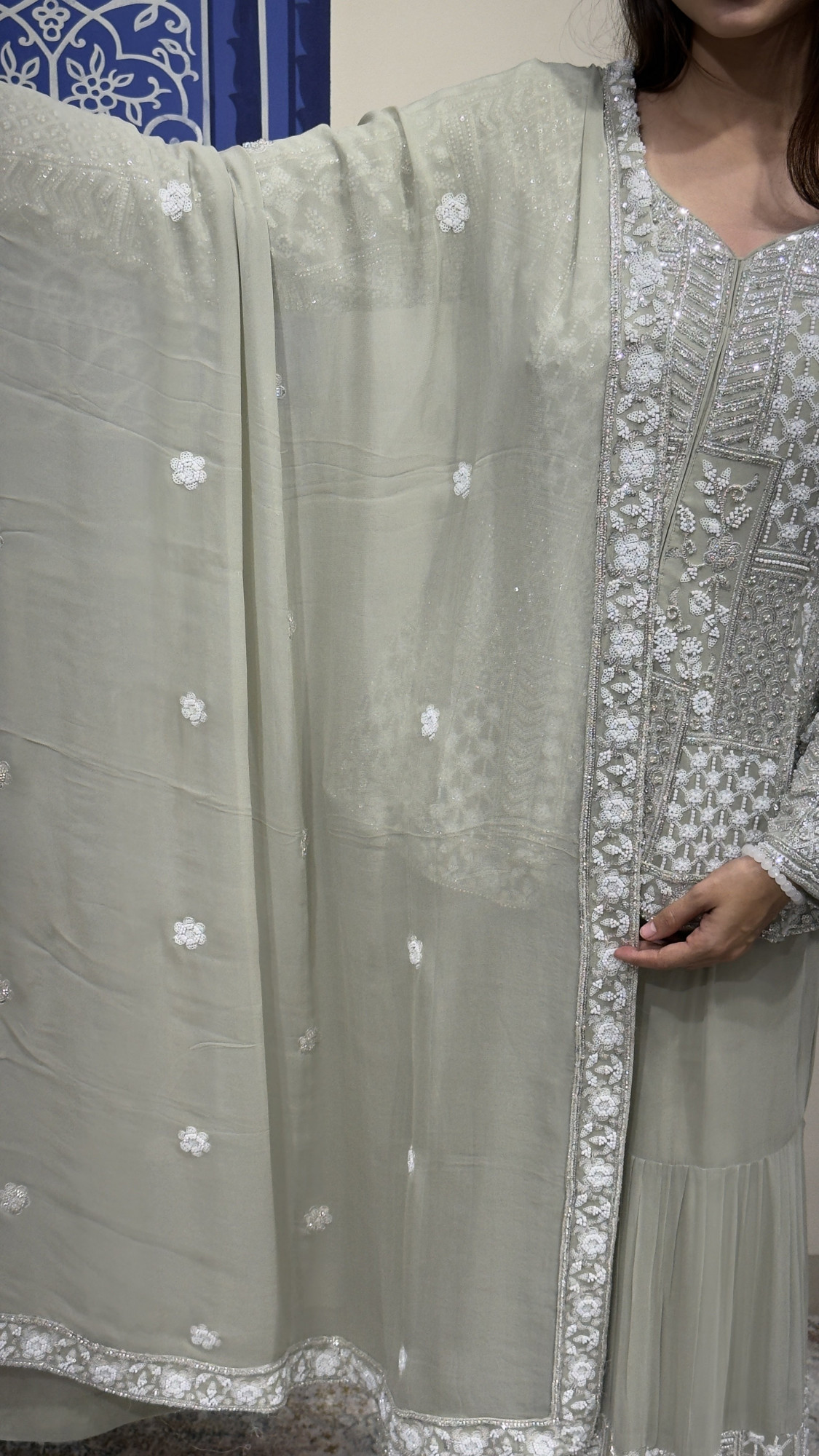 This beautiful sage green ensemble showcases intricate thread and sequin embroidery arranged in elegant geometric and floral patterns across the kurta. The richly detailed design adds depth and texture, giving the outfit a luxurious appeal. It is paired with soft, flowy sharara pants featuring embroidered panels at the hem for added elegance. The look is completed with a lightweight dupatta adorned with subtle embroidered motifs and a delicate border. Perfect for festive occasions, wedding functions, and celebrations, this outfit blends sophistication with timeless charm. ✨