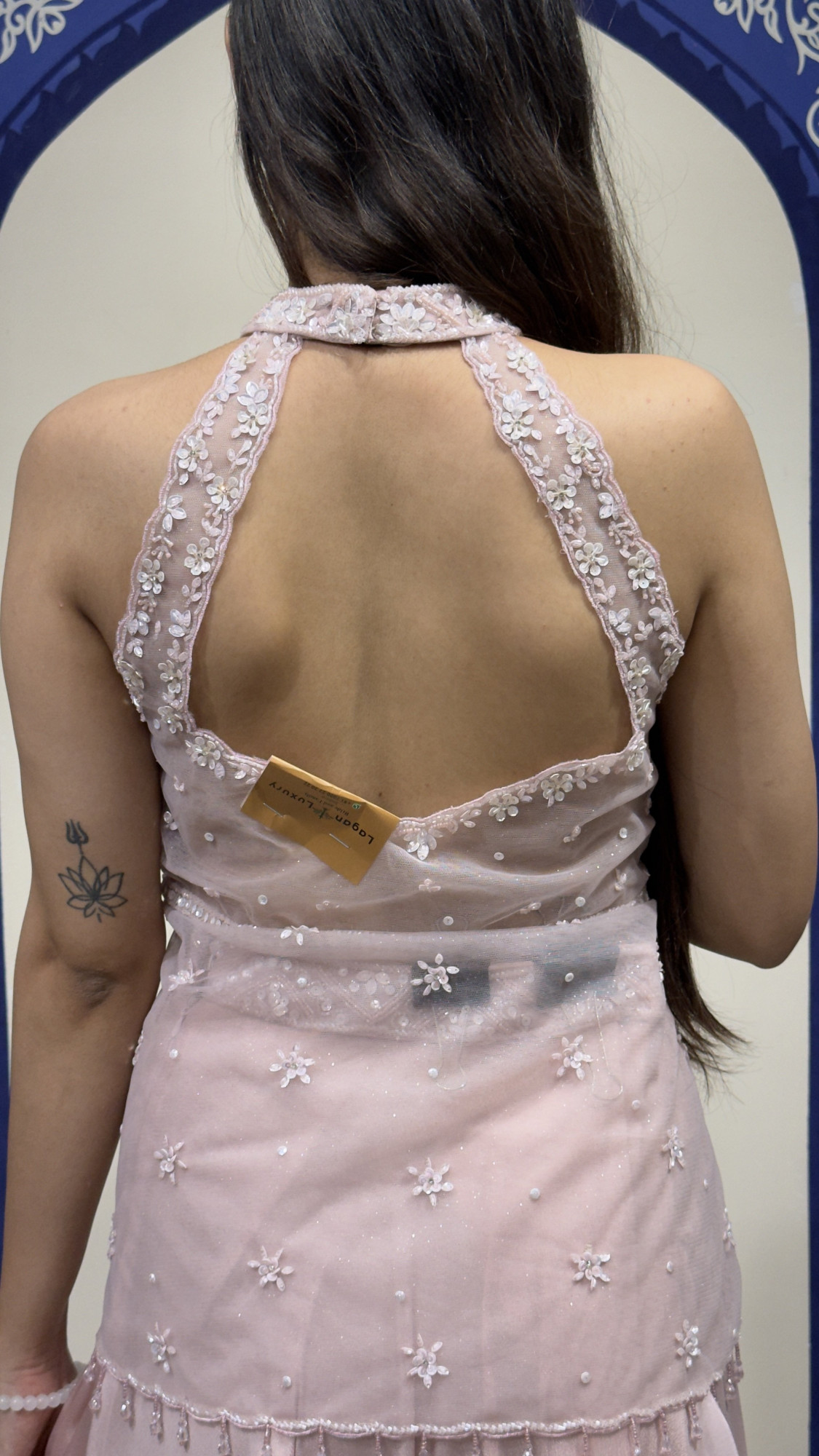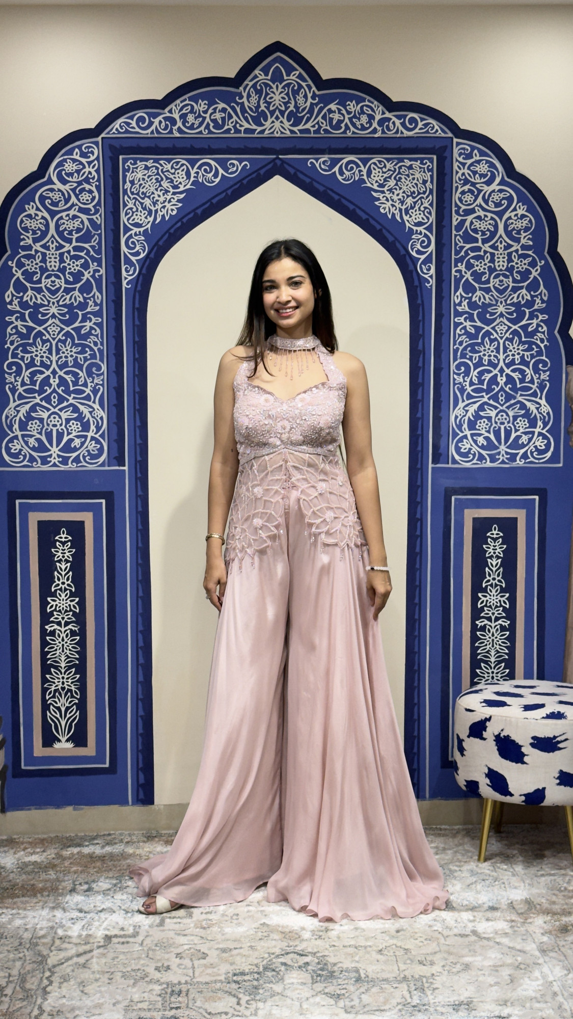 This elegant blush pink jumpsuit blends contemporary style with delicate craftsmanship. The bodice features intricate floral embroidery and subtle beadwork that adds texture and sophistication. Designed with a stylish halter neckline and soft dangling embellishments, it beautifully frames the neckline while offering a refined silhouette. The fitted upper bodice transitions into flowing wide-leg pants made from lightweight fabric, creating a graceful and comfortable drape. The open-back design adds a modern touch, making this outfit perfect for cocktail events, receptions, and festive celebrations where effortless elegance is desired.
