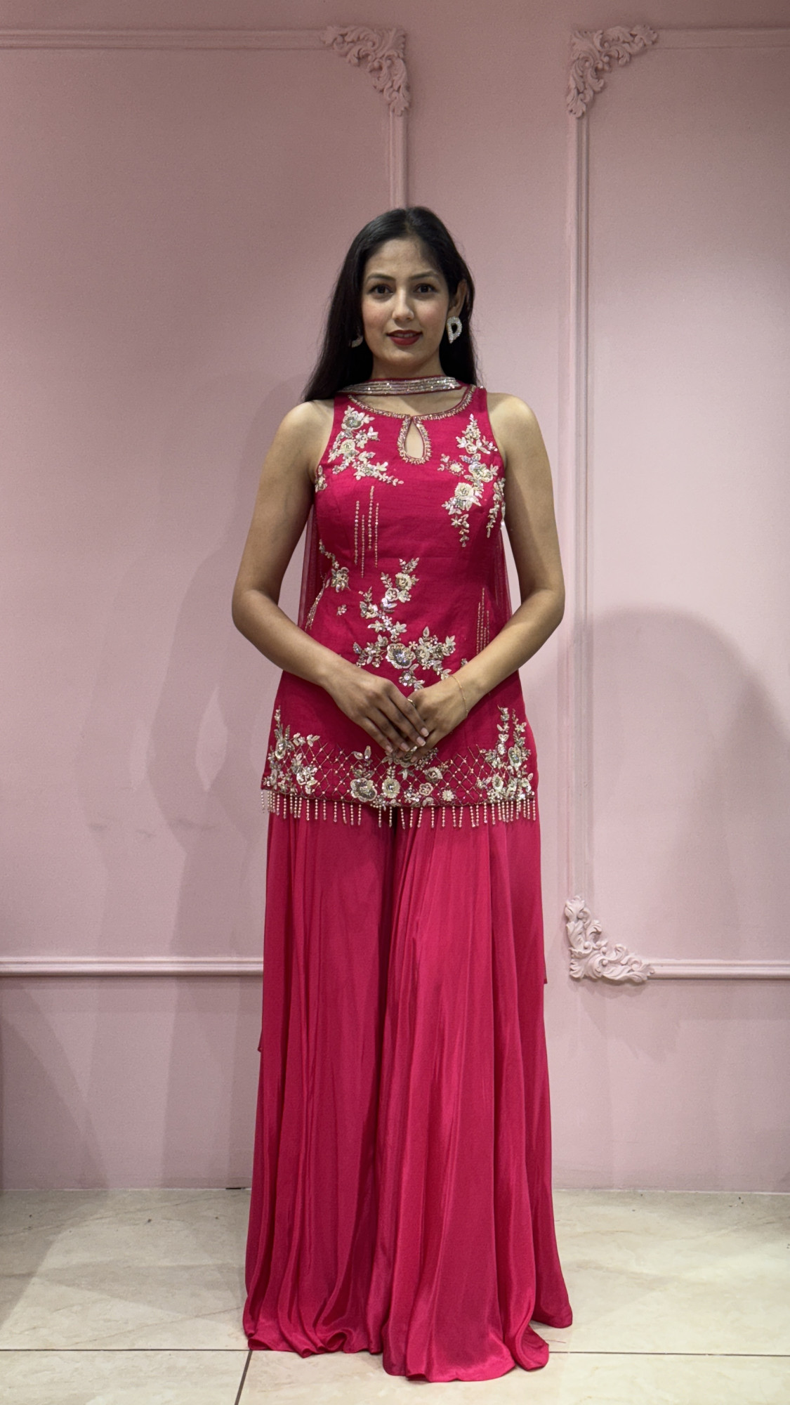 This stunning fuchsia pink palazzo kurti set is designed to make you stand out with its rich color and delicate craftsmanship. The kurti features a classy high neck with a keyhole cut, enhanced with beautiful silver zari and sequin floral embroidery spread across the front. The hemline is finished with a unique lattice border and pearl tassel detailing, adding a luxe festive vibe.