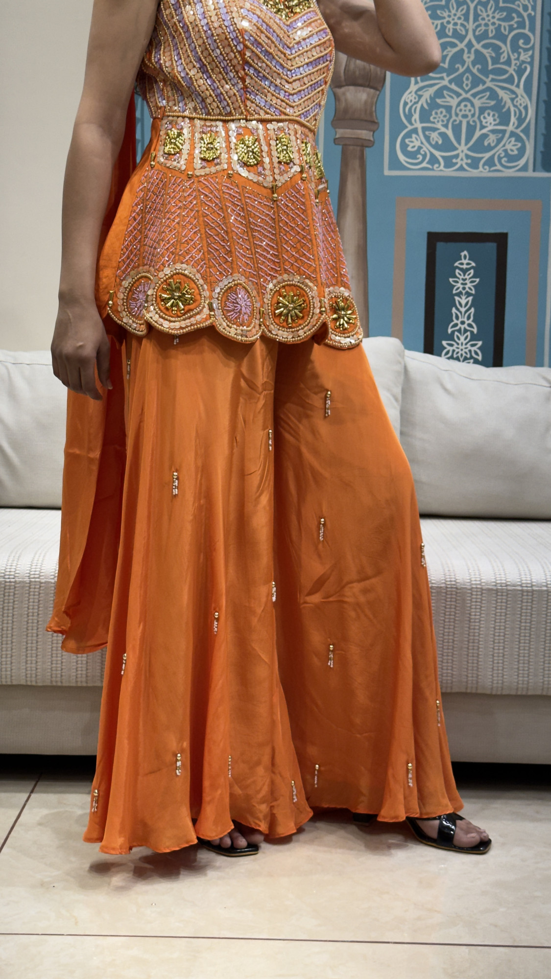 This eye-catching palazzo kurti set comes in a rich orange shade with beautiful multicolor mirror work and golden embellishments all over the kurti. The kurti features a stylish flared peplum pattern with a scalloped hemline, detailed with statement motifs and intricate handwork that gives it a very festive look. It is paired with comfortable wide-leg palazzo pants with delicate sequin buttis for an elegant finish. Completed with a matching dupatta, this outfit is lightweight, comfortable, and perfect for occasions like haldi, mehendi, festive parties, and traditional celebrations.
