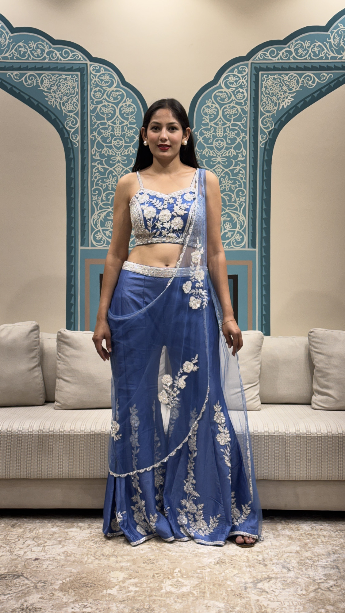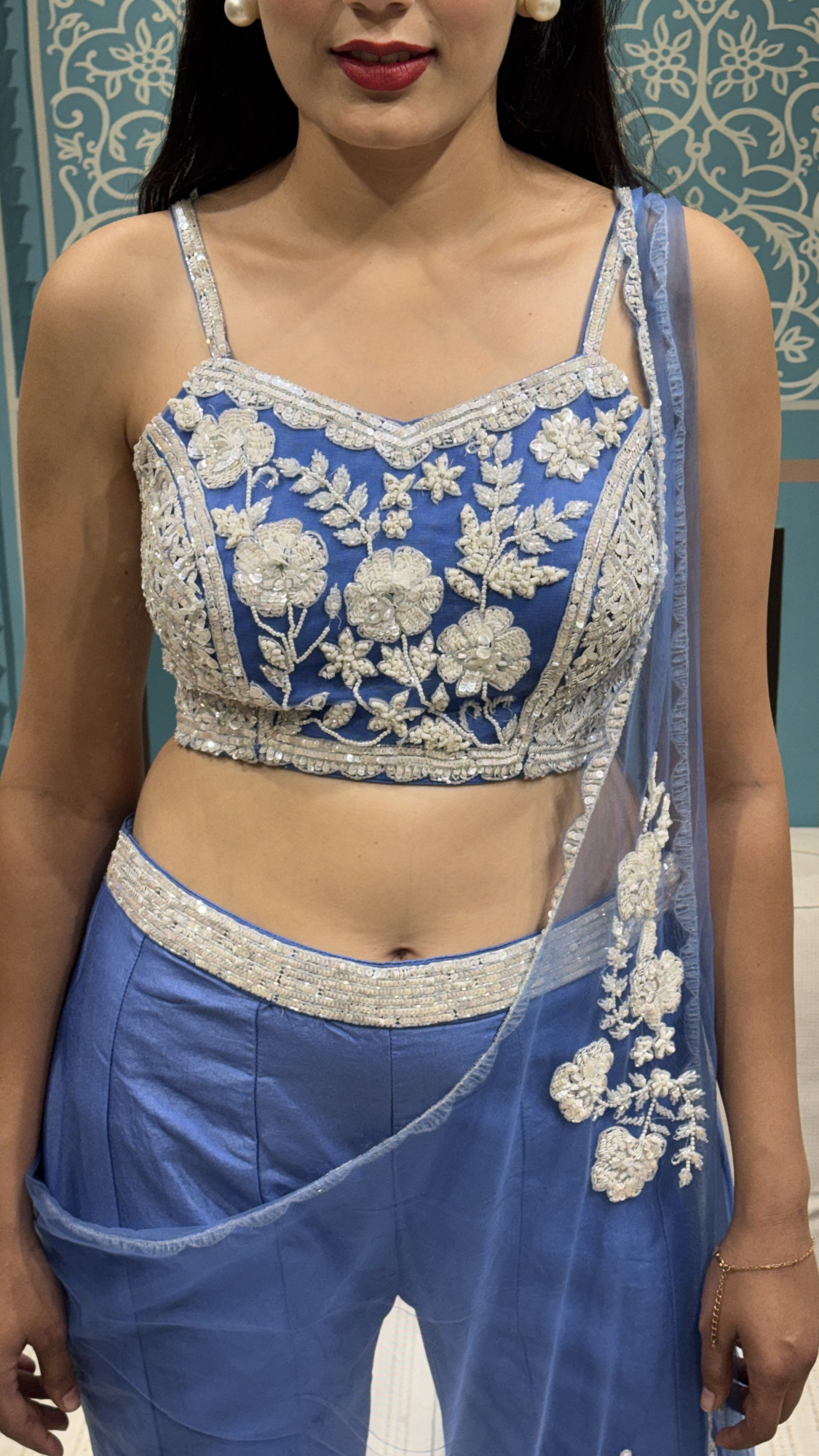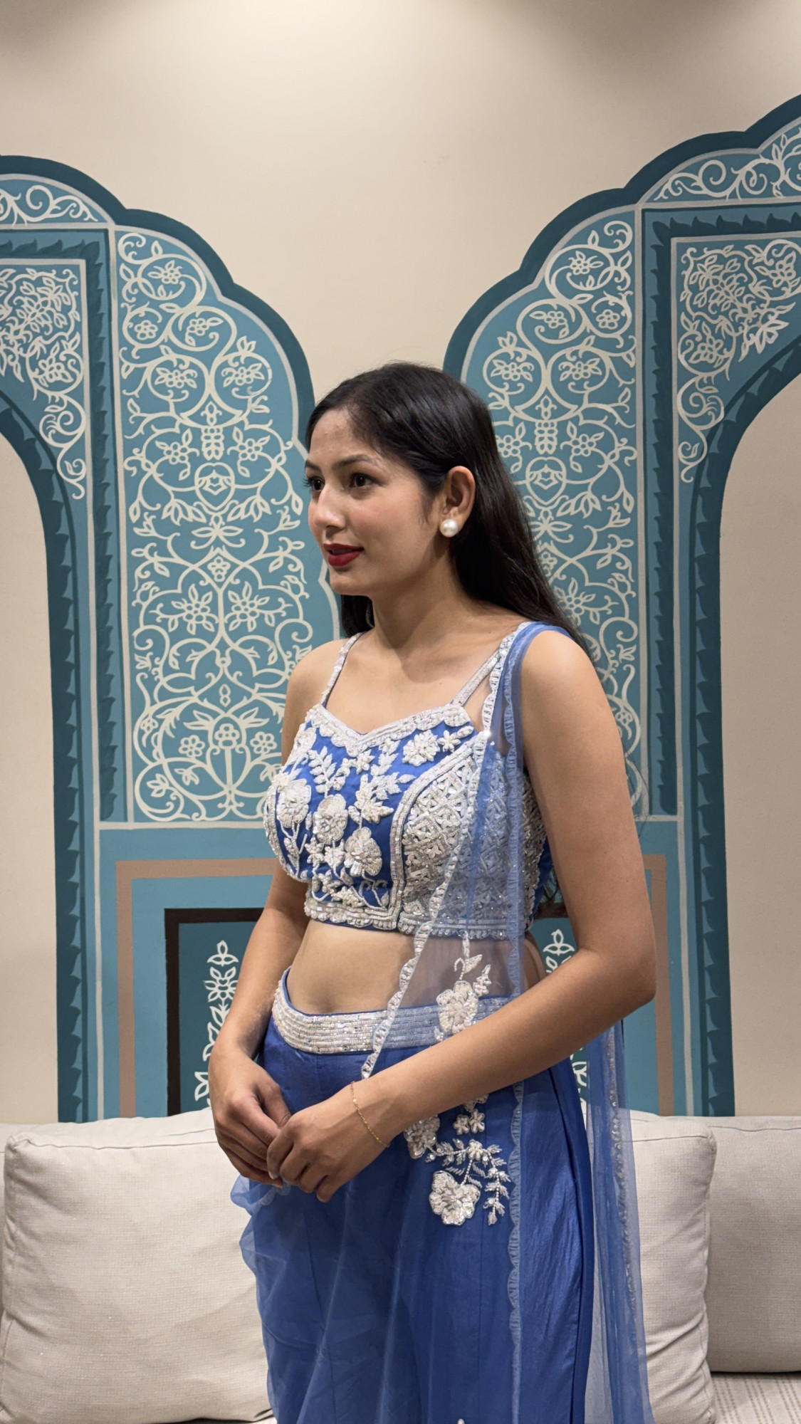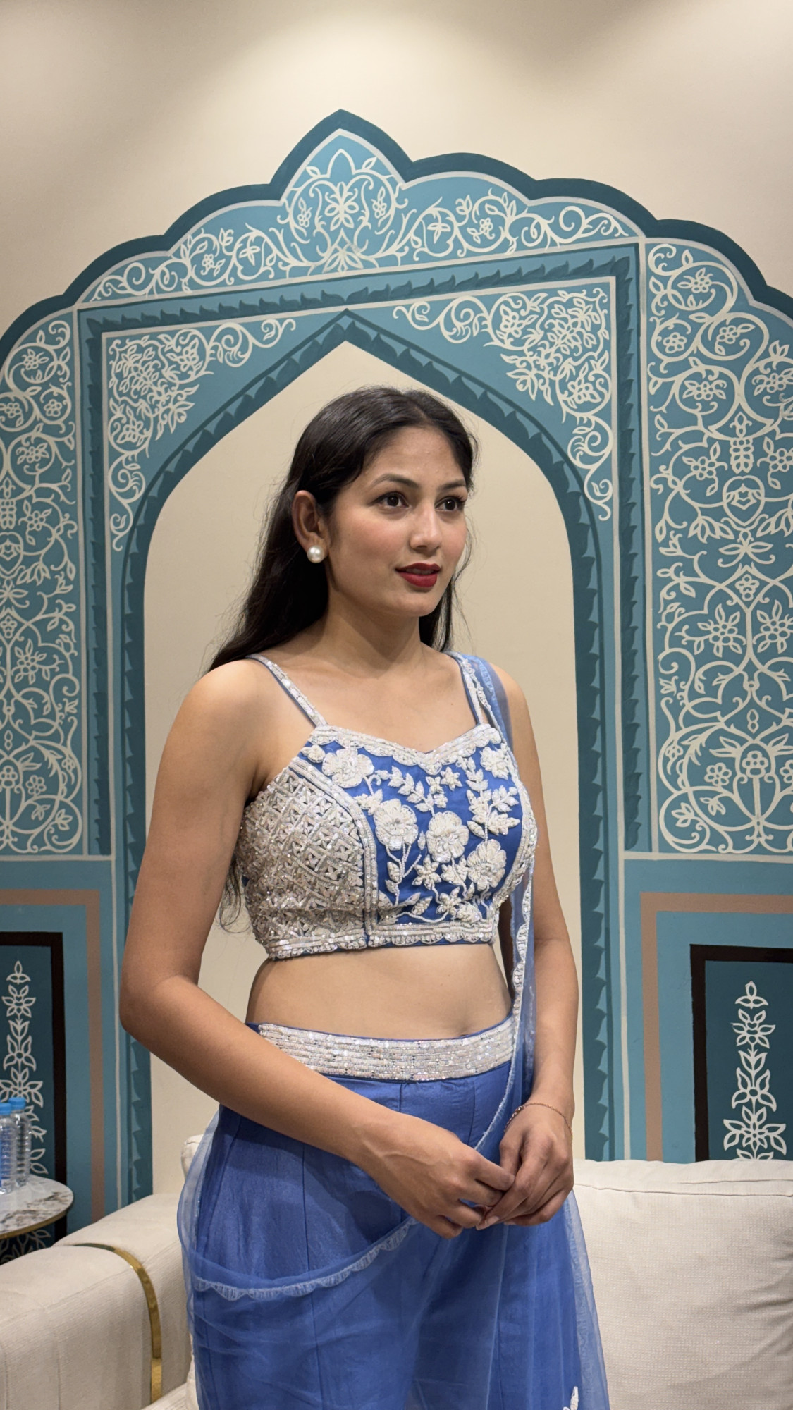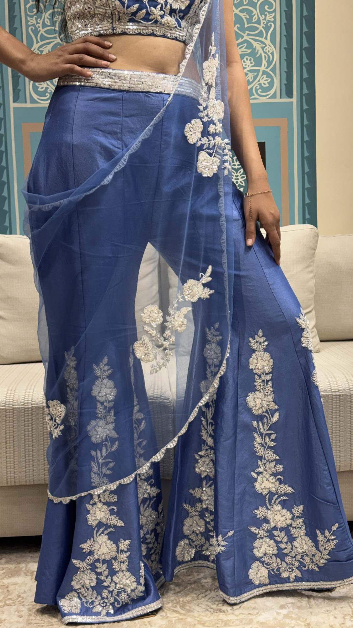 This cobalt blue plazzo with drape set features delicate floral embroidery on the blouse, paired with elegant palazzo pants and a soft sheer dupatta. Light, graceful, and effortlessly stylish—perfect for cocktails, festive gatherings, mehendi functions, and intimate celebrations.