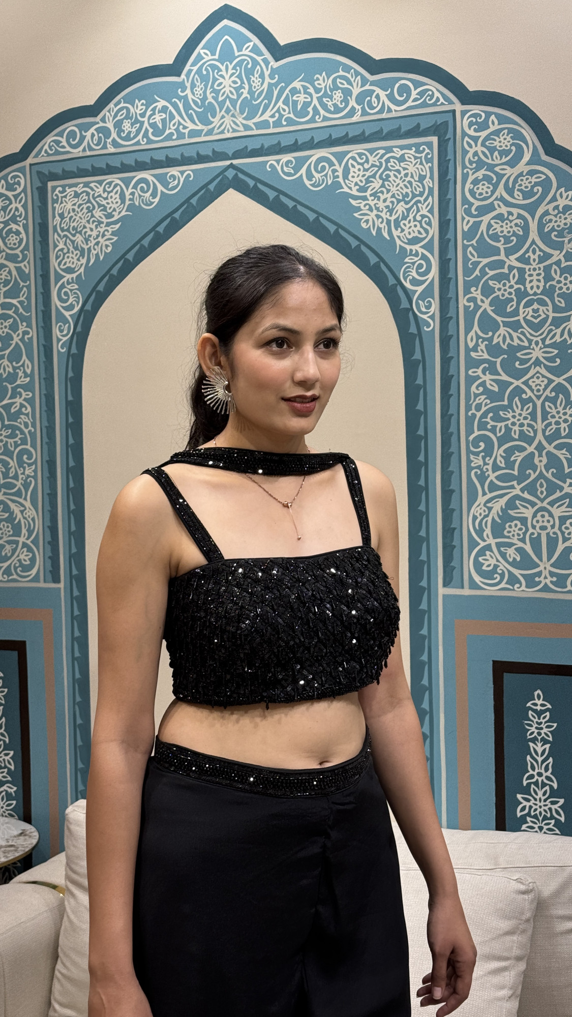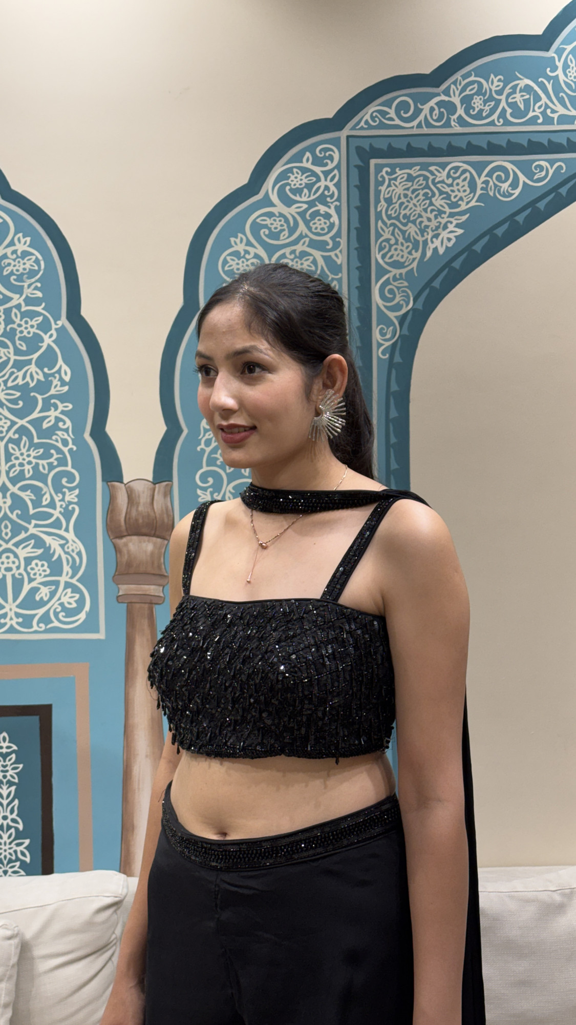 This chic black crop top and palazzo set is designed for effortless evening glamour, featuring a heavily embellished crop top with delicate sequin detailing, slim shoulder straps, and a stylish choker-style neckline that adds a contemporary touch. Paired with flowy high-waisted palazzo pants crafted in soft, fluid fabric, the ensemble offers a flattering fit with graceful movement. Perfect for cocktail parties, festive nights, and modern celebrations, this outfit blends subtle sparkle with understated elegance.