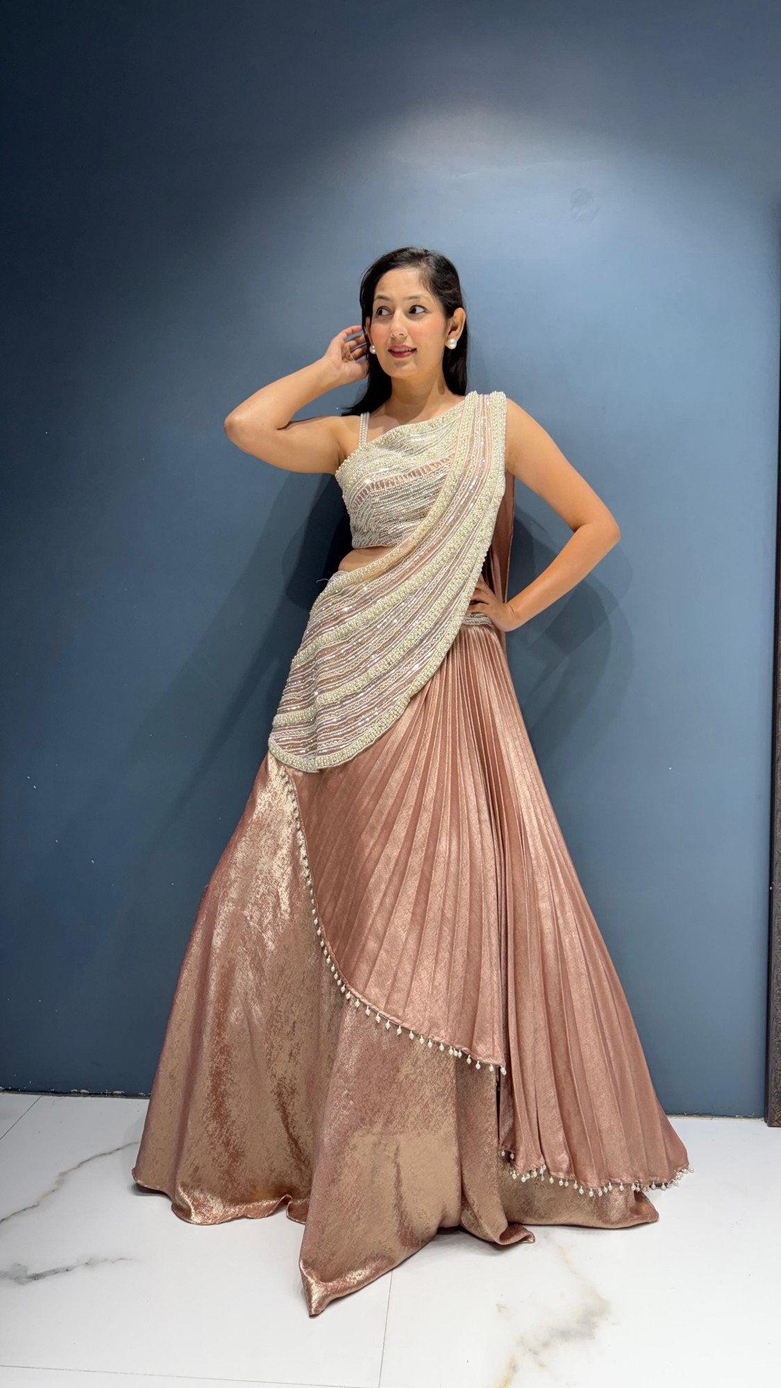 Entire top and hip panel covered in dense bands of minute rose gold glass beads and sequins for a liquid shimmer effect.