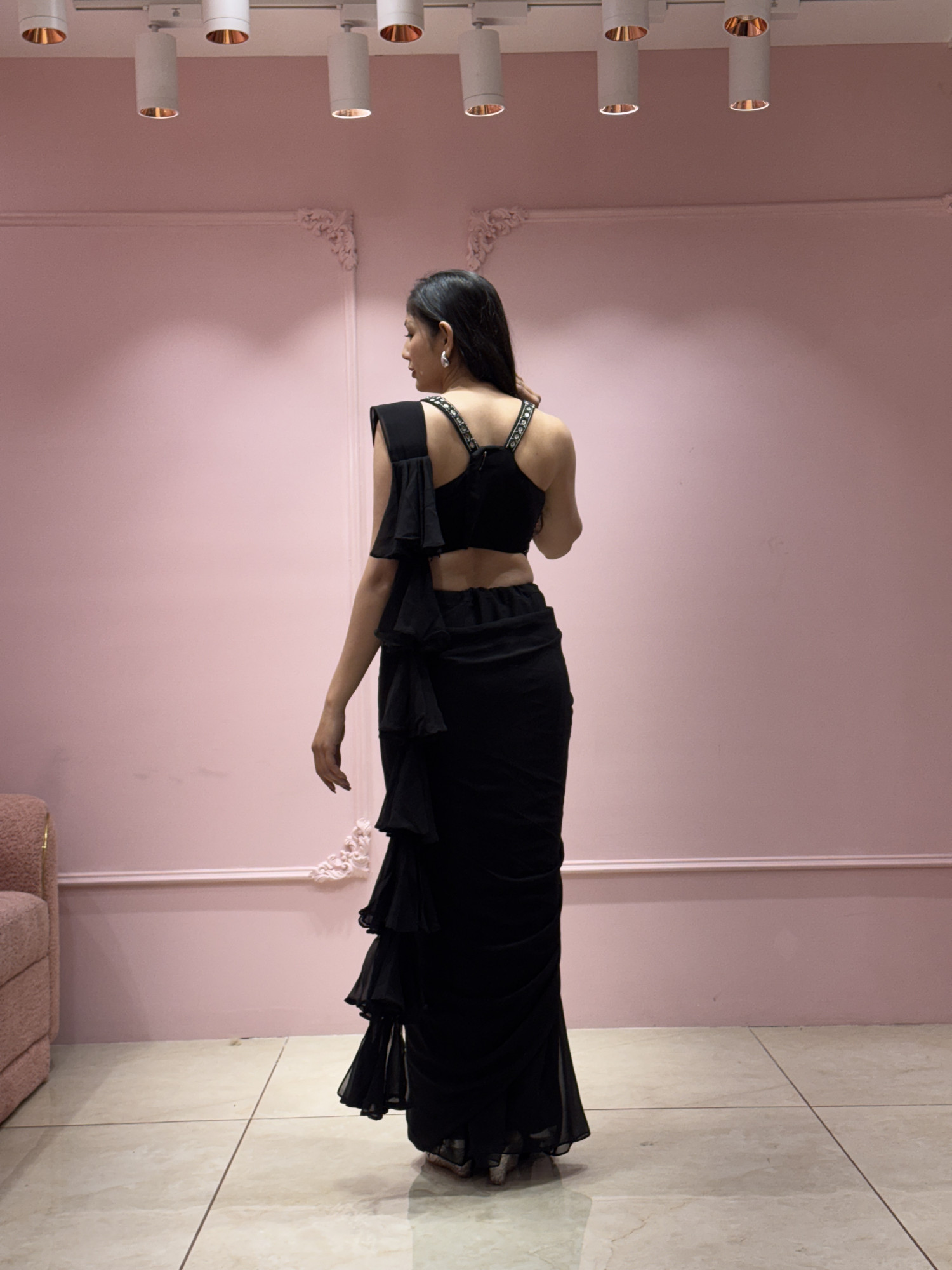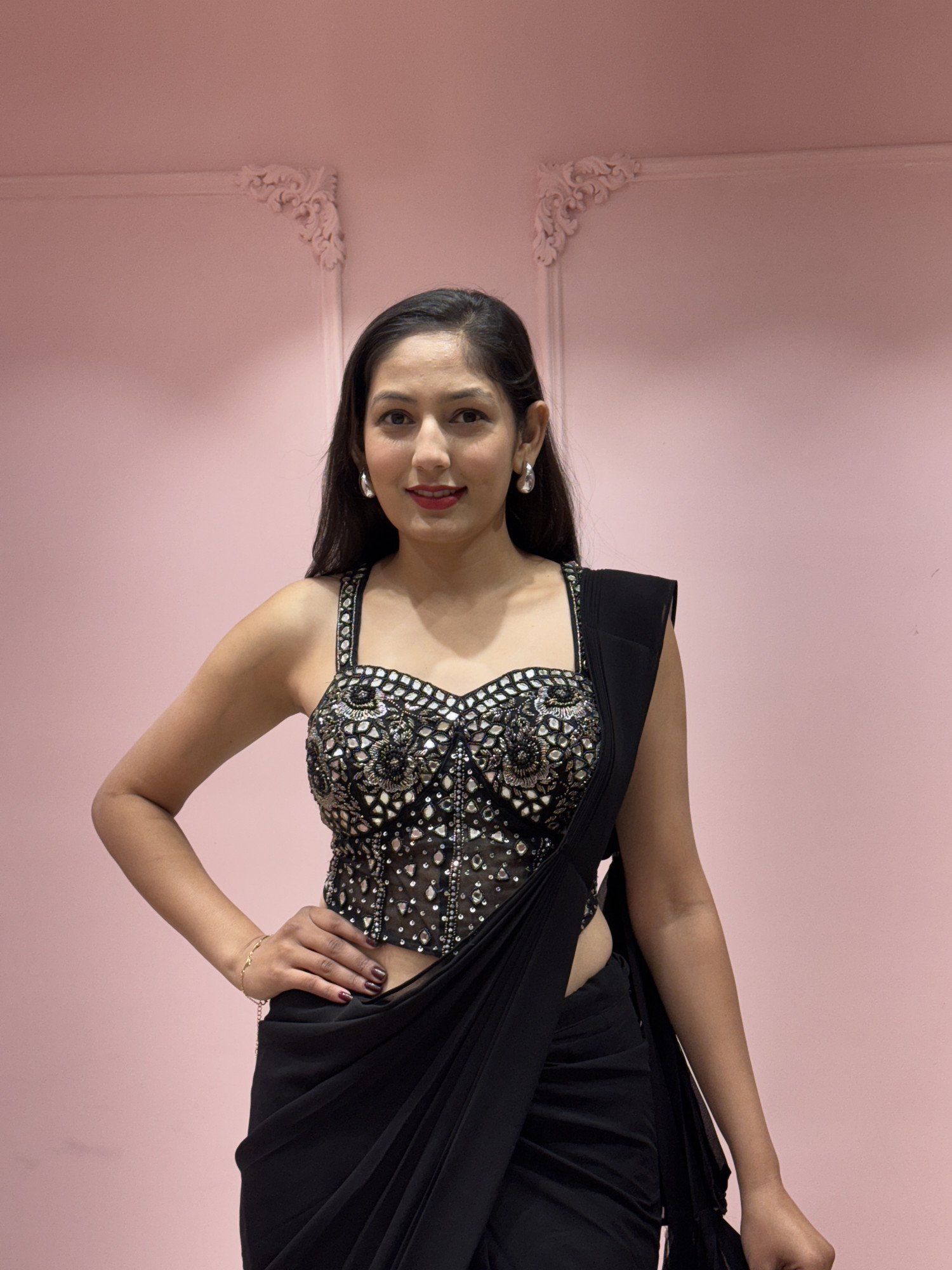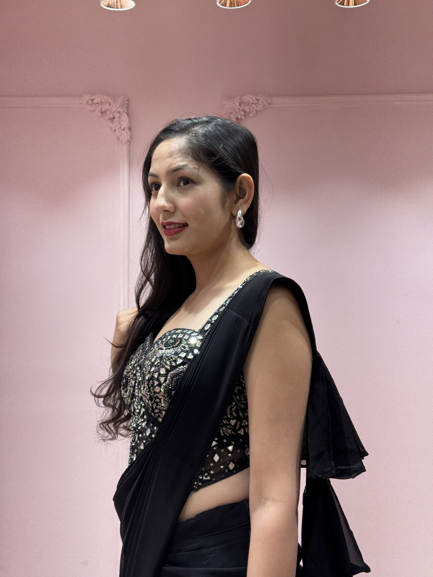 This black saree features a clean, fluid drape that creates a refined and flattering silhouette. It is styled with a structured blouse detailed with subtle mirror work and embroidery, adding just the right amount of texture and shine. Balanced and understated, this ensemble is ideal for evening events, cocktail gatherings, and contemporary festive wear.