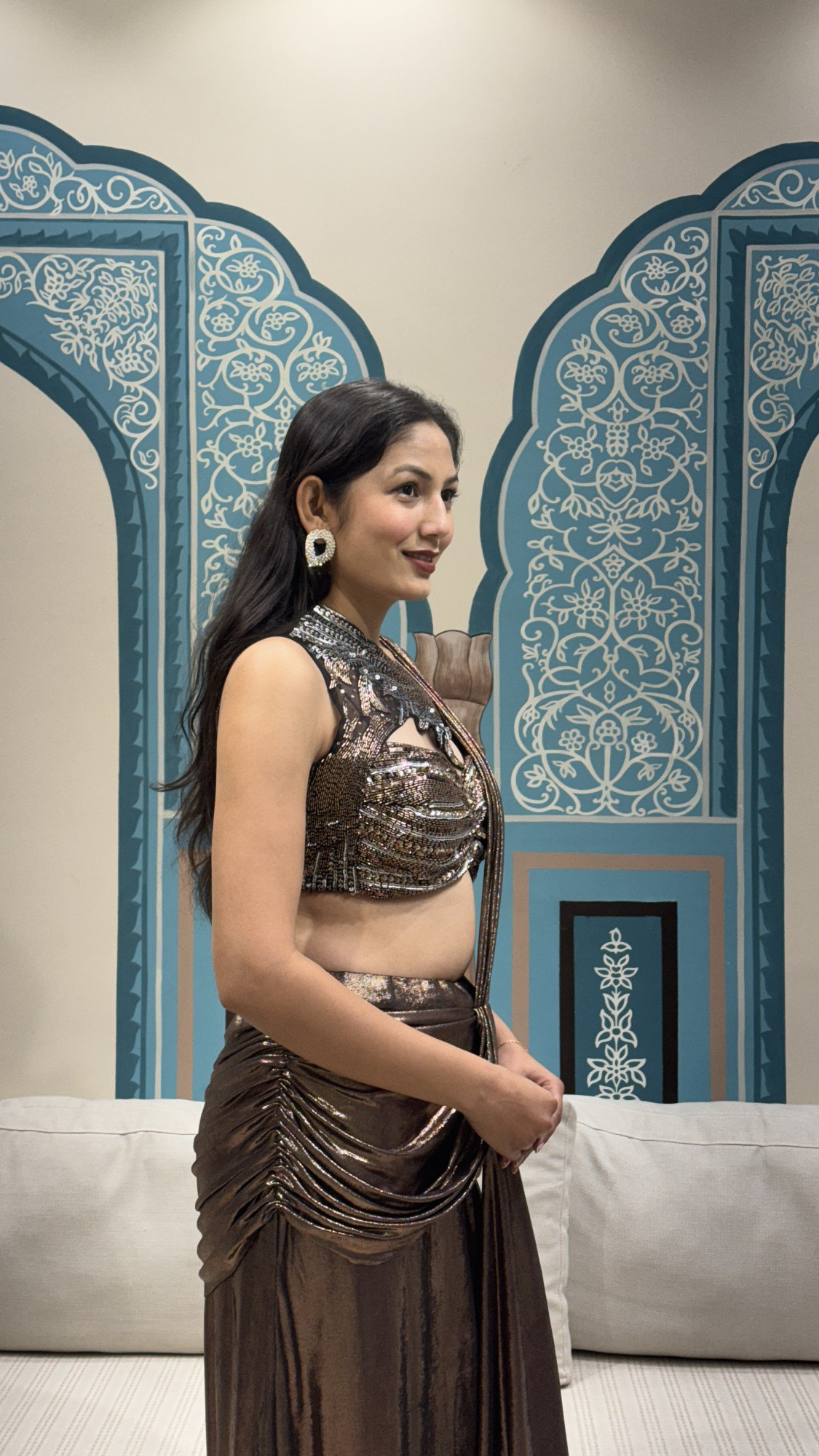This chic ready-to-wear saree is crafted in a lustrous metallic bronze fabric, pre-draped for ease and a flawless fit. The saree features a sleek, structured silhouette that highlights fluid pleats and a graceful fall. Paired with a statement blouse adorned with intricate bead and sequin embroidery, bold cut-out detailing, and an asymmetrical neckline, this ensemble delivers a high-fashion appeal. Perfect for cocktail parties, receptions, and evening celebrations, this ready saree blends comfort with couture-inspired sophistication.