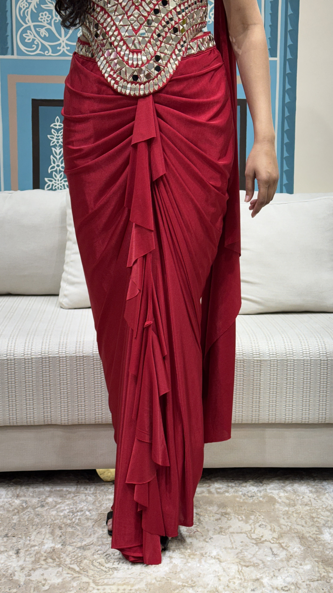 This statement red saree is designed as a single coordinated ensemble, featuring a fluid drape with elegant pleating and a structured corset-style blouse integrated into the look. The blouse is adorned with intricate mirror work and geometric detailing, complemented by slim embellished straps and a lace-up back for a flattering fit. Blending traditional draping with modern design, this saree is ideal for cocktail events, receptions, and standout festive occasions.