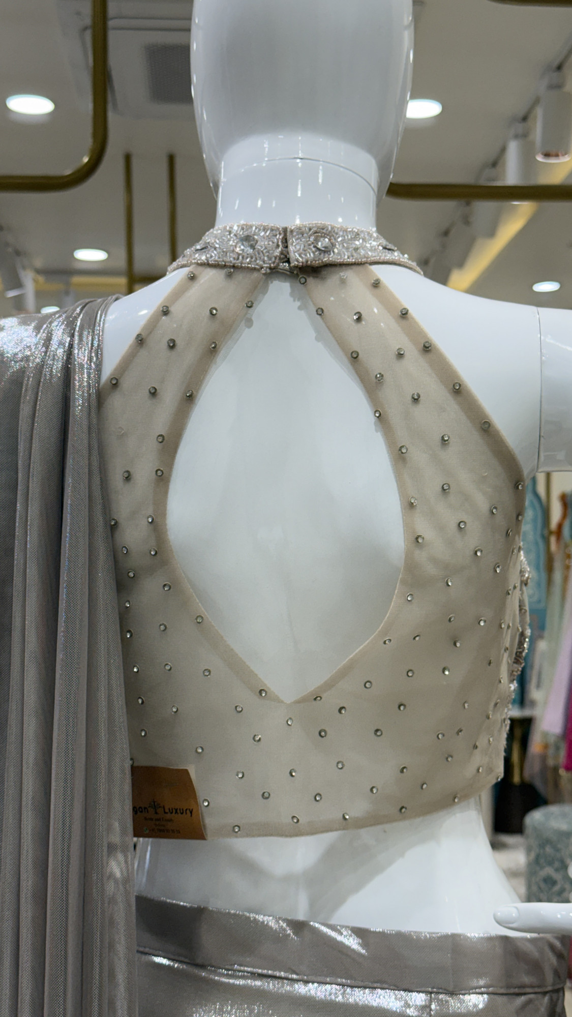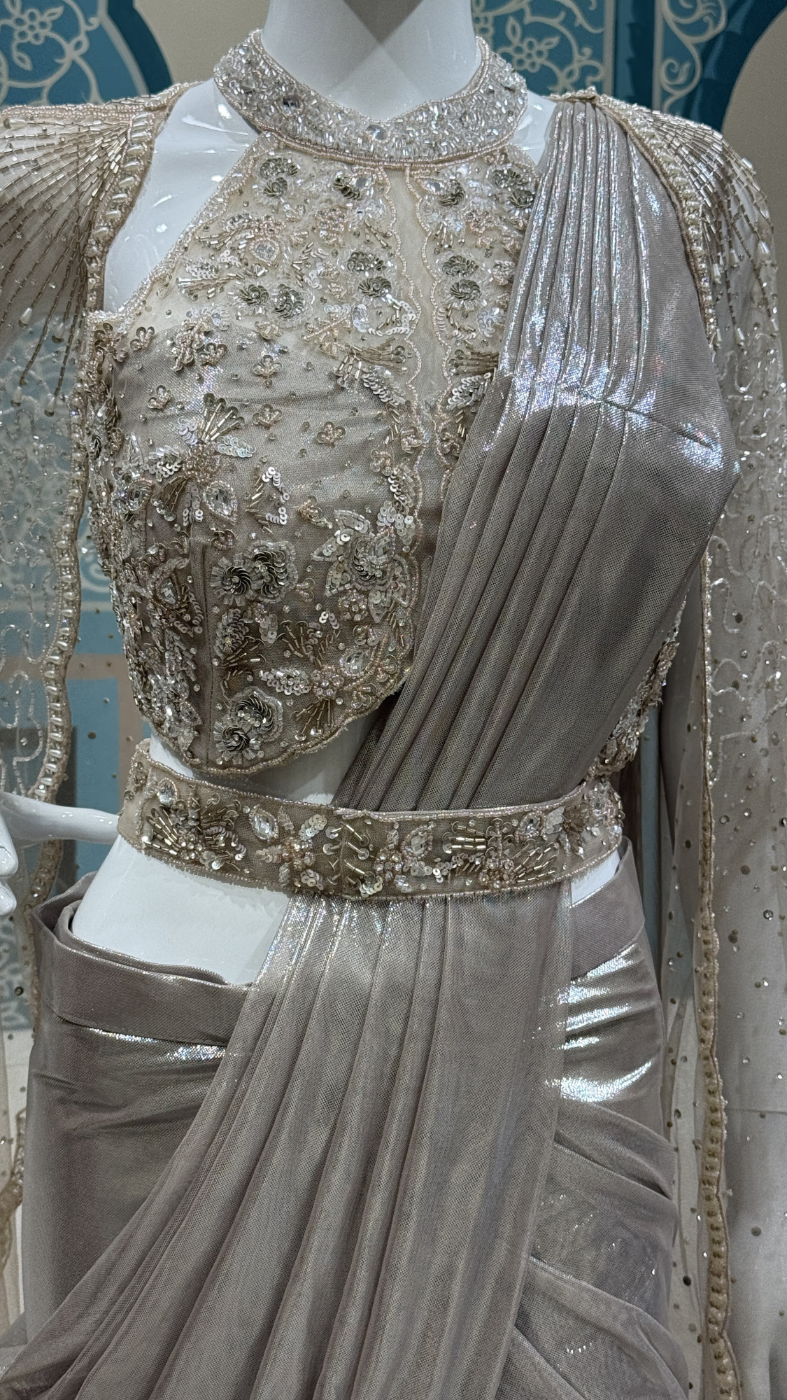 This contemporary saree-style dress is crafted in a subtle metallic silver hue with a beautifully draped silhouette. The embellished blouse showcases detailed sequin and bead embroidery with structured shoulders and sheer, embroidered sleeves. The soft, flowy drape adds movement and grace, while the embellished waistband enhances the overall fit. A perfect blend of modern glamour and timeless elegance, ideal for receptions, cocktail parties, and evening celebrations.