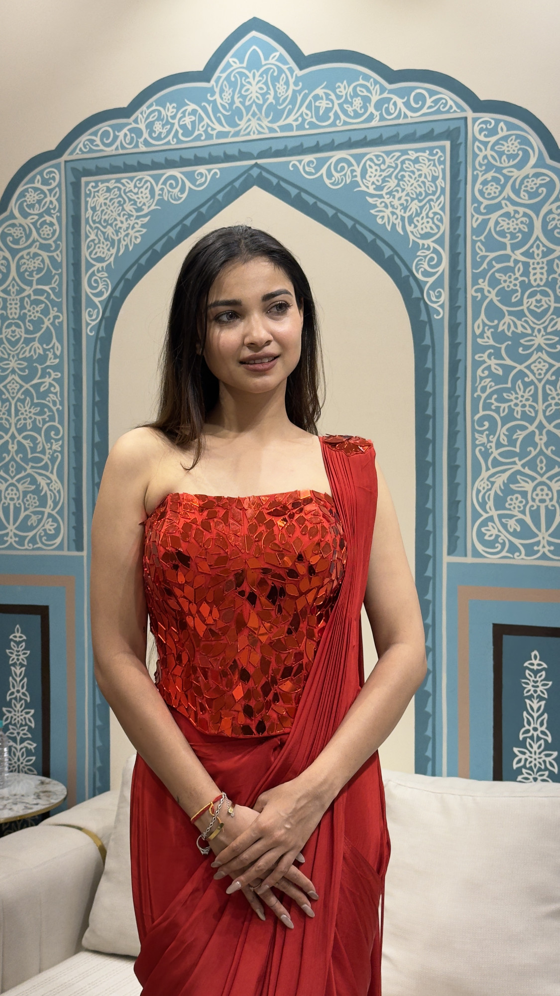 This elegant red saree dress features a structured strapless corset blouse adorned with reflective mirror detailing that adds a glamorous edge. The soft, flowy drape creates a graceful silhouette, while the single-shoulder pallu enhances its modern appeal. A perfect blend of contemporary design and festive charm.