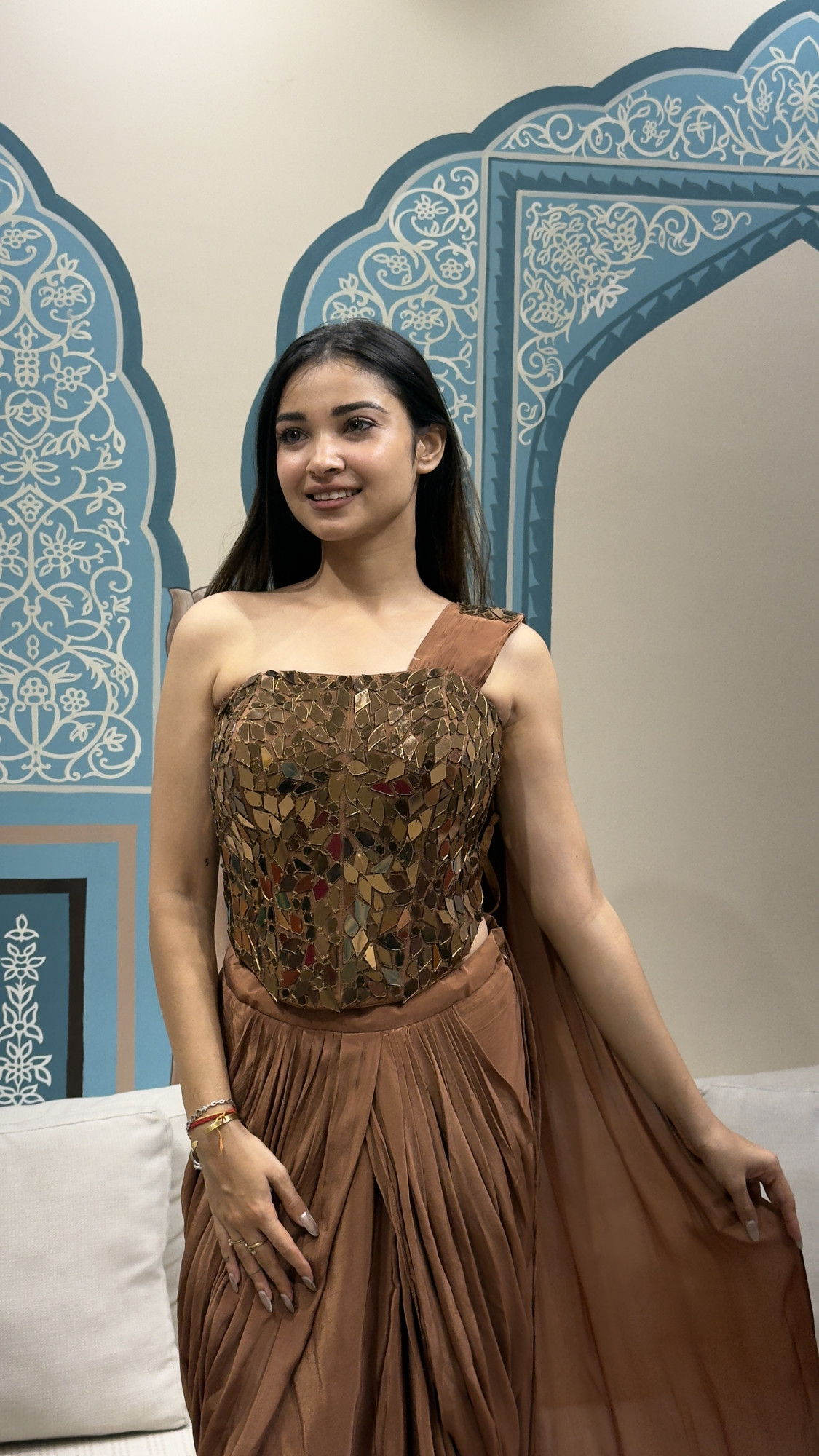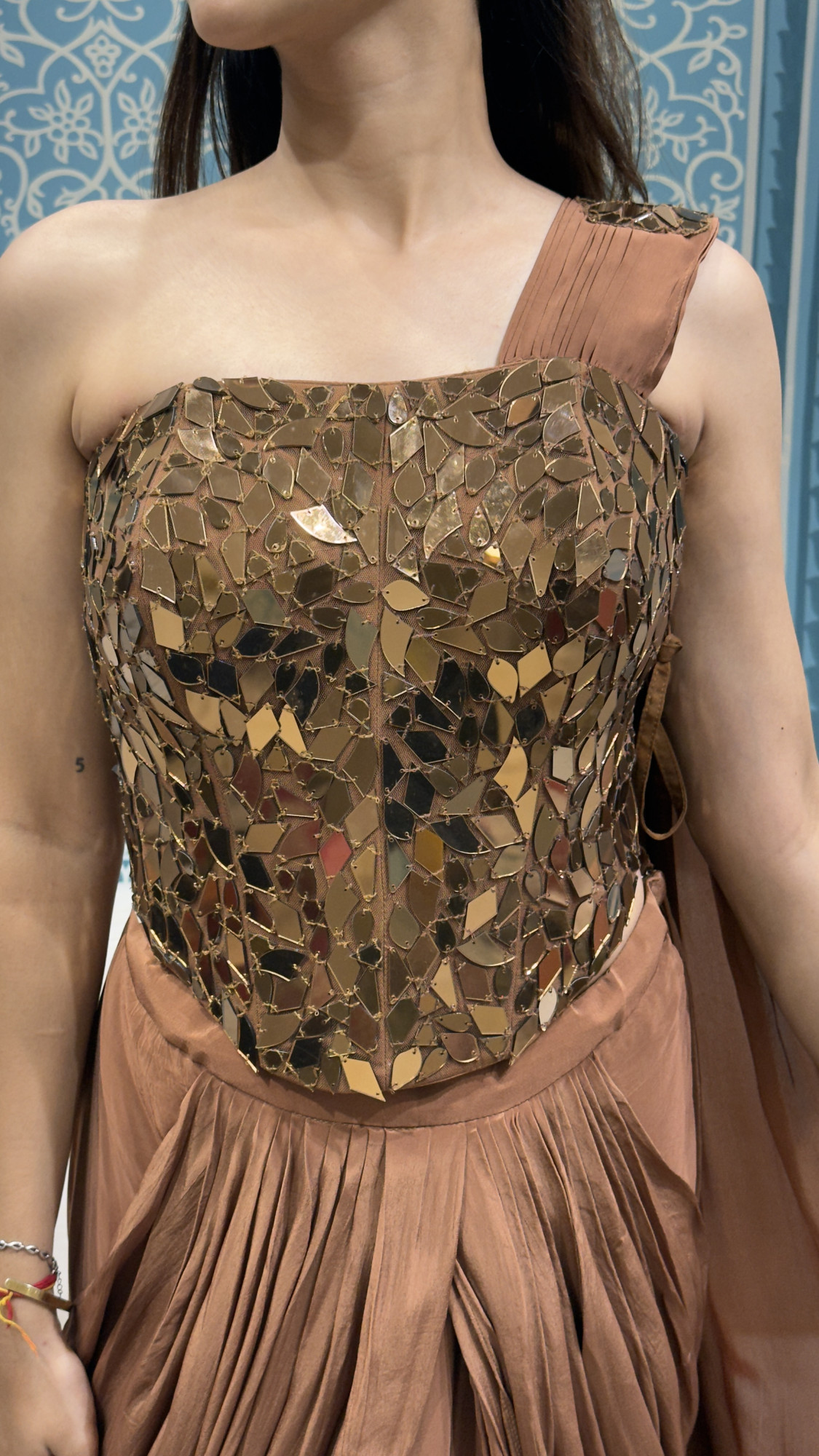 This elegant ensemble showcases a sculpted one-shoulder corset adorned with intricate mirror work, paired with a fluid pleated drape in a warm brown tone. The soft fall of the fabric balances the bold shimmer of the blouse, creating a graceful yet striking silhouette—perfect for cocktail nights, festive gatherings, or modern wedding celebrations.