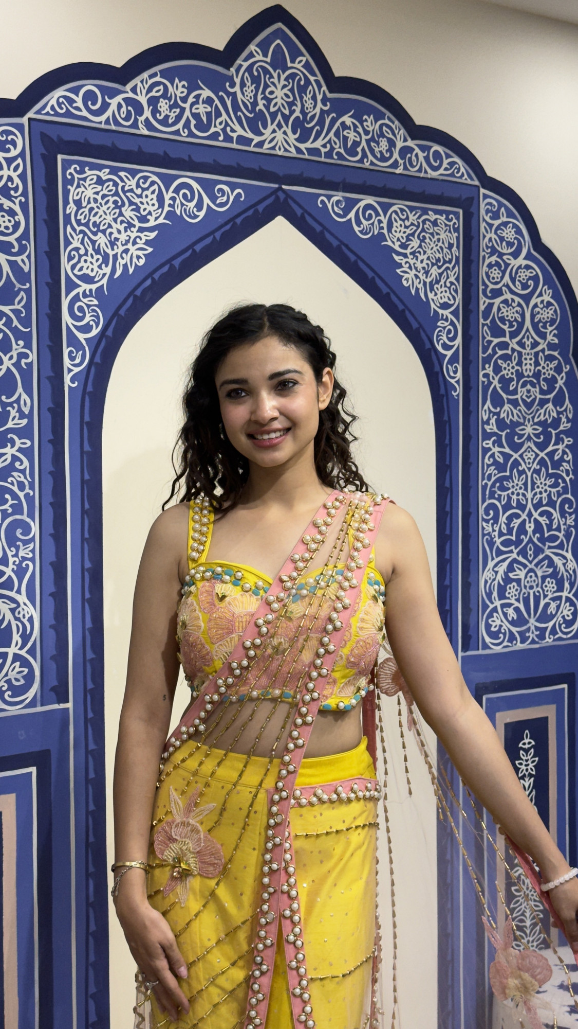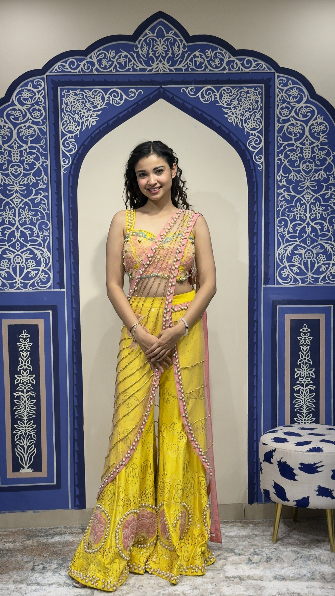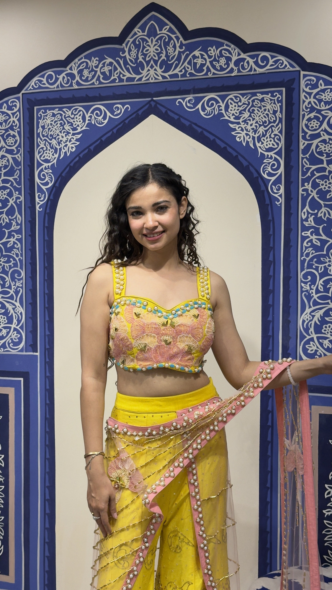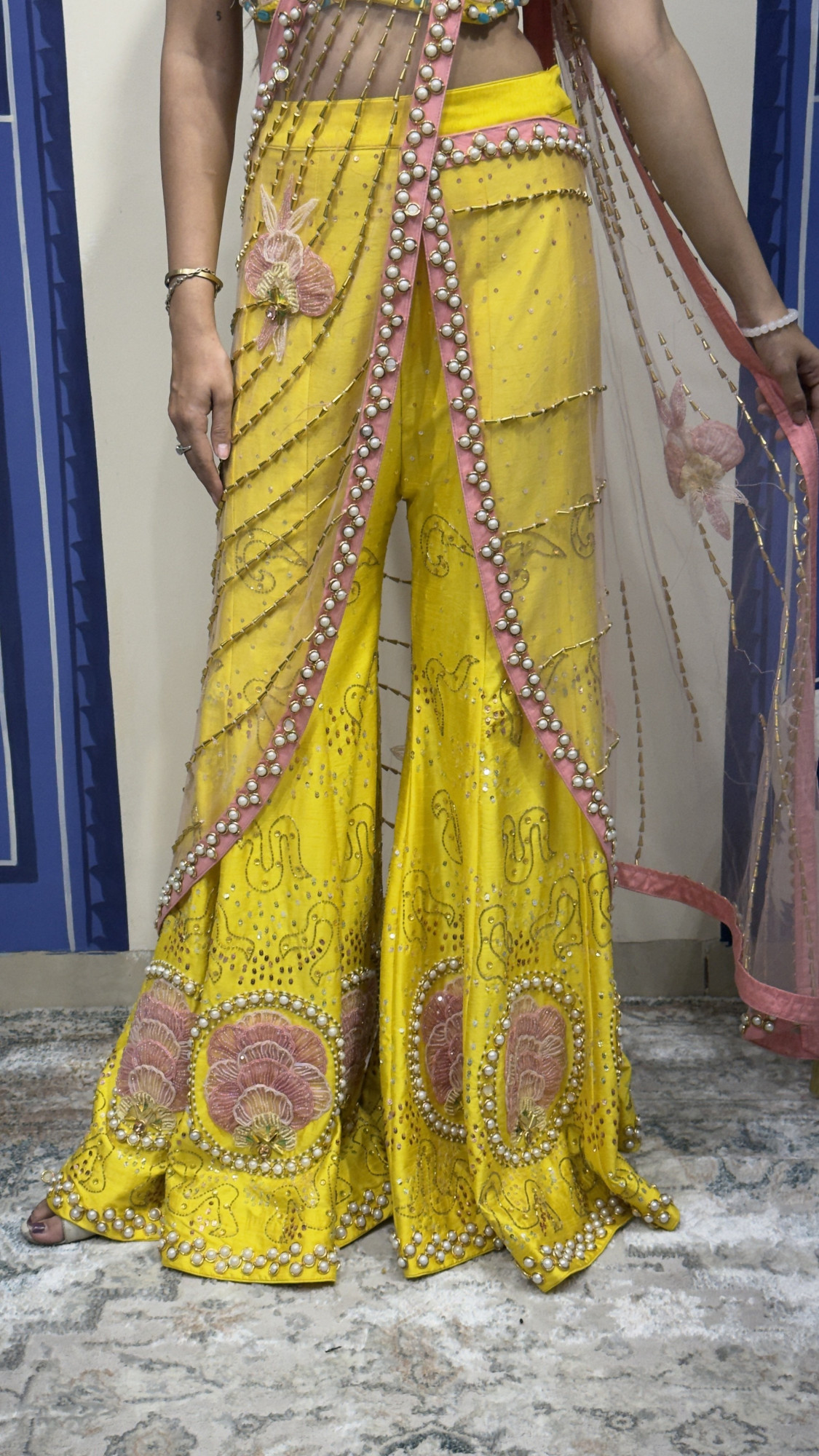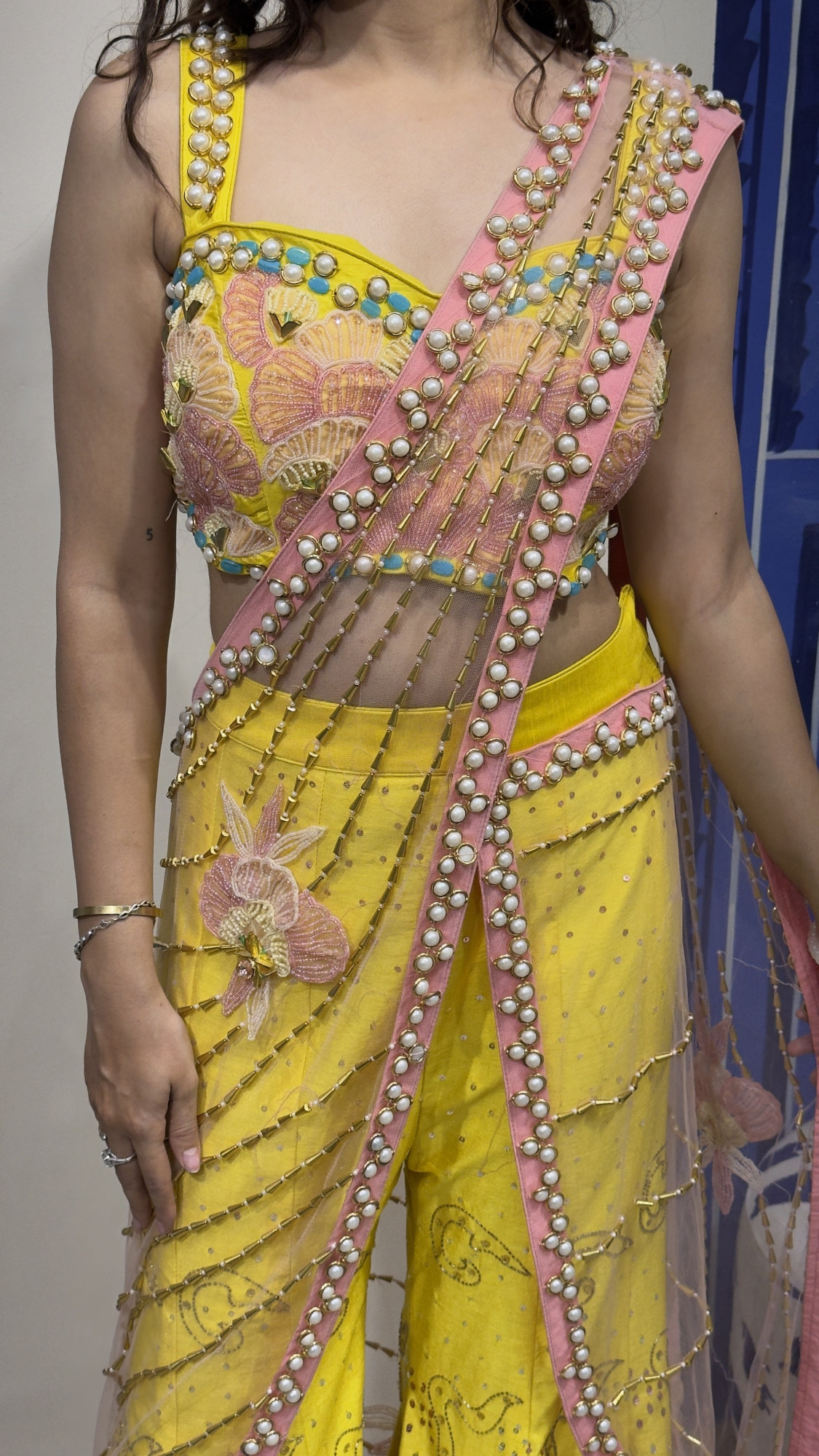 This eye- catching ensemble showcases a bright yellow base paired with a beautifully embroidered blouse featuring pastel floral motifs and pearl embellishments. The outfit is styled with a modern draped silhouette accented by a soft pink net drape adorned with pearl and bead detailing. Intricate embroidery and delicate embellishments along the pants create a graceful flow, making this outfit perfect for haldi ceremonies, festive celebrations, or daytime wedding events.