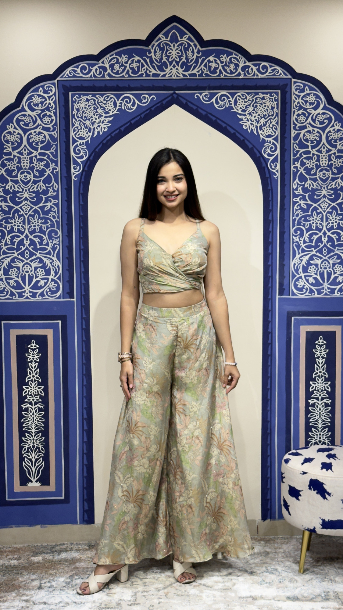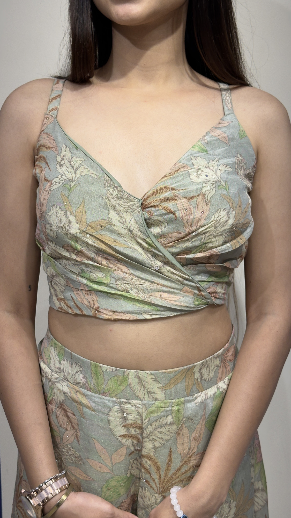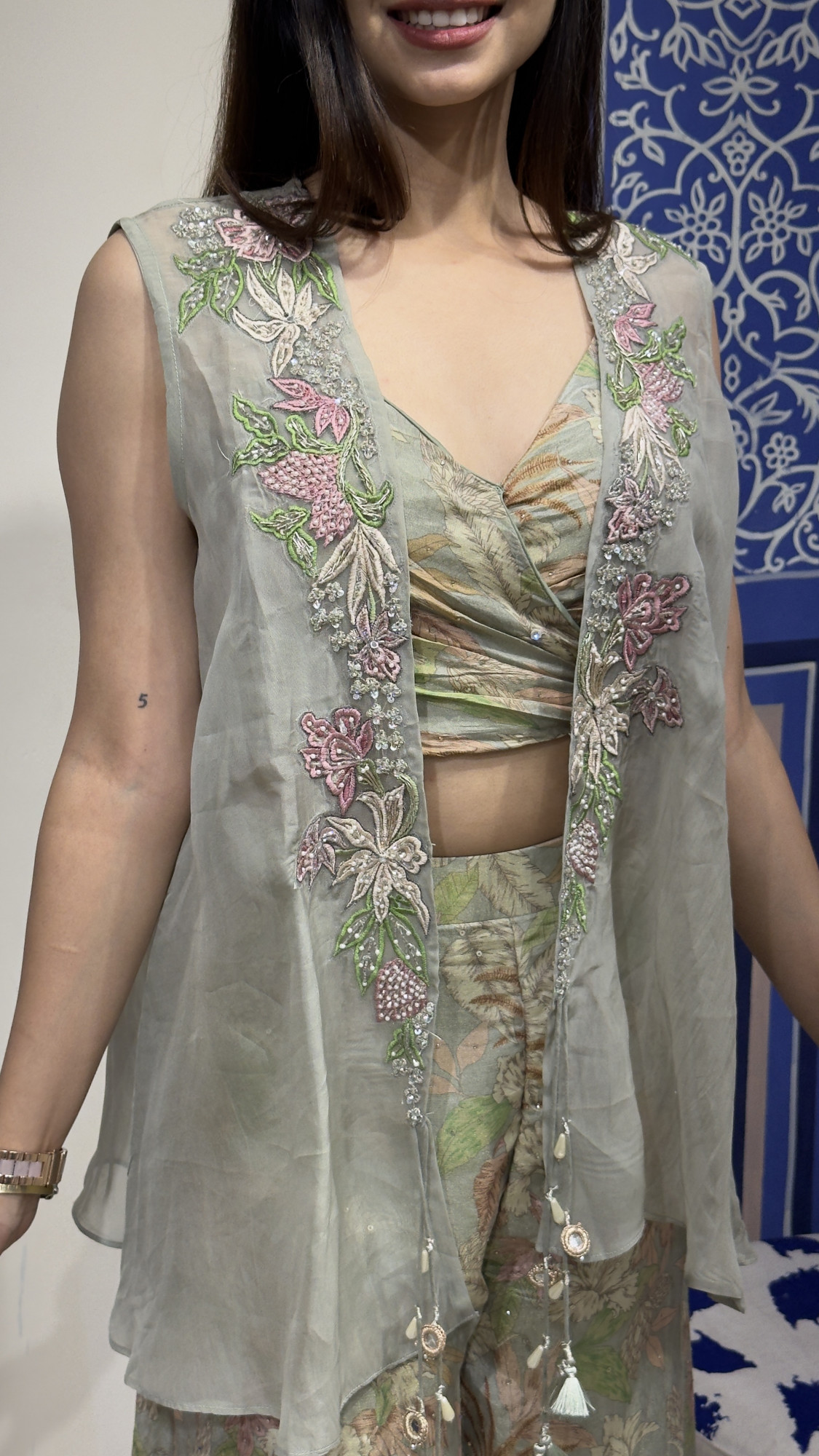 This graceful ensemble showcases a delicate pastel green base adorned with subtle floral prints that create a fresh and feminine appeal. The wrap- style crop top with thin straps offers a flattering silhouette, perfectly paired with wide- leg palazzo pants that provide effortless flow and comfort. Completing the look is a sheer organza overlay jacket beautifully embellished with floral embroidery and tassel accents, adding texture and elegance to the outfit. The soft color palette and airy design make this outfit ideal for daytime celebrations, festive gatherings, and summer wedding events, blending modern sophistication with subtle traditional charm.