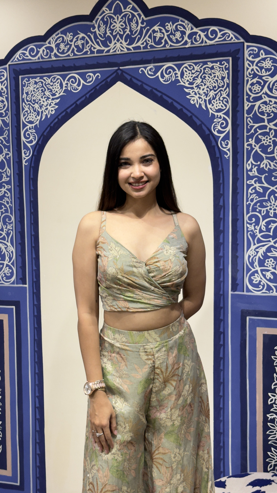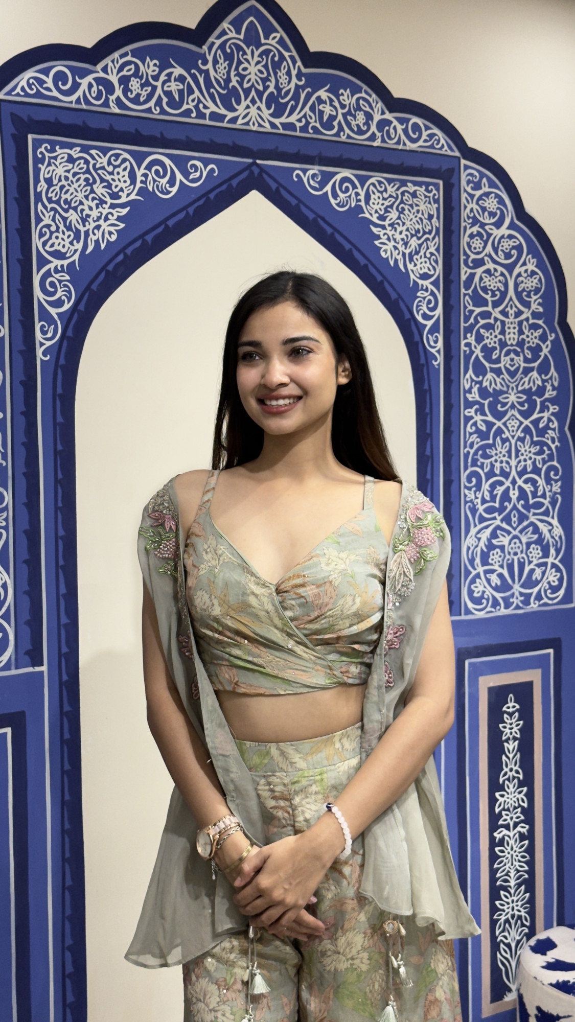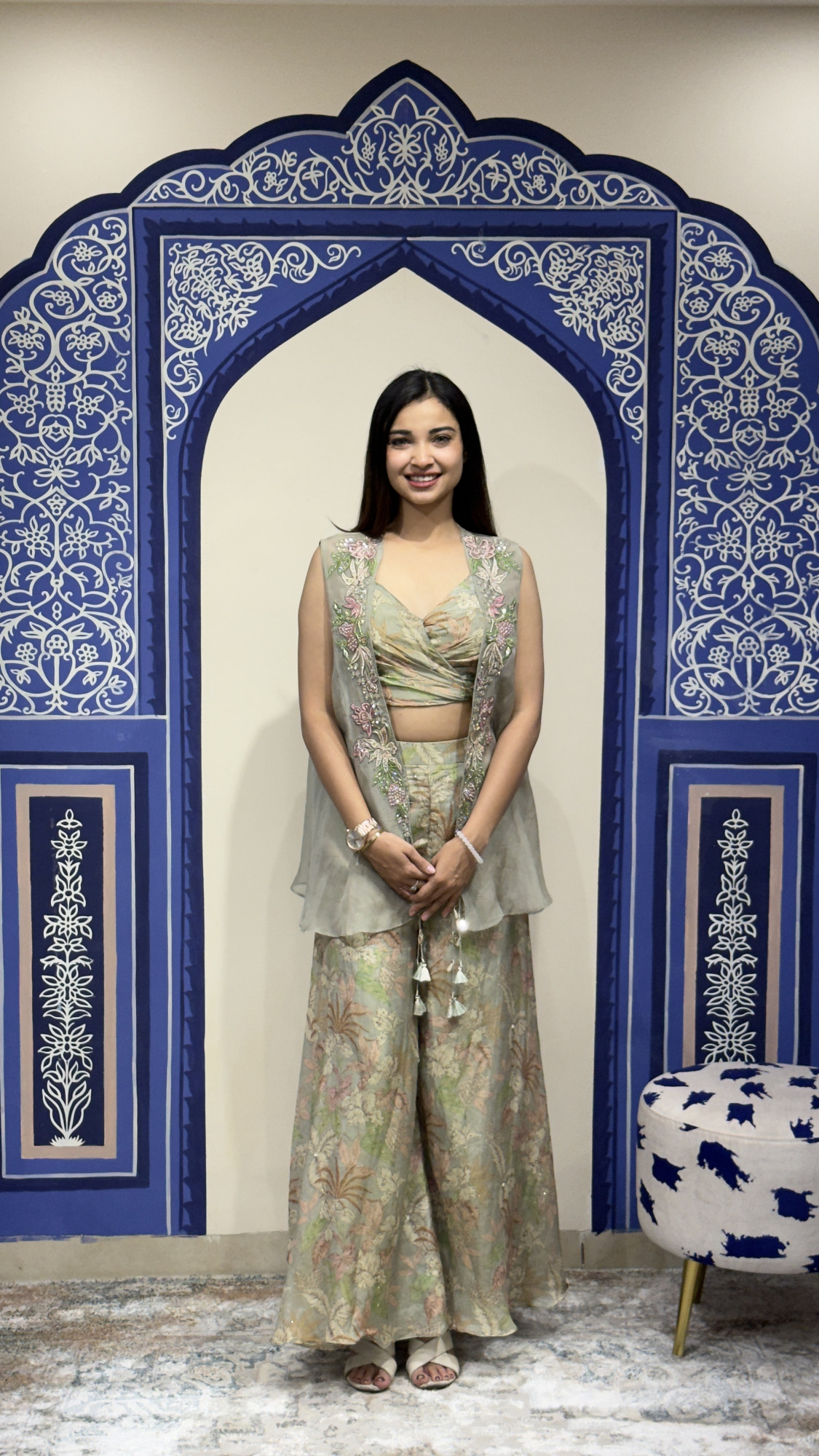 This graceful ensemble showcases a delicate pastel green base adorned with subtle floral prints that create a fresh and feminine appeal. The wrap- style crop top with thin straps offers a flattering silhouette, perfectly paired with wide- leg palazzo pants that provide effortless flow and comfort. Completing the look is a sheer organza overlay jacket beautifully embellished with floral embroidery and tassel accents, adding texture and elegance to the outfit. The soft color palette and airy design make this outfit ideal for daytime celebrations, festive gatherings, and summer wedding events, blending modern sophistication with subtle traditional charm.