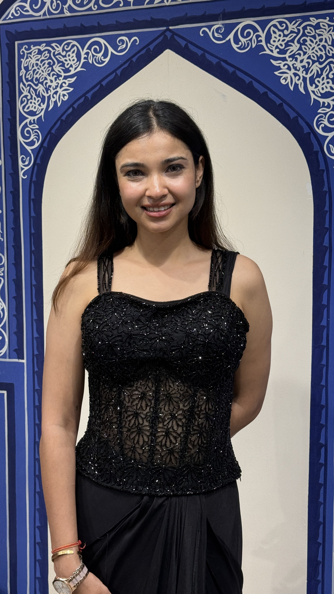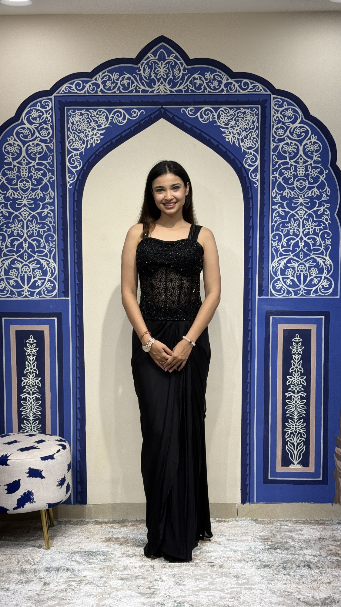 This elegant black saree combines modern sophistication with timeless charm. The blouse features a structured corset-style design with intricate bead and sequin embroidery on sheer panels, creating a striking and sculpted look. The saree is crafted from soft flowing fabric that drapes beautifully, adding effortless elegance to the silhouette. A lightweight chiffon pallu enhances the outfit with graceful movement, making it perfect for cocktail nights, receptions, and festive occasions.