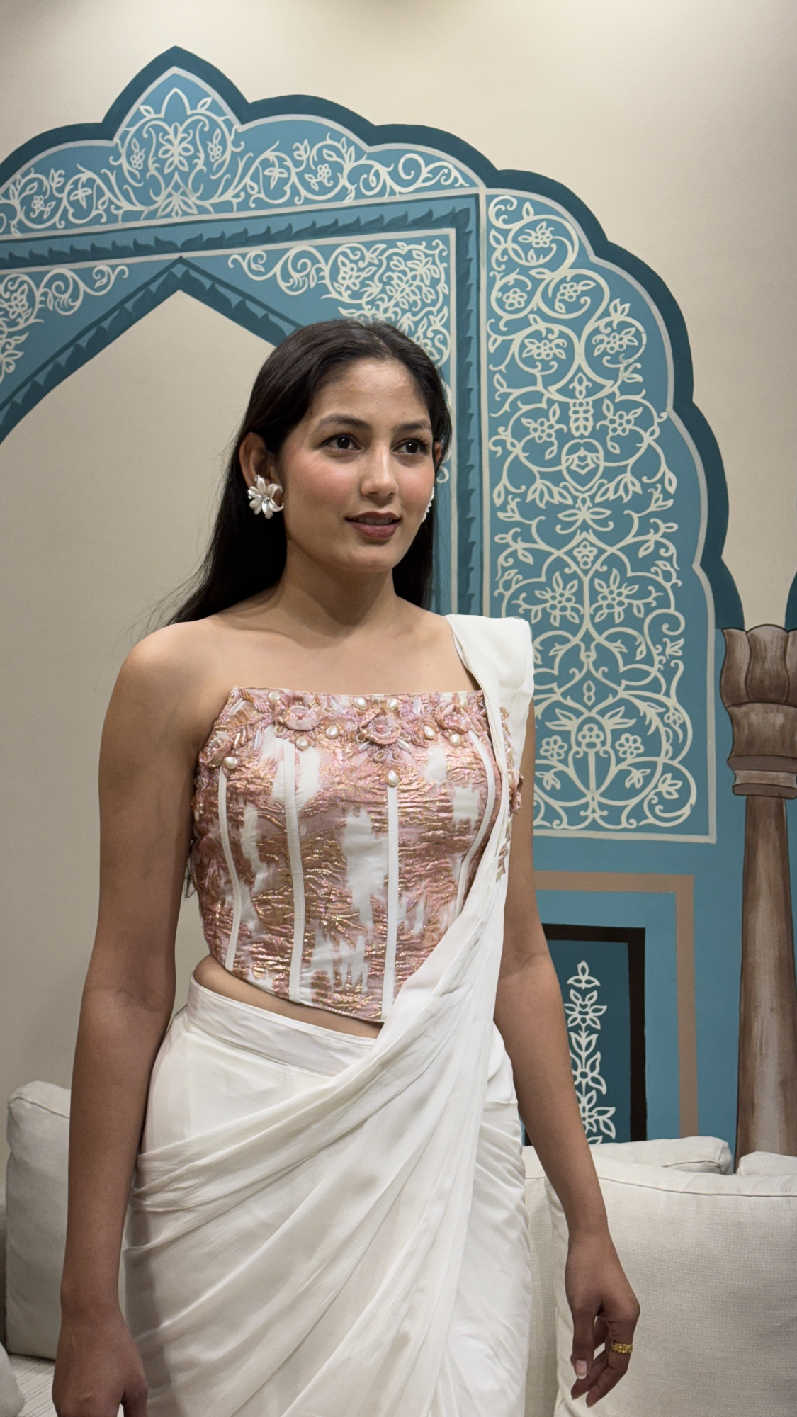 This stunning ready-to-wear saree features a soft ivory flowy drape with neatly pre-pleated detailing for a graceful, effortless fall. The highlight of the look is the structured corset-style blouse in a gorgeous blush and rose-gold tone, richly adorned with 3D floral embroidery, pearl accents, and shimmer detailing. Finished with a chic one-shoulder pallu styling, this outfit creates a contemporary saree silhouette that feels festive, feminine, and ultra-luxurious—ideal for cocktail nights, engagement functions, receptions, and modern wedding celebrations.